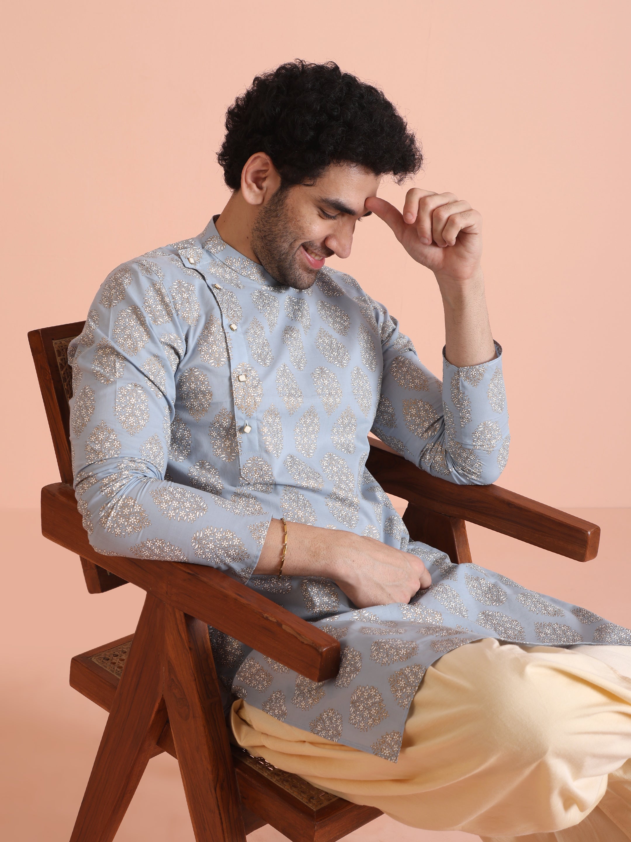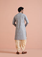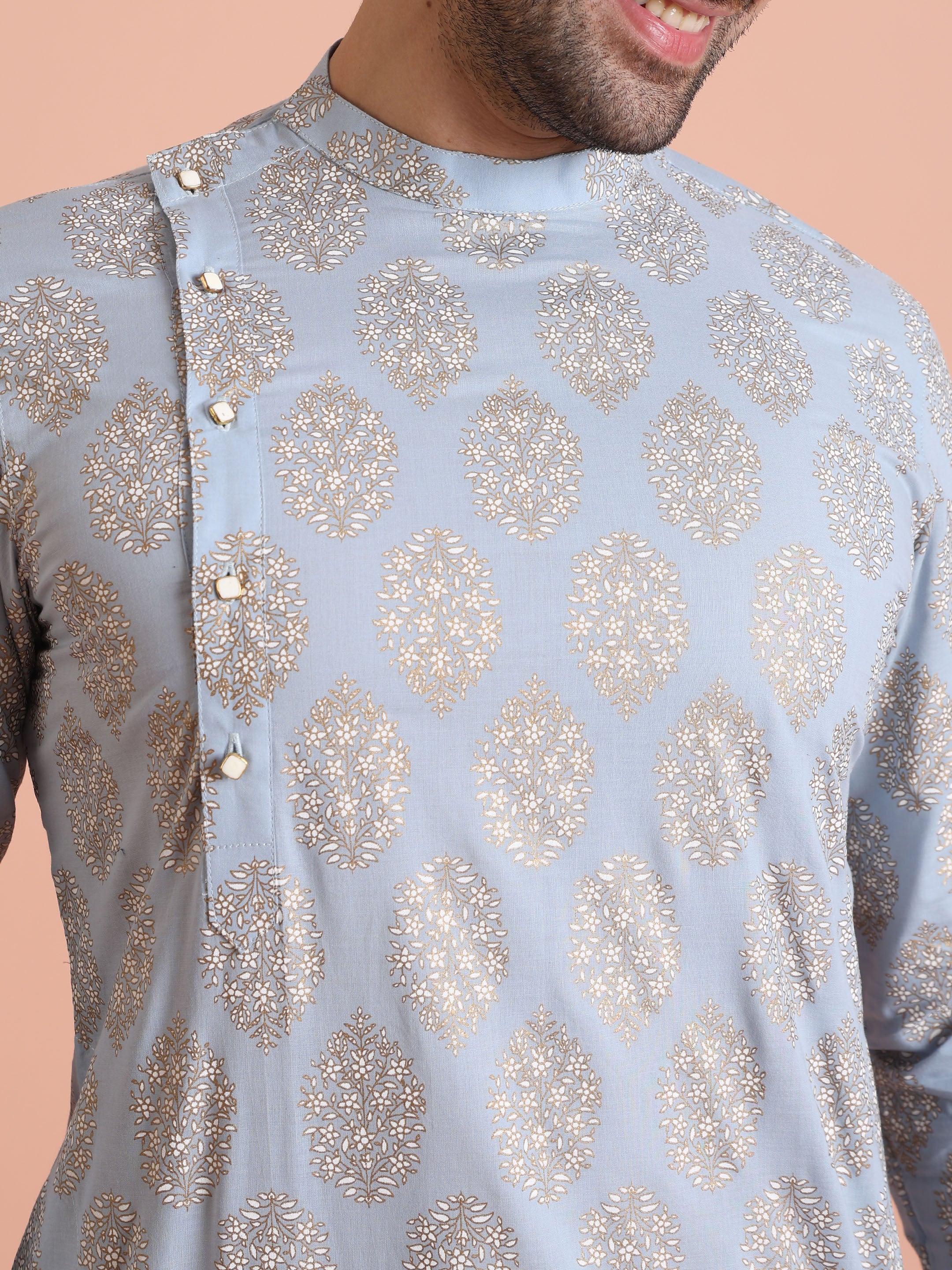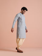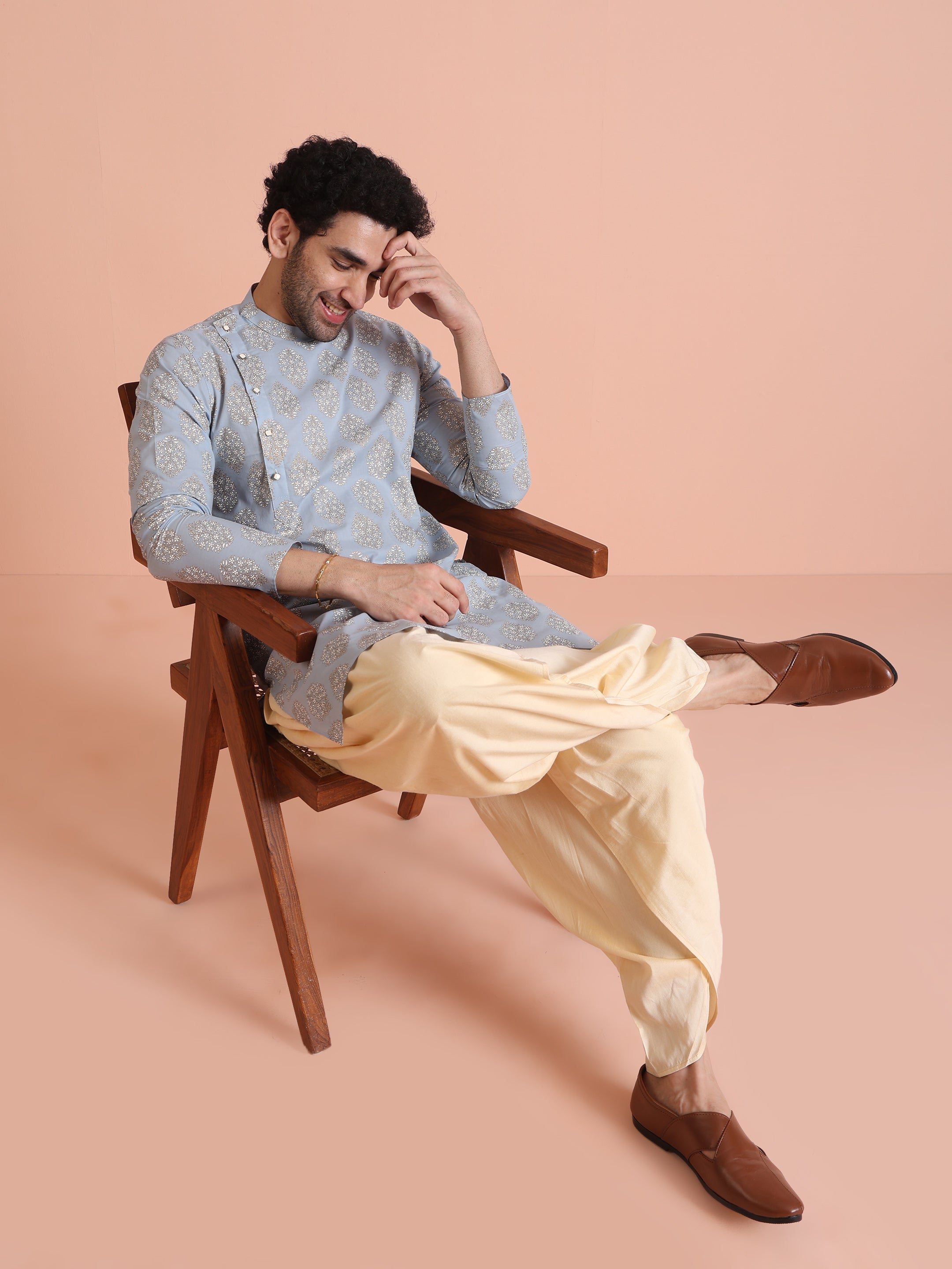 Dress to impress with our Blue Printed Kurta & Dhoti set. Made from a comfortable cotton blend, this regular-fit ensemble is perfect for festive events, blending modern prints with traditional styles.