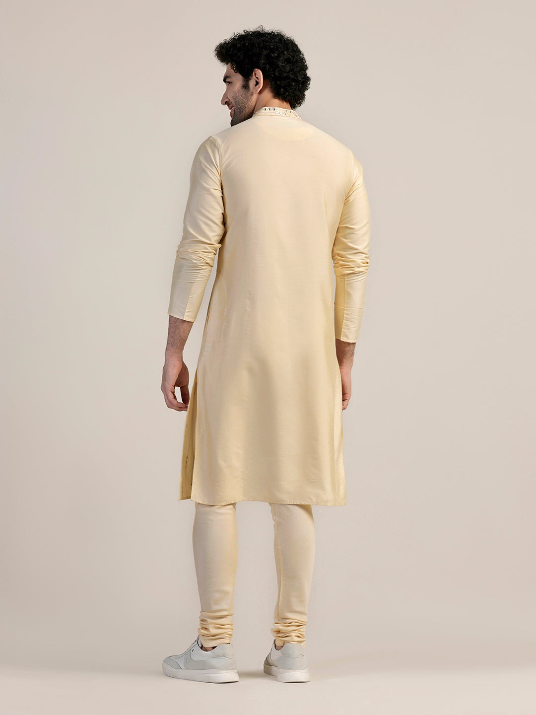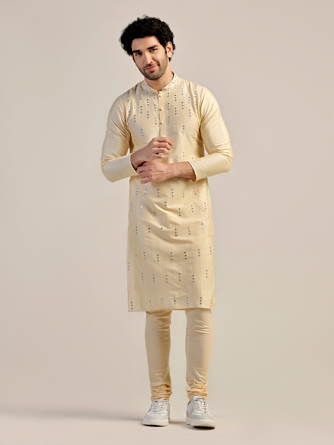 This Cream Kurta Churidar Set is a yes for all your casual occasions. The Kurta is of Cotton Blend which adds on to the defined and modern look. This set includes Bottomwear to complete your look