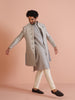 This Gold Kurta Indowestern Churidar Set is a yes for all your casual occasions. The Indowestern is of Jacquard which adds on to the defined and modern look. This set to complete your look