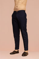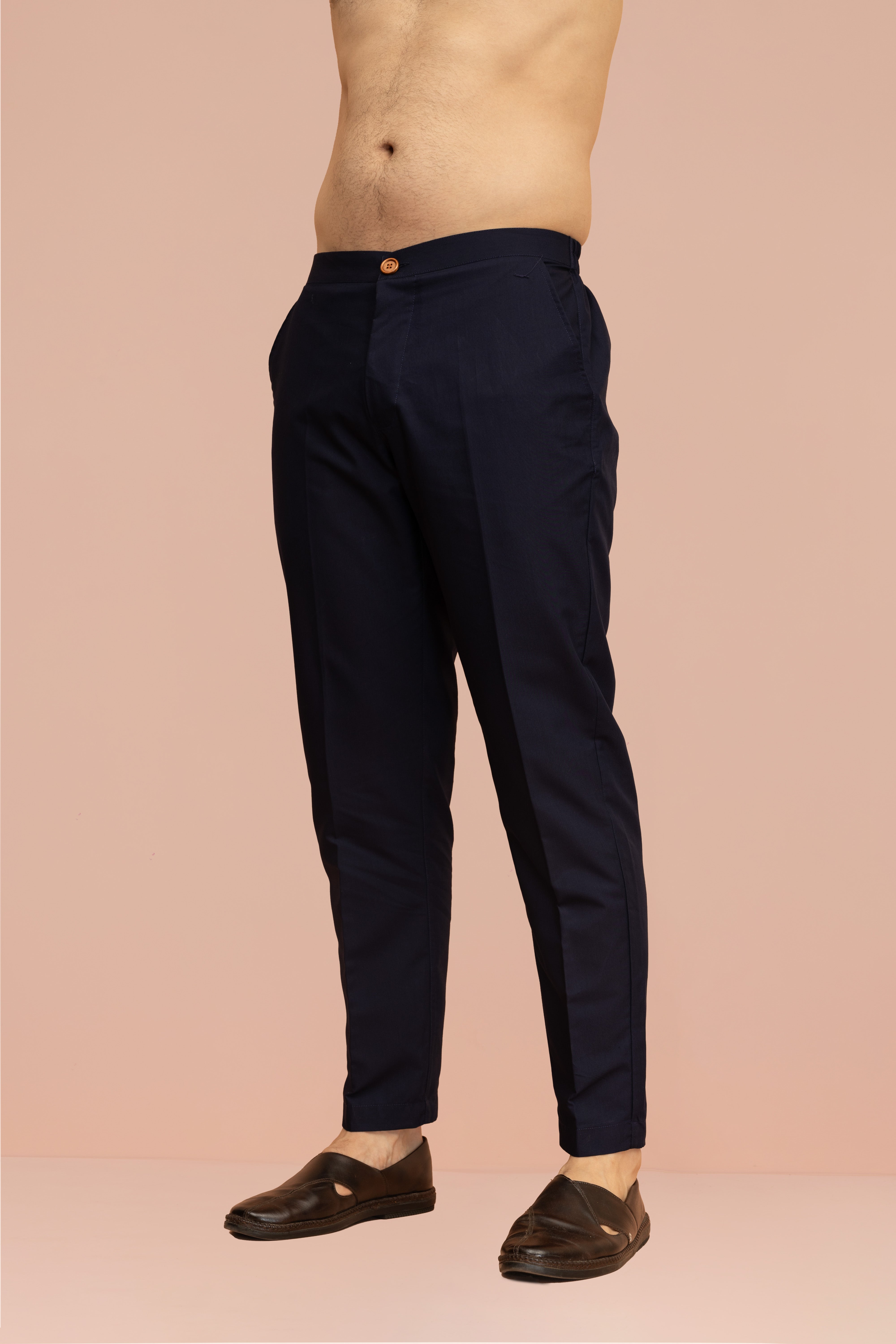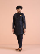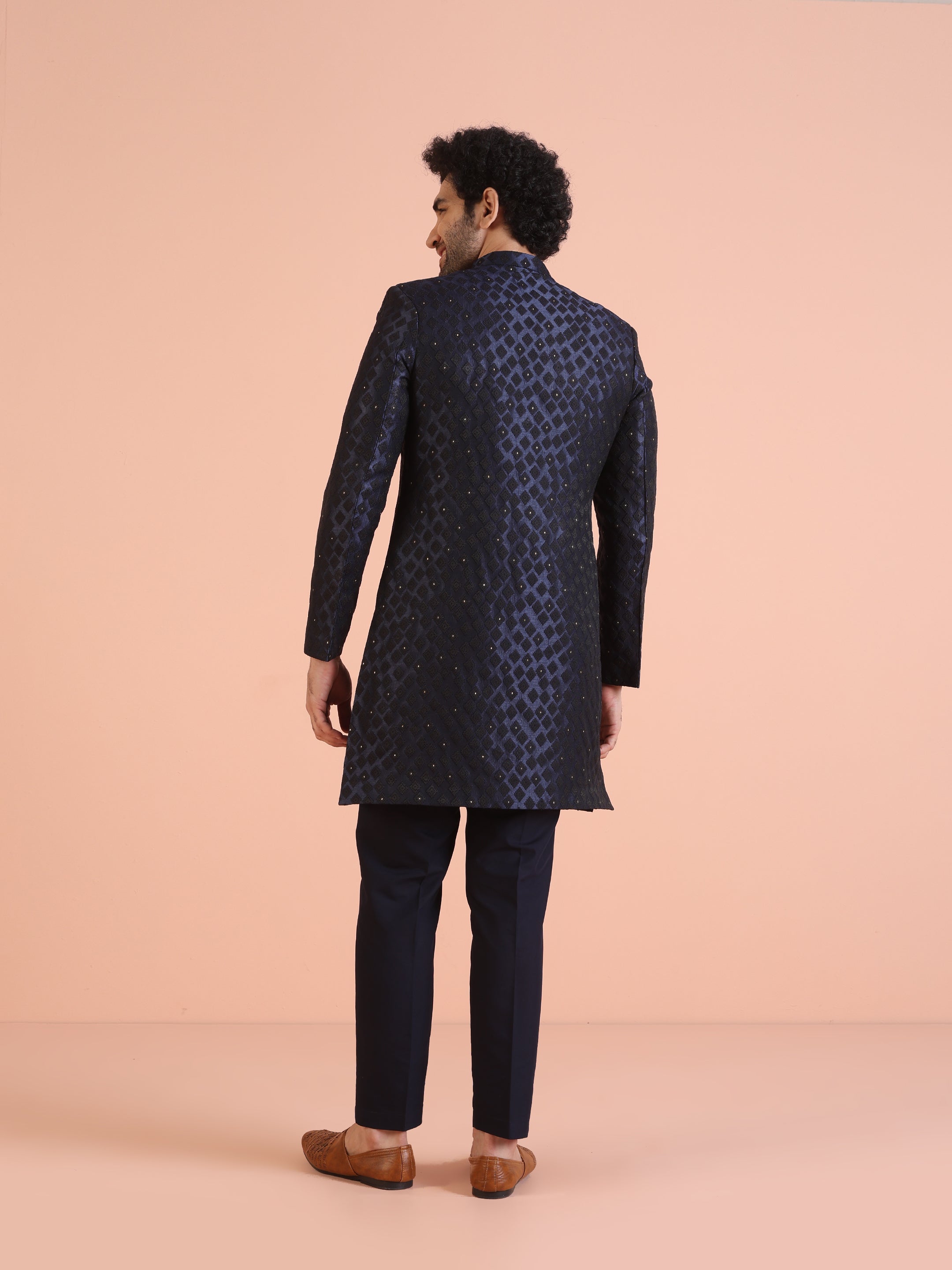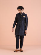 Embrace sophistication with this navy blue silk blend jacquard indowestern and trouser set. The textured pattern lends it a distinguished look for special occasions.