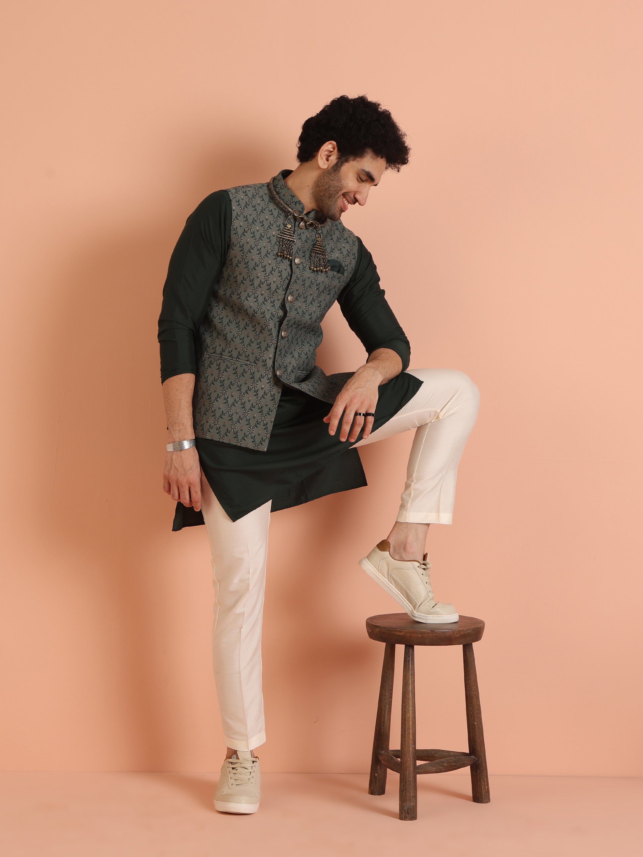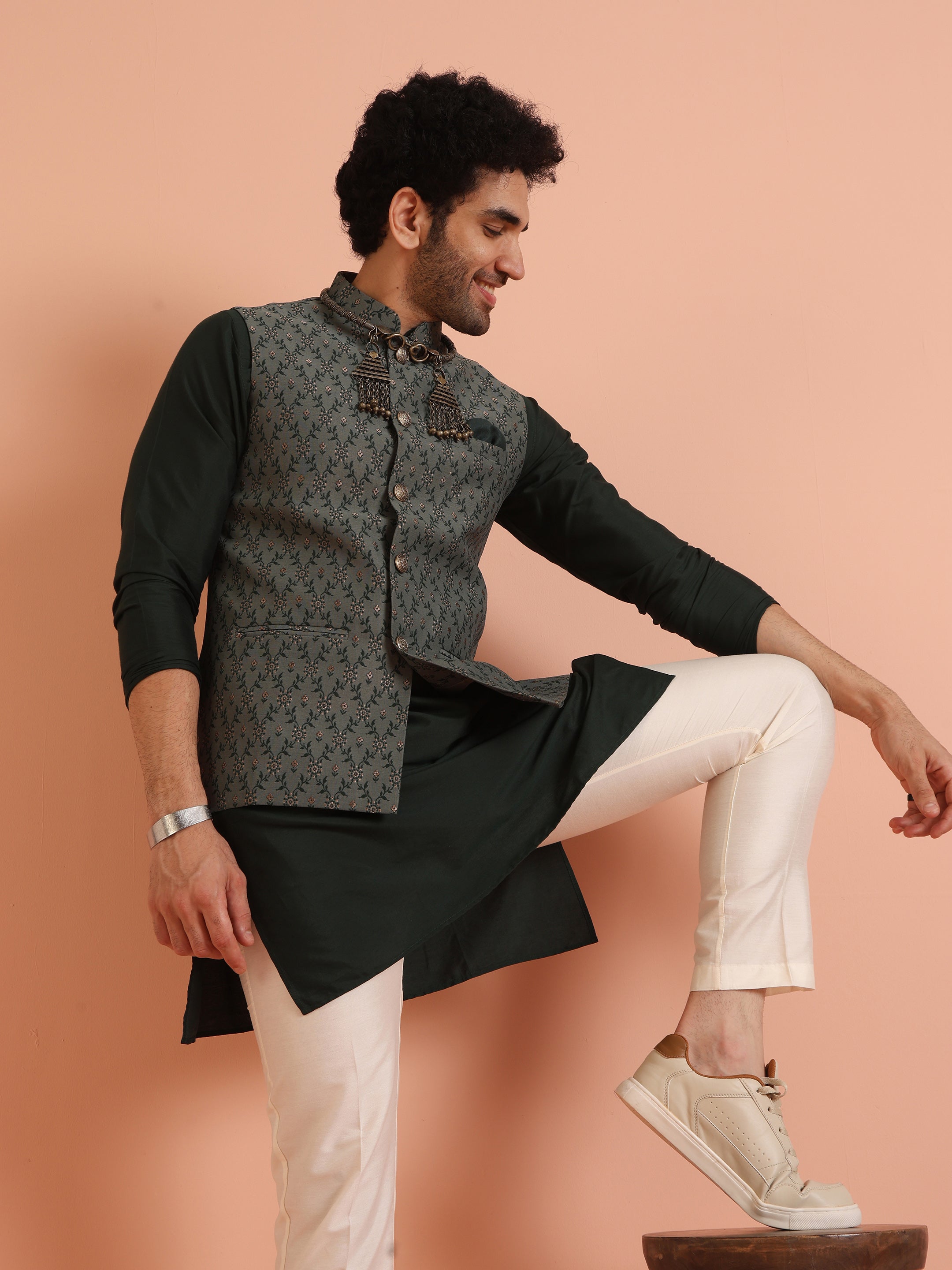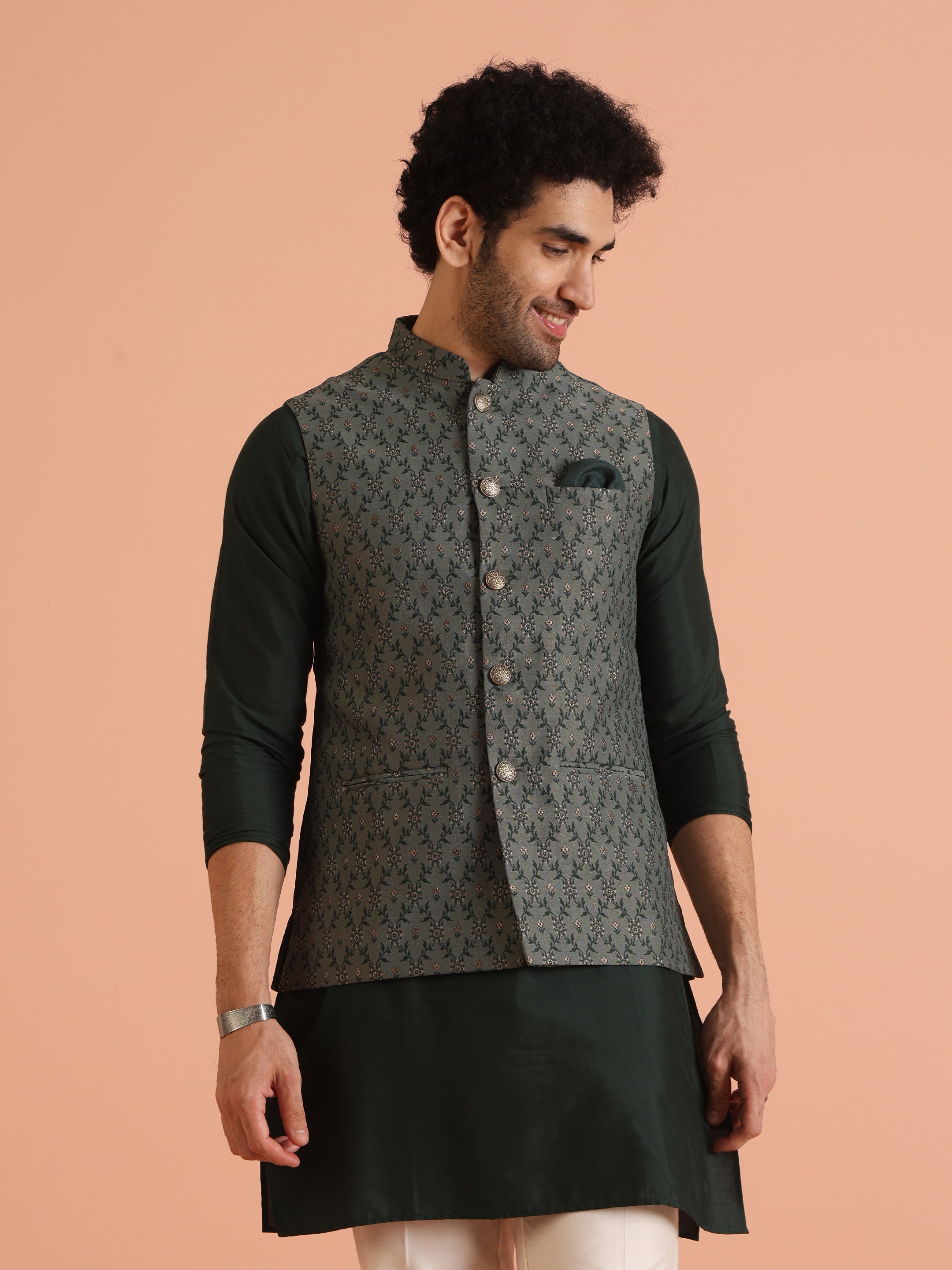 All it takes is a great kurta to set the tone, and this Men’s Green Silk Blend Kurta Jacket Trouser Set does just that. Featuring a woven design pattern, this set adds a touch of class and sophistication to any occasion. The breathable fabric ensures comfort, while the modern fit keeps you looking sharp. Whatever the occasion, this simple yet stylish piece must be a staple in your wardrobe.