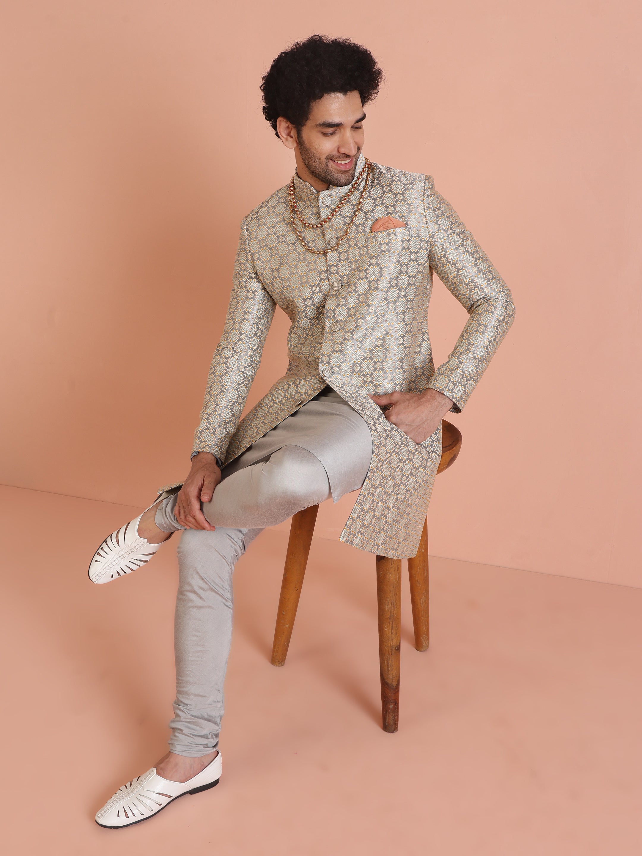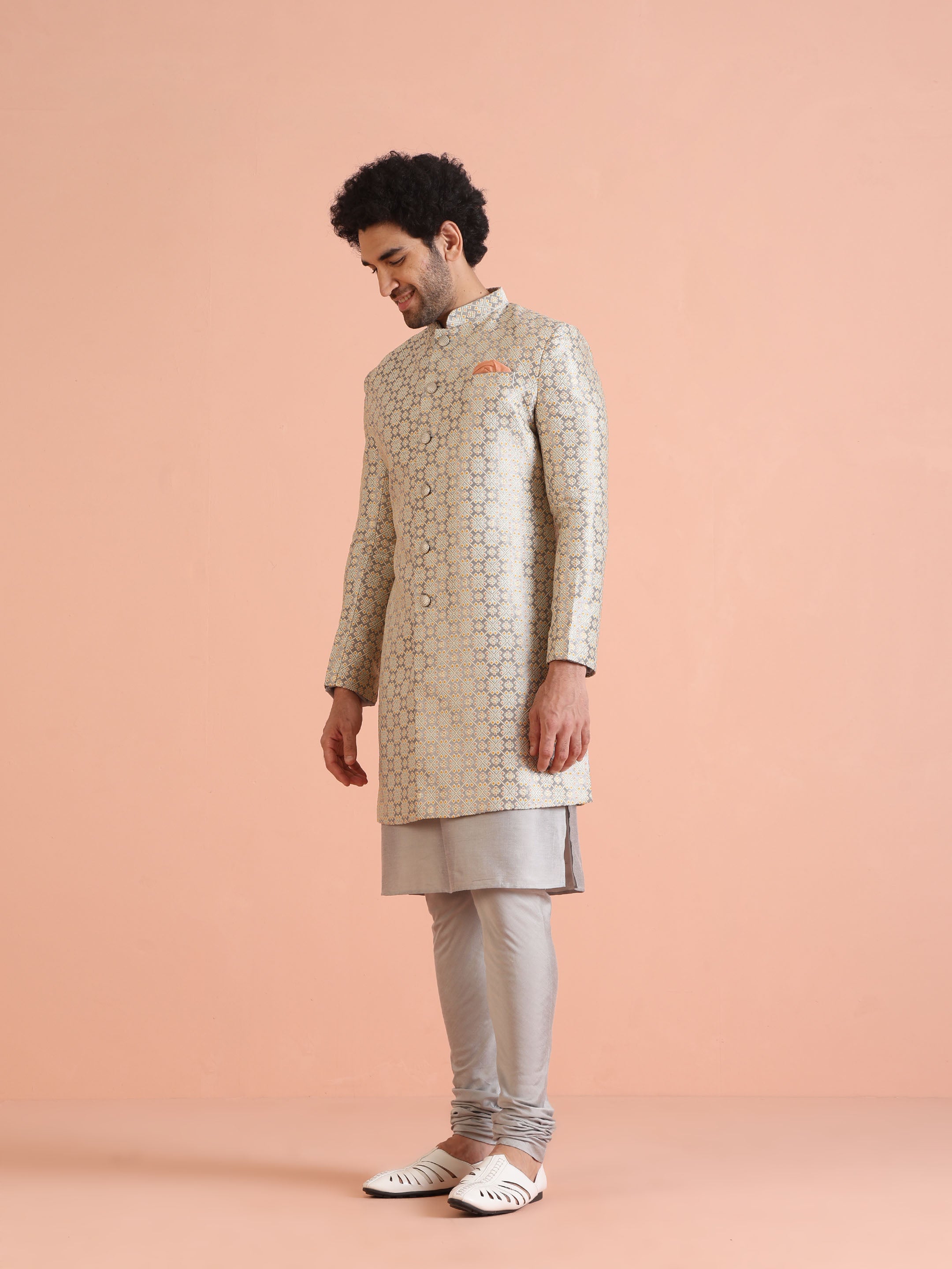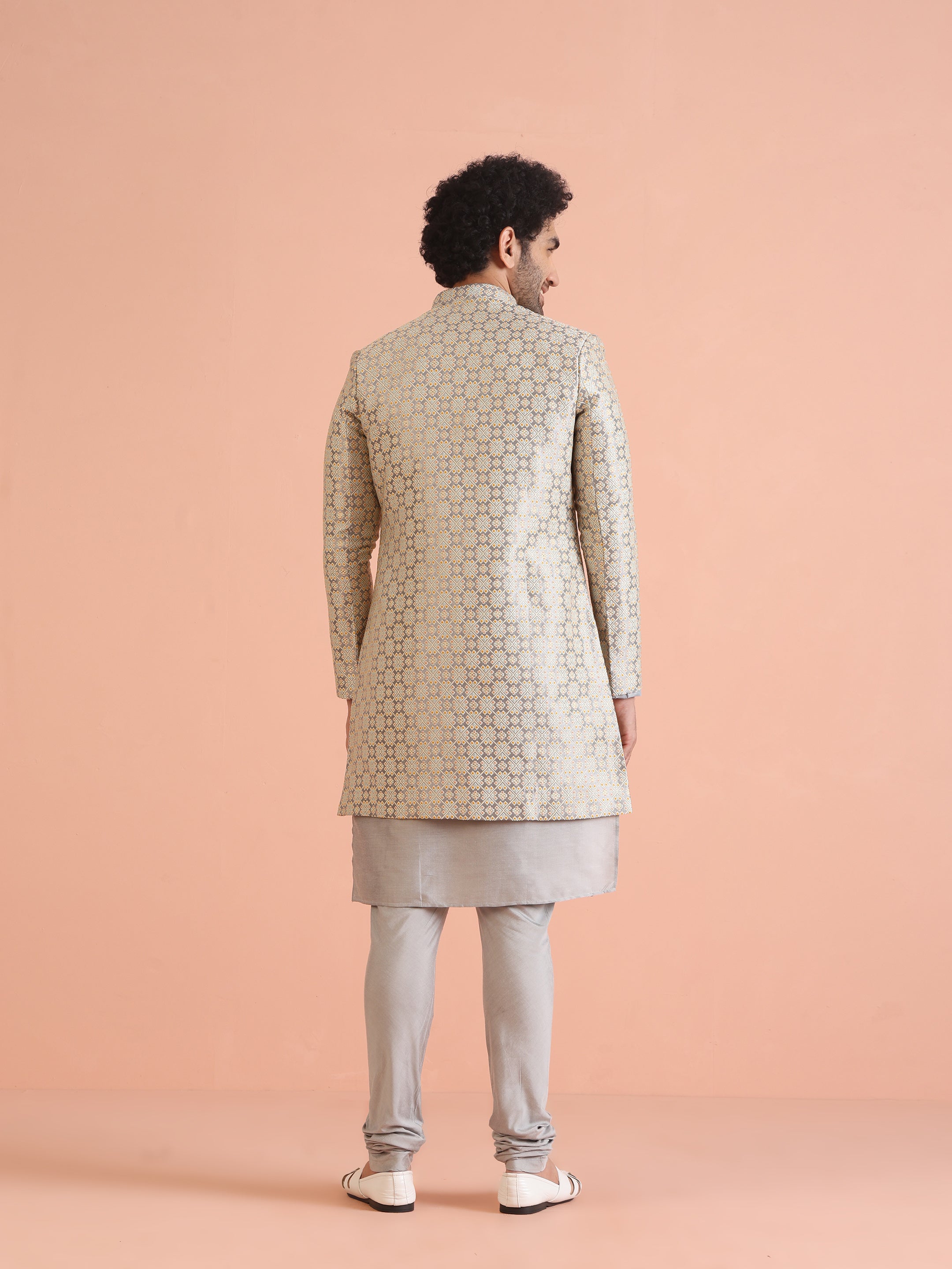 Experience classic elegance with this Kisah Men Grey Jacquard Kurta Indowestern Indowestern Churidar Set. The breathable fabric ensures comfort throughout the day. Ideal for festive events or casual wear.