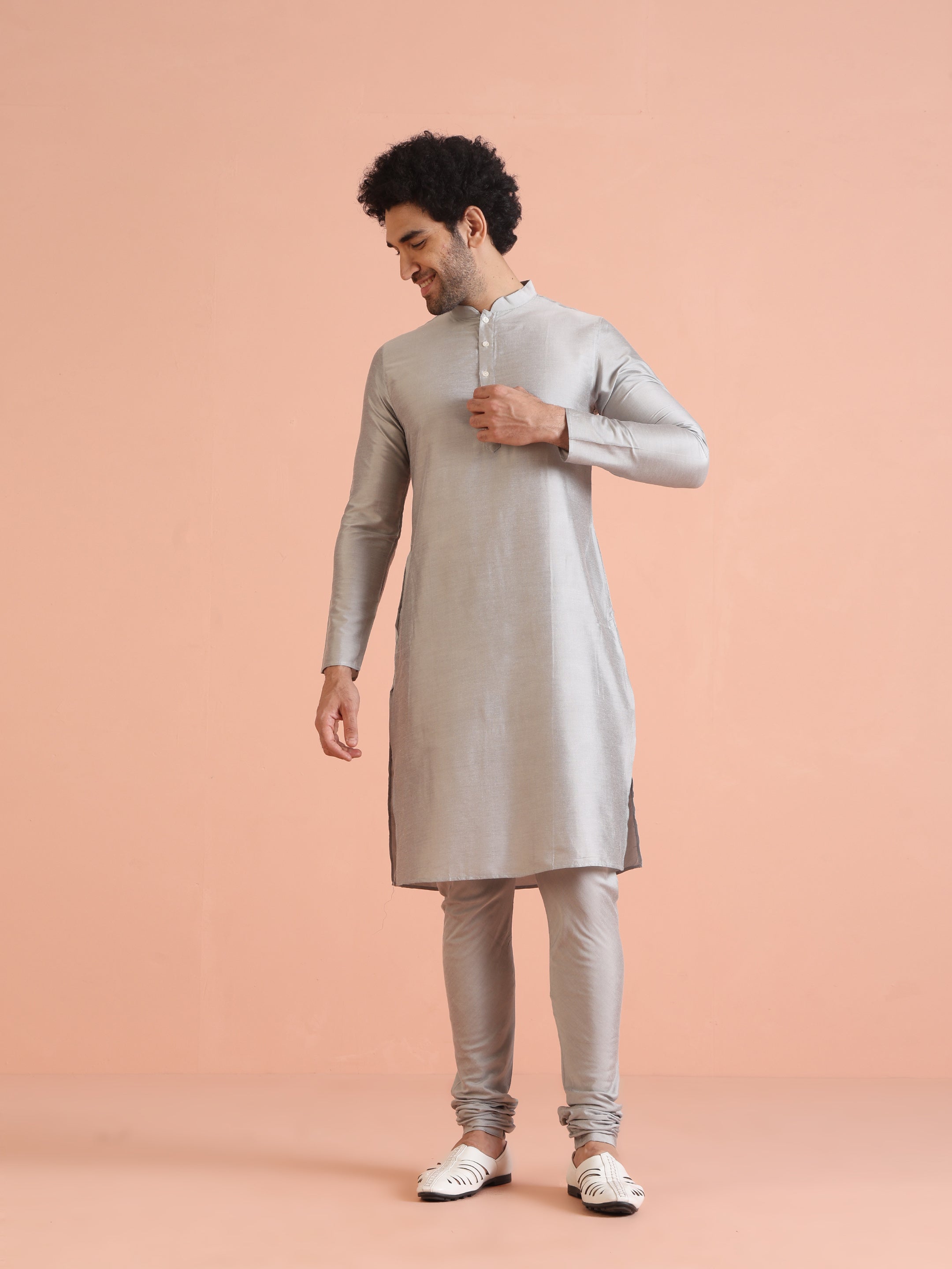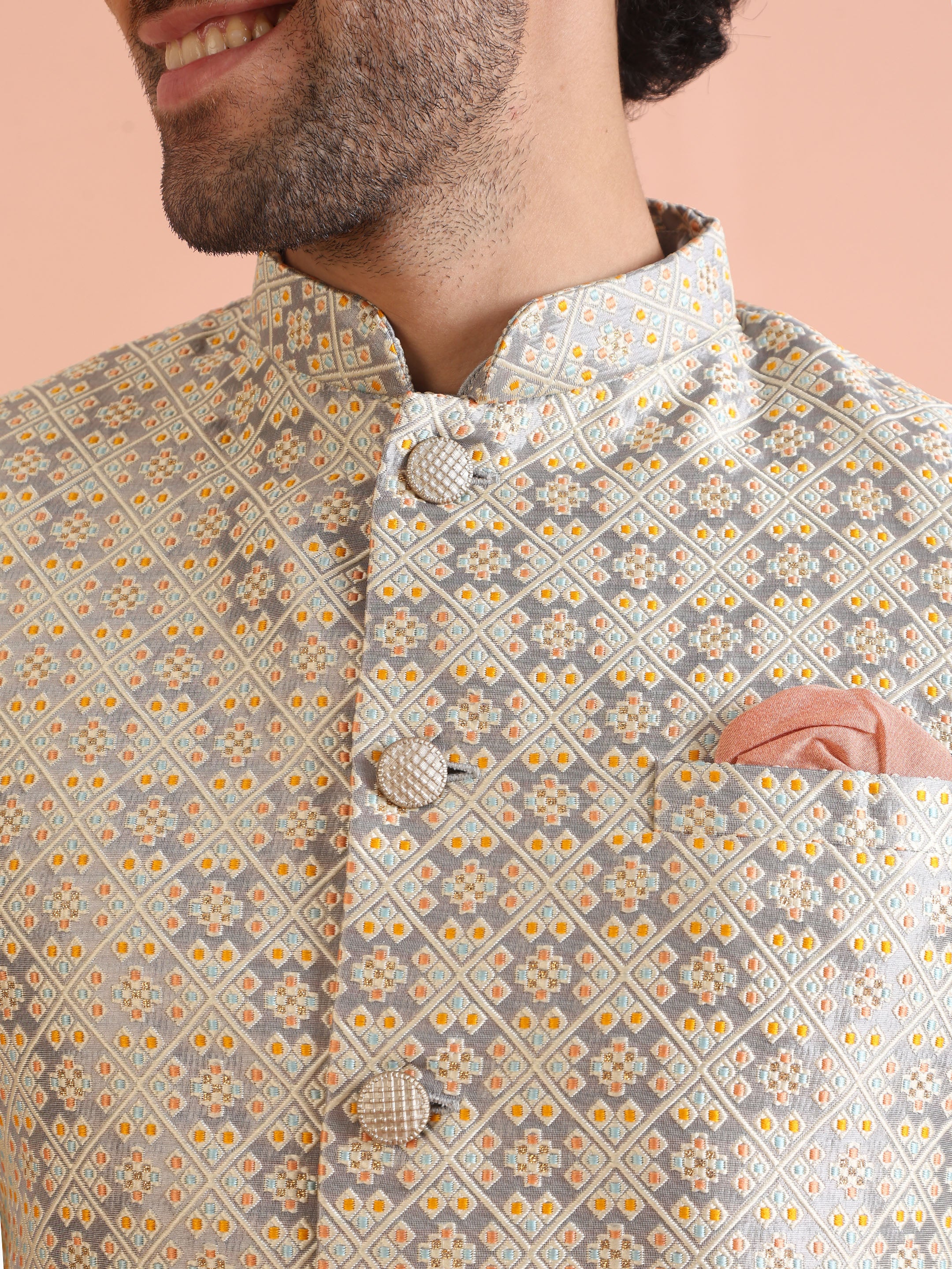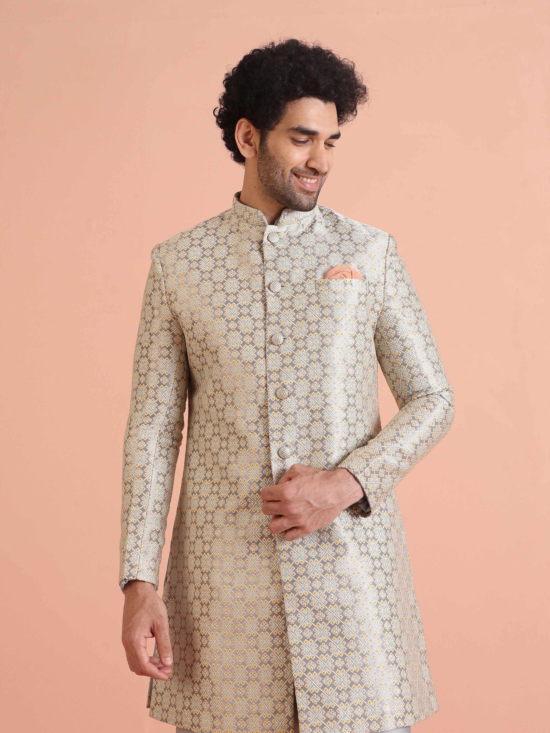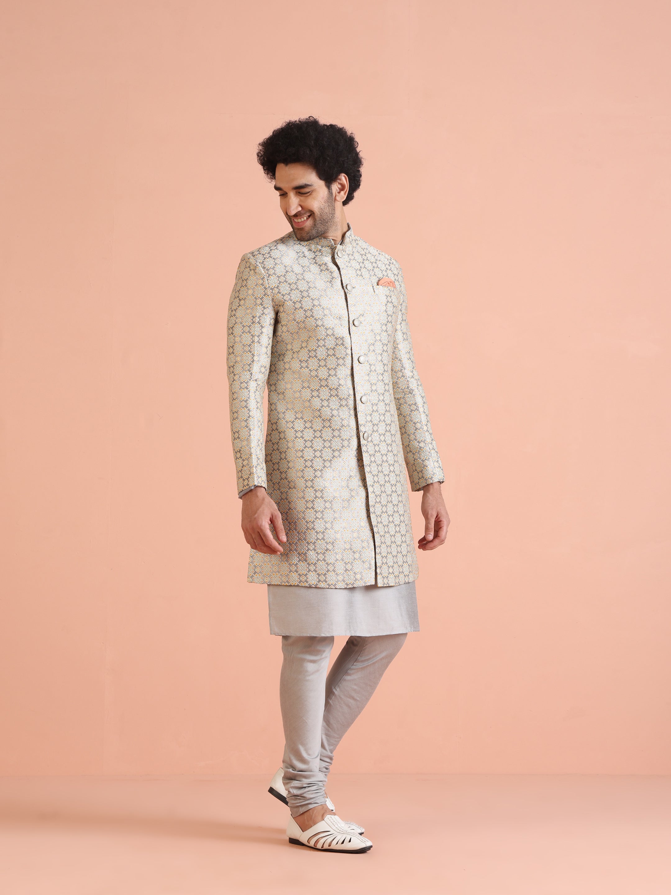 Experience classic elegance with this Kisah Men Grey Jacquard Kurta Indowestern Indowestern Churidar Set. The breathable fabric ensures comfort throughout the day. Ideal for festive events or casual wear.