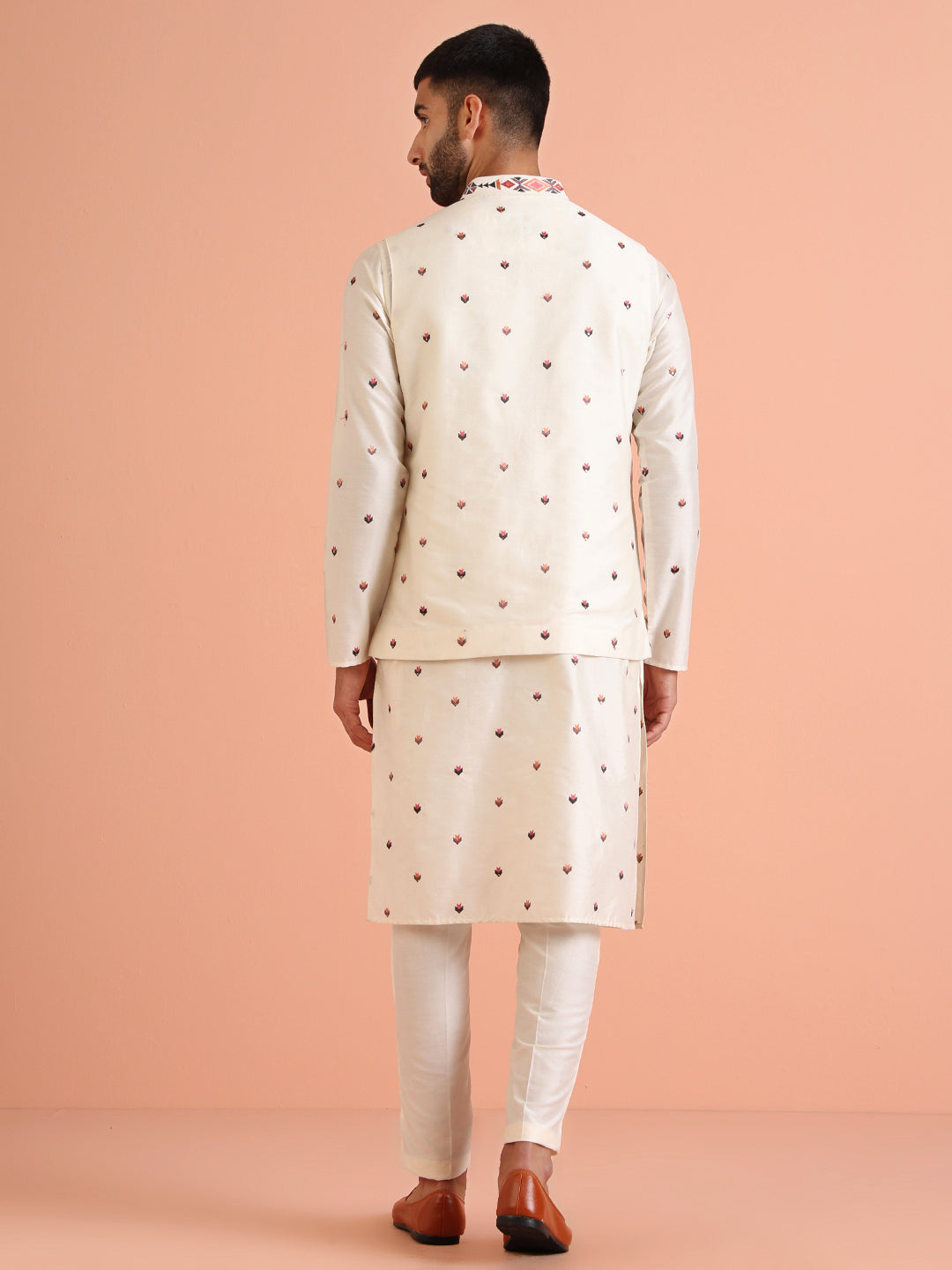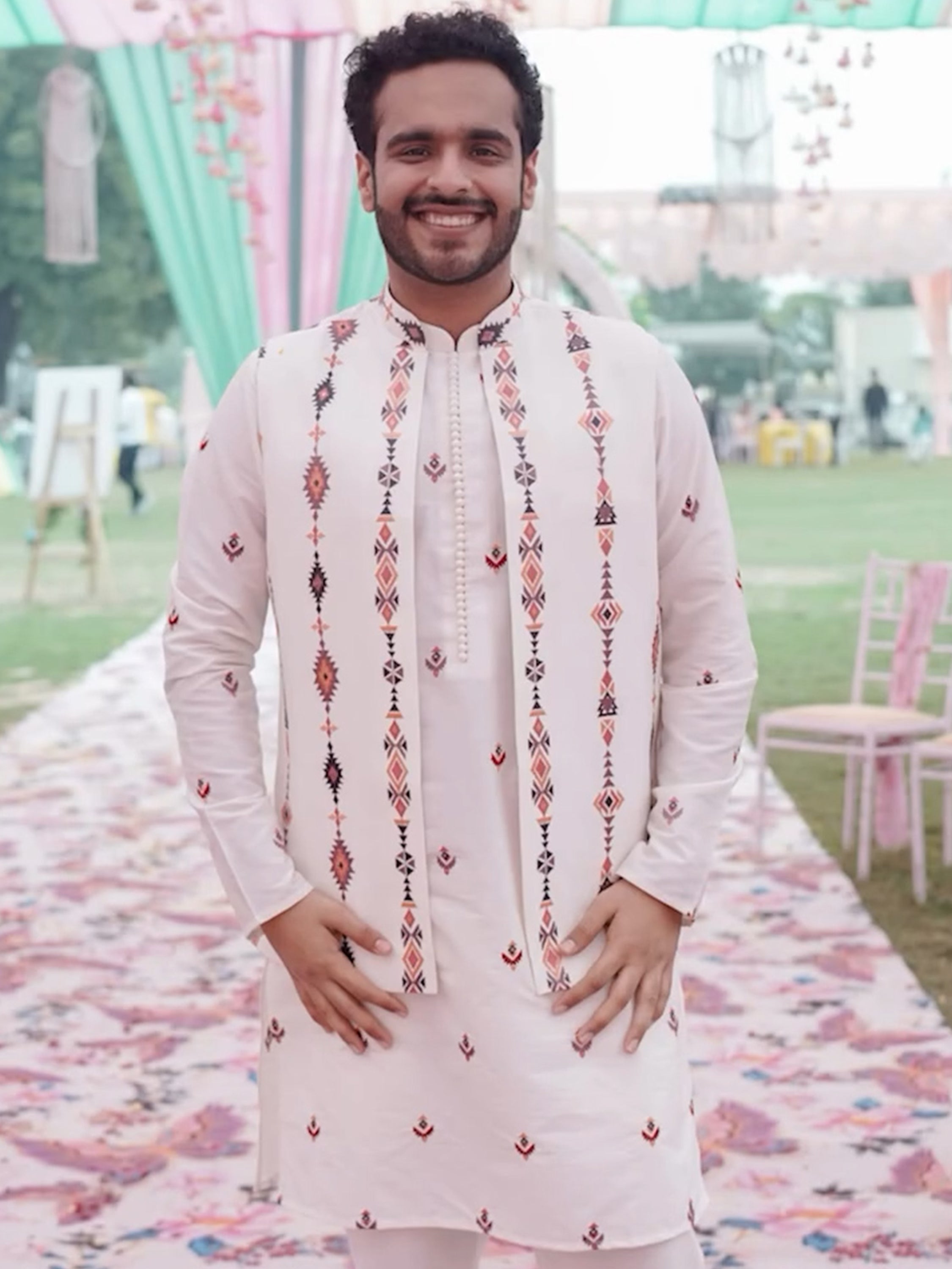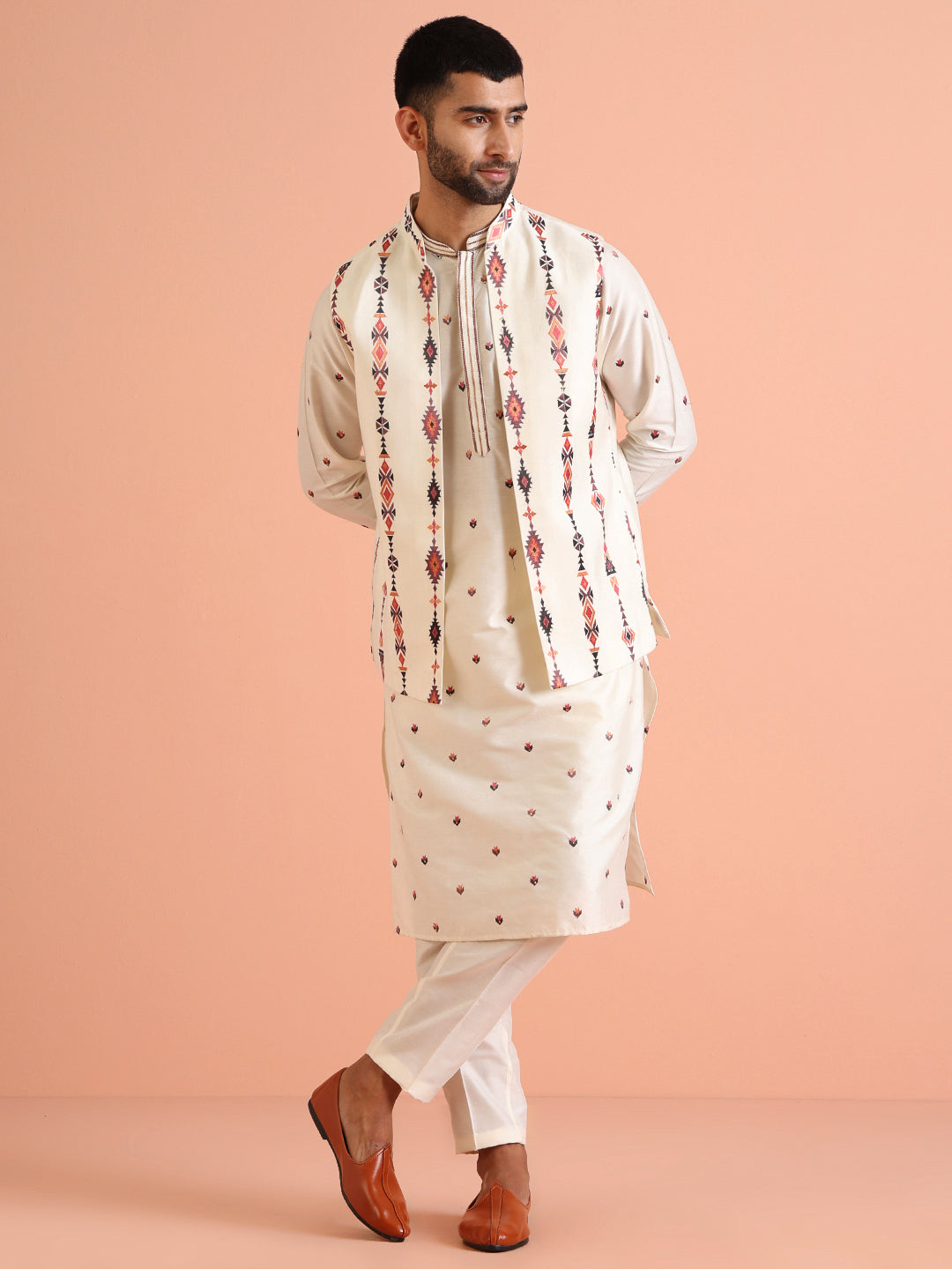 This Multi Kurta Jacket Trouser Set is a yes for all your casual occasions. The Jacket is of Cotton Blend which adds on to the defined and modern look. This set to complete your look