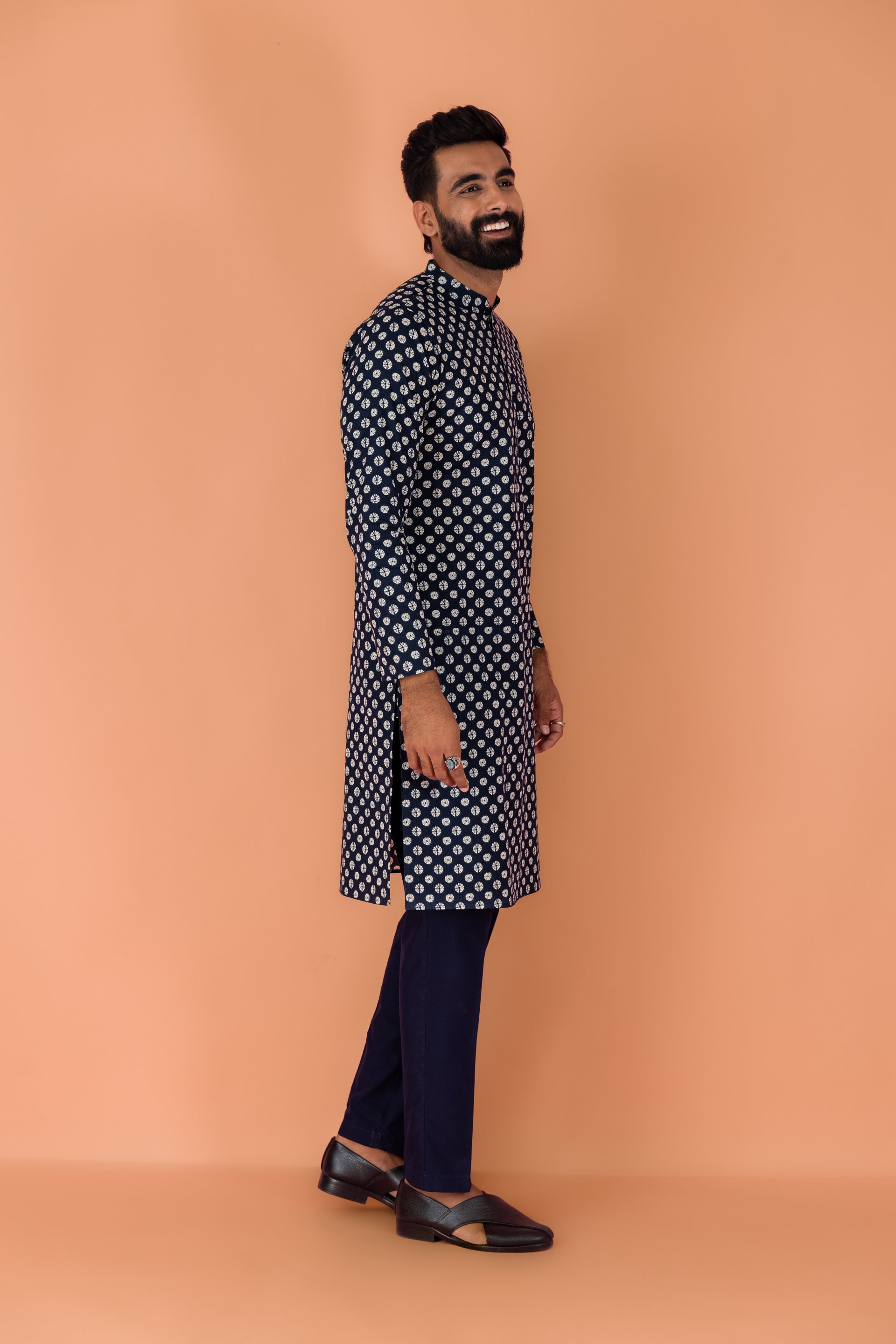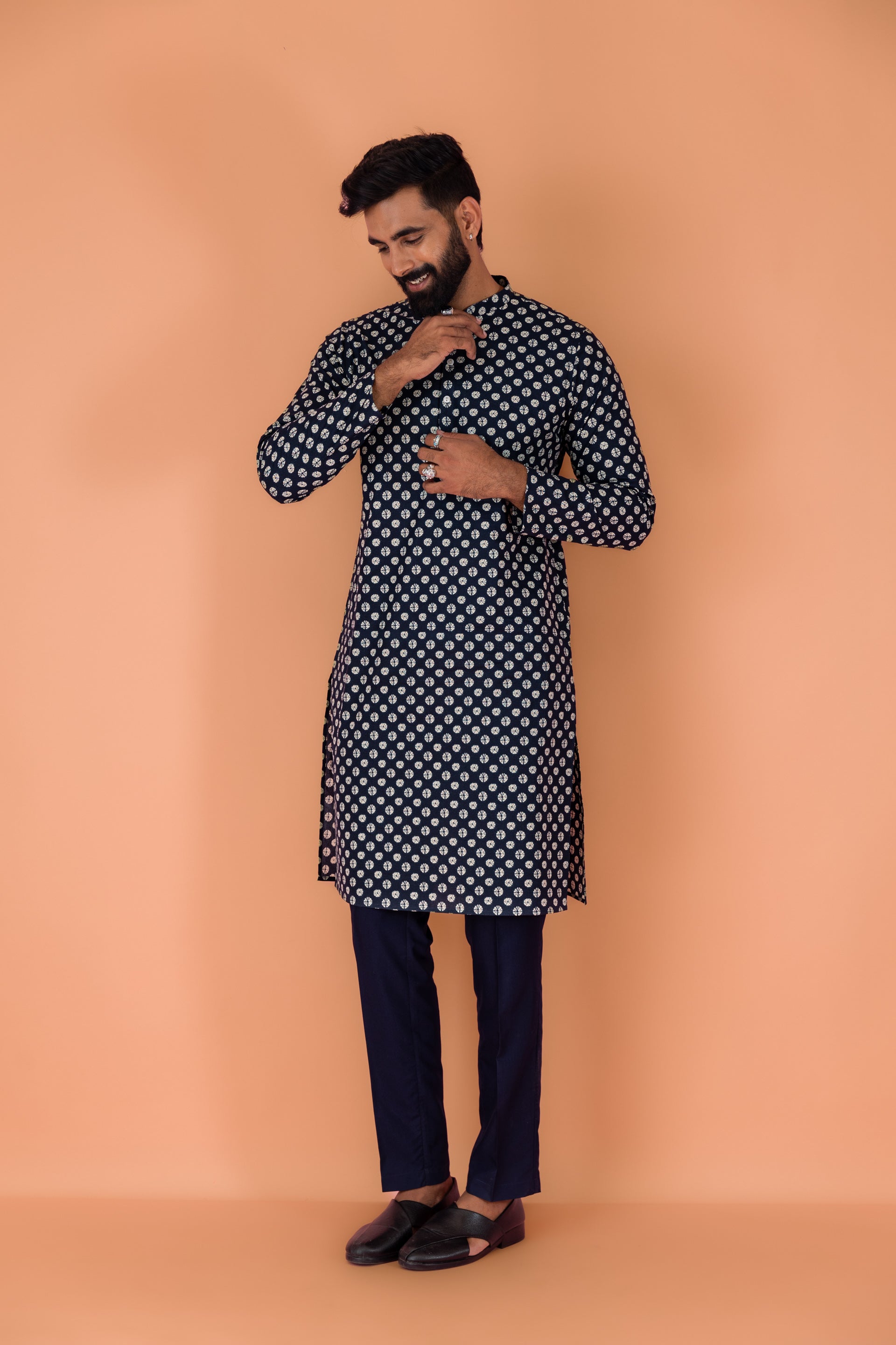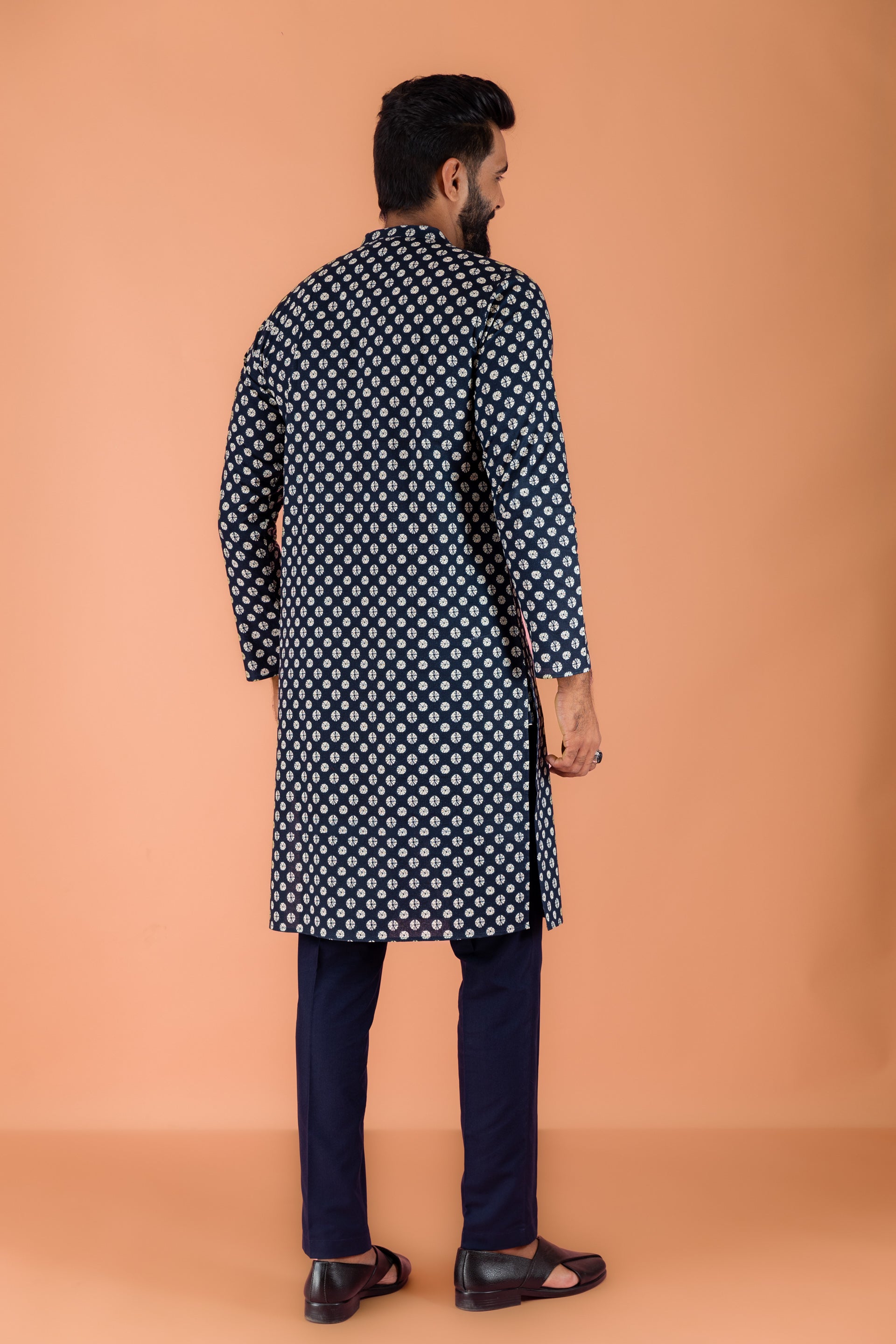 Experience classic elegance with this Kisah Men Navy Blue Cotton Blend Tie & Dye Pattern, Kurta Trouser Set. The breathable fabric ensures comfort throughout the day. Ideal for festive events or casual wear.