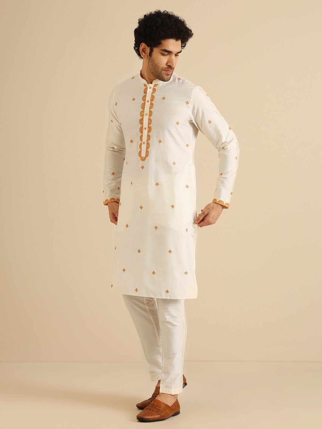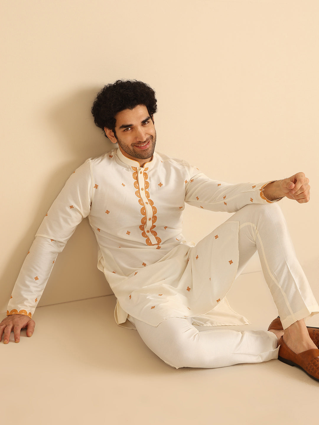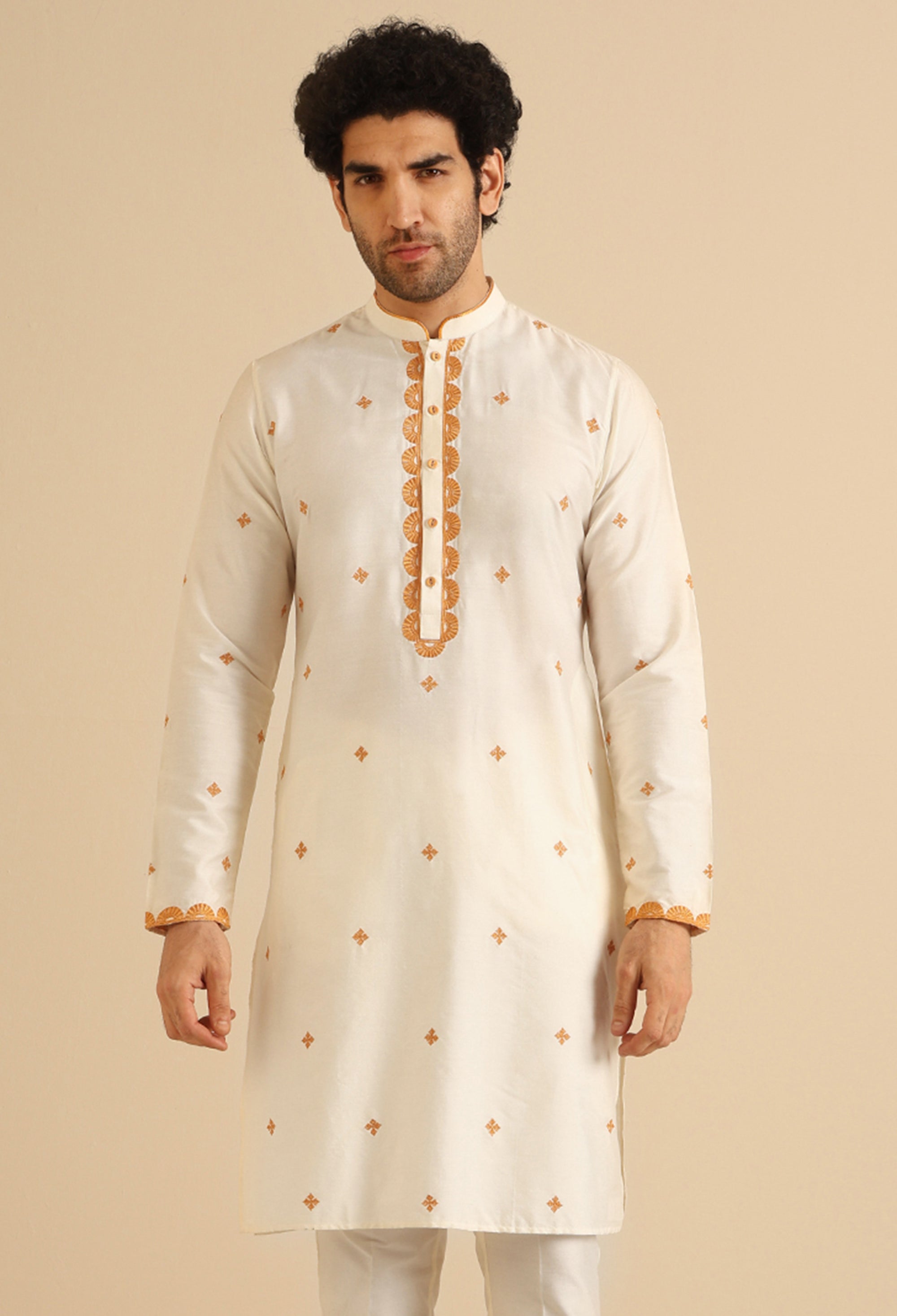 This Off White Kurta is a yes for all your casual occasions. The Kurta is of Cotton Blend which adds on to the defined and modern look. This Kurta will complete your look