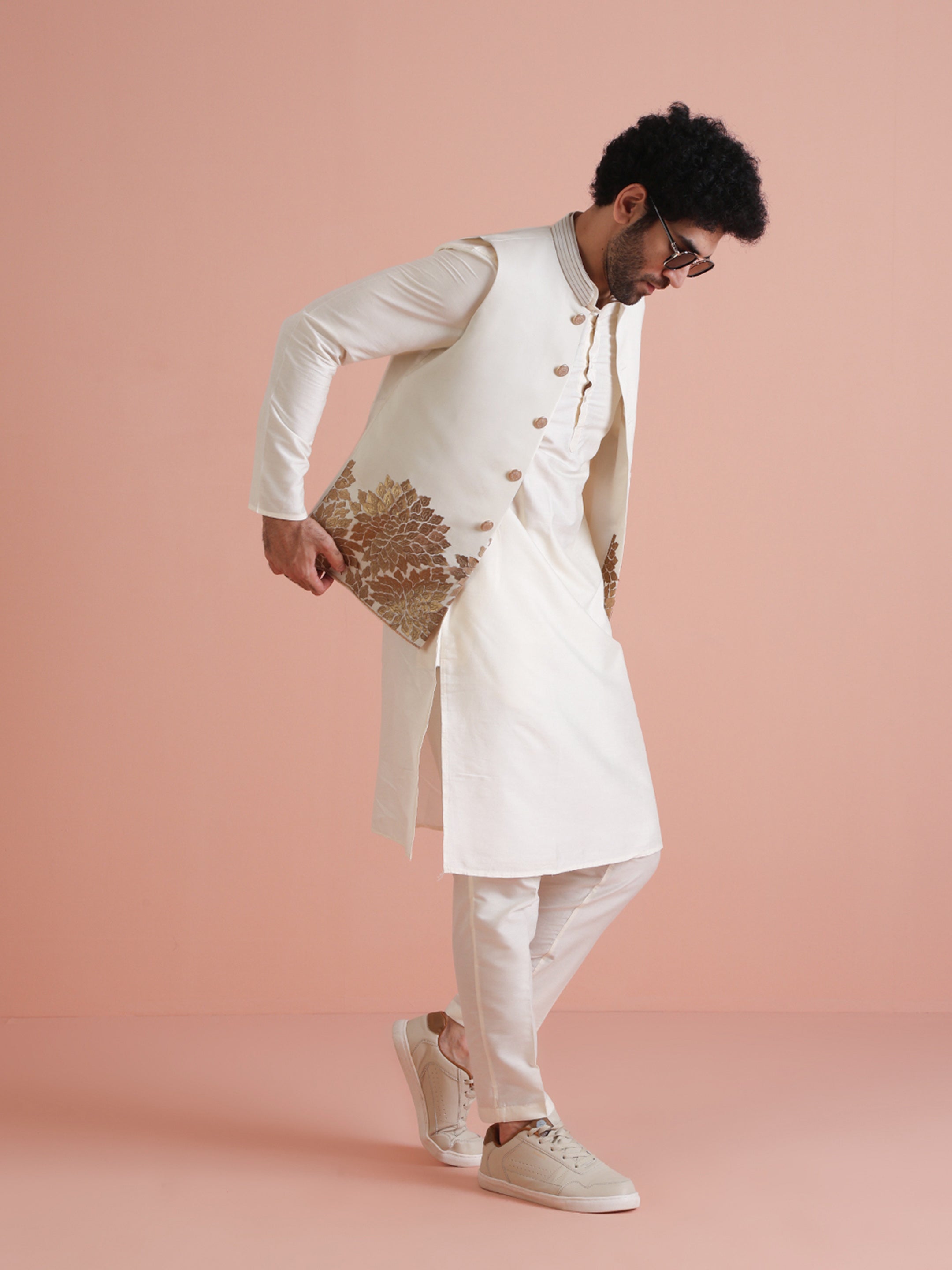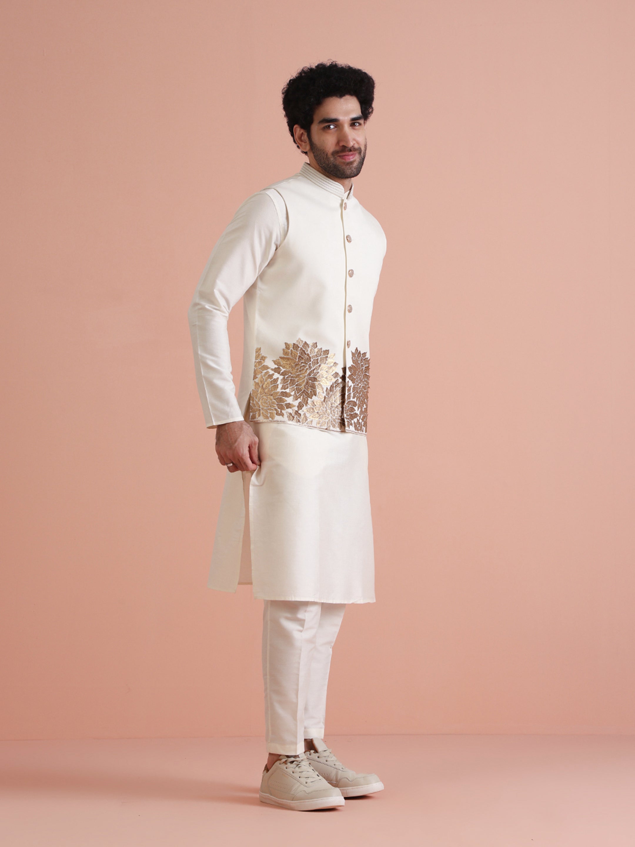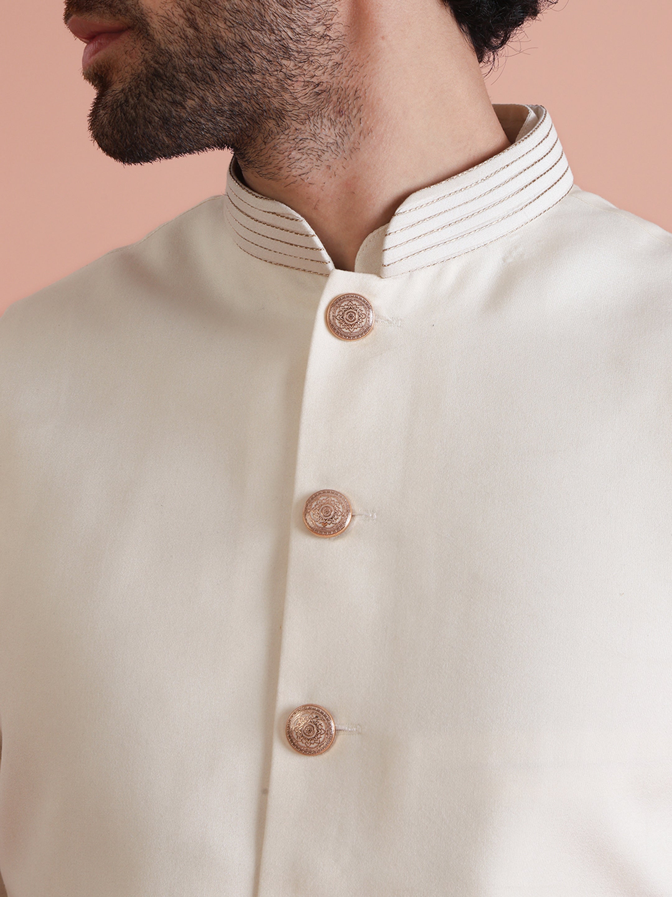 Experience classic elegance with this Men's Off White Color Cotton Blend Kurta Jacket Trouser Set. The Embellished Pattern adds a refined touch, while the breathable fabric ensures comfort throughout the day. Ideal for festive events or casual wear, this Kurta Jacket Trouser Set is a wardrobe essential.