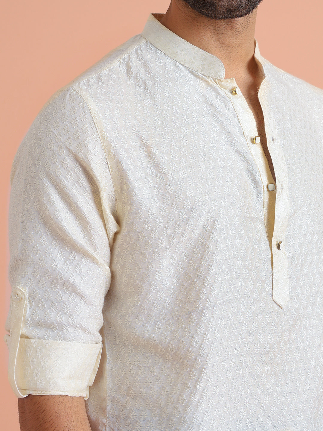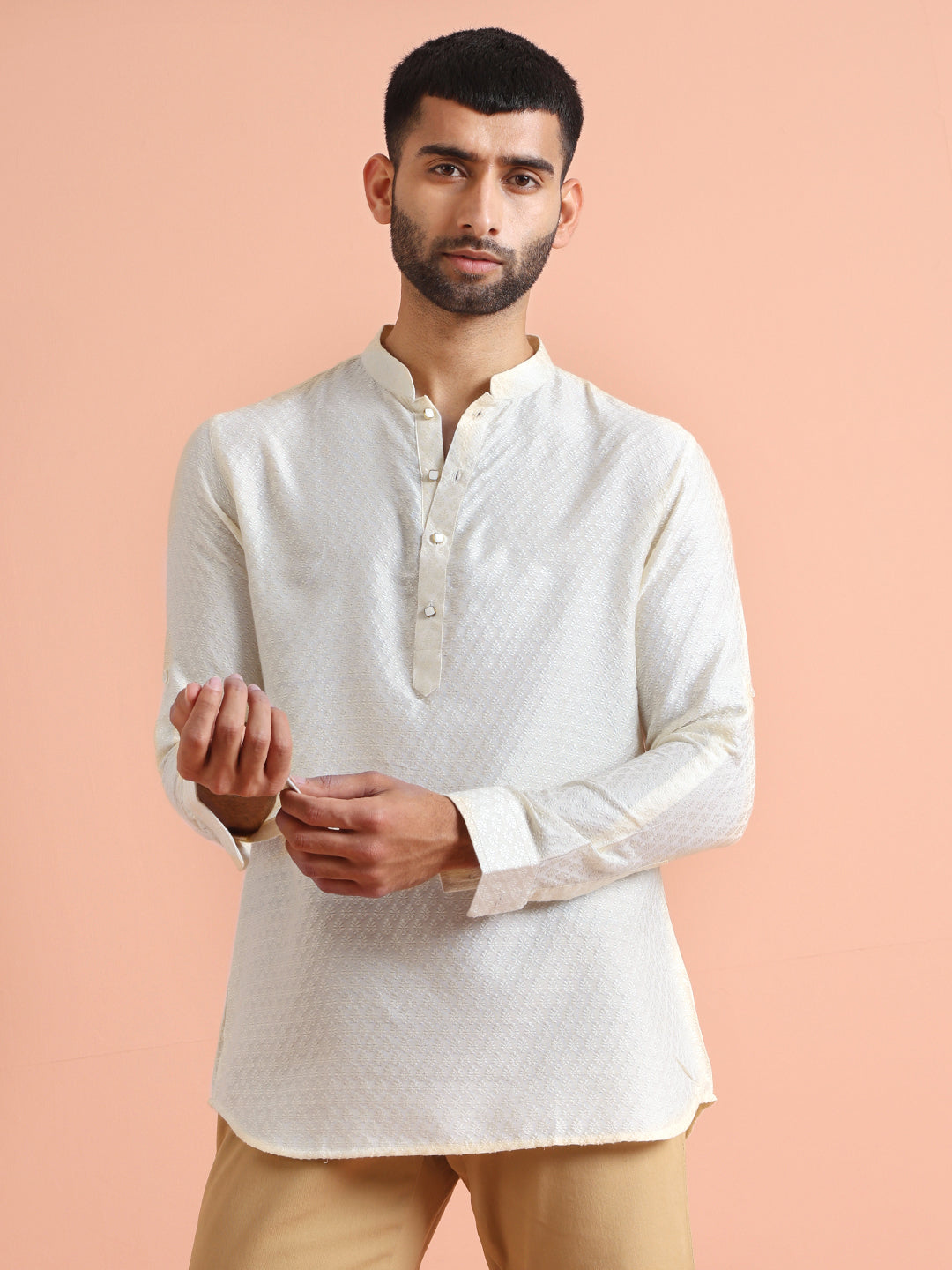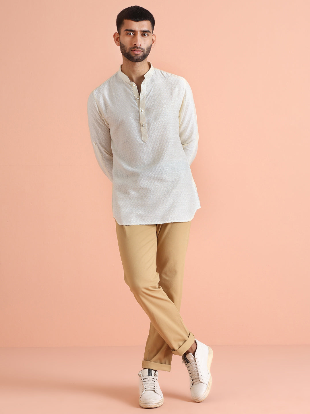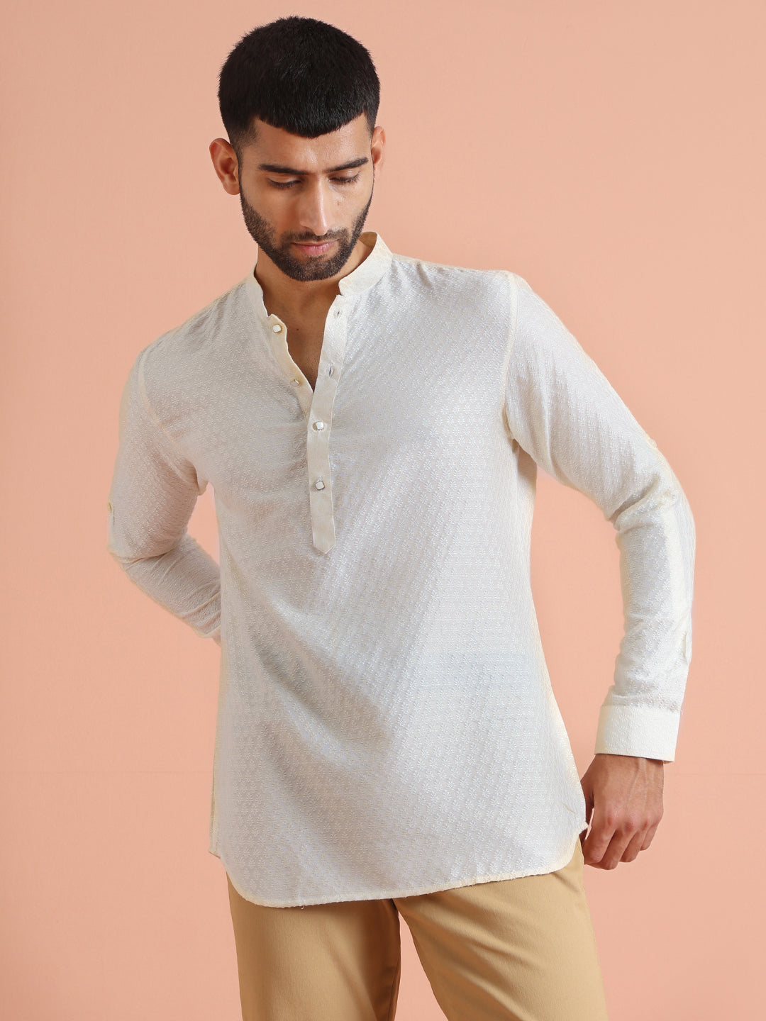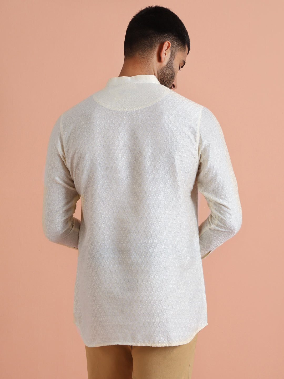This Off White Short Kurta is a yes for all your casual occasions. The Short Kurta is of Silk Blend which adds on to the defined and modern look.