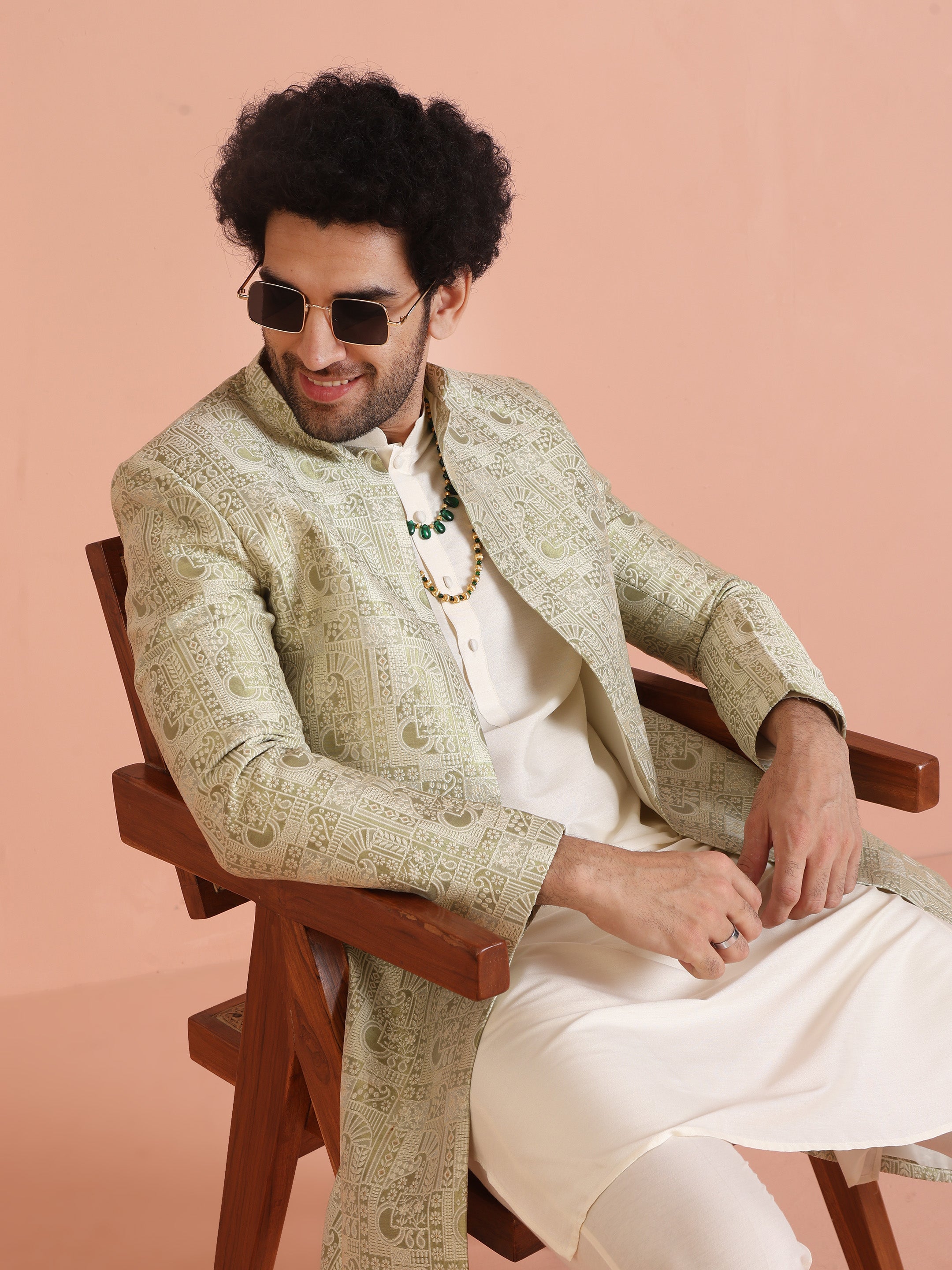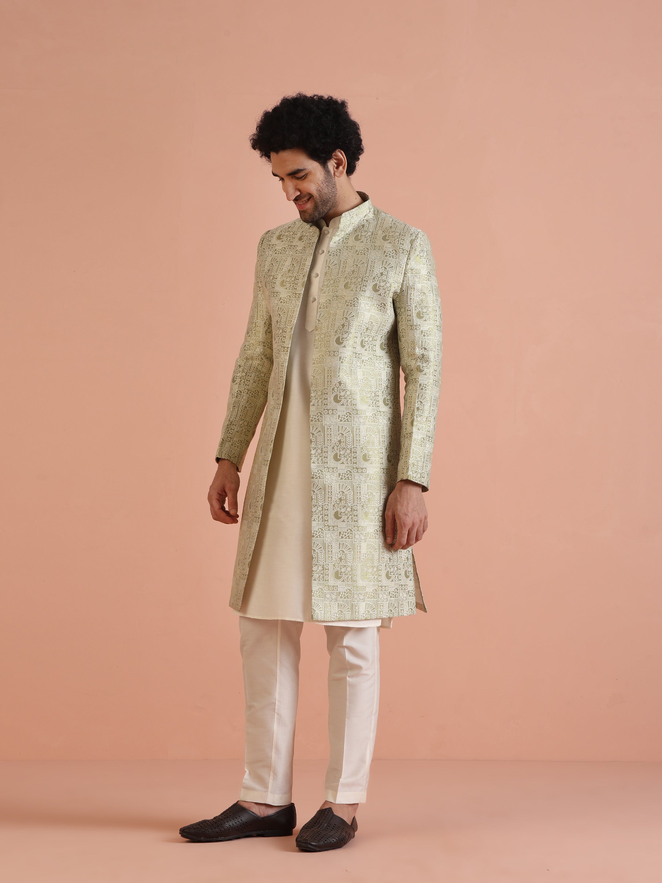 Elevate your style with this Cream Indowestern set, featuring a mandarin collar and full sleeves for a classy, modern look. Crafted from soft cotton fabric with a jacquard pattern, this Indowestern Kurta and Bottomwear set is perfect for weddings, parties, and other formal events.