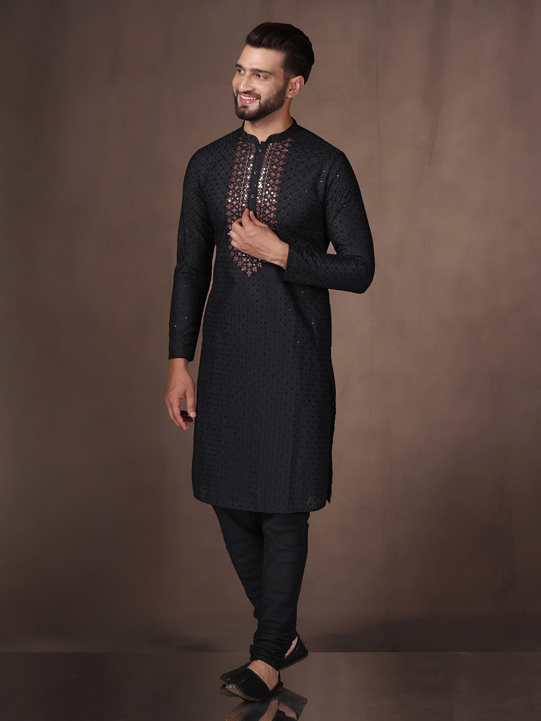This Kurta Set with Black Color is an elegant mandarin collar style that is perfect for occasional wear. With a full sleeve Embroidered design and comfortable fabric, it will make you look stylish.
