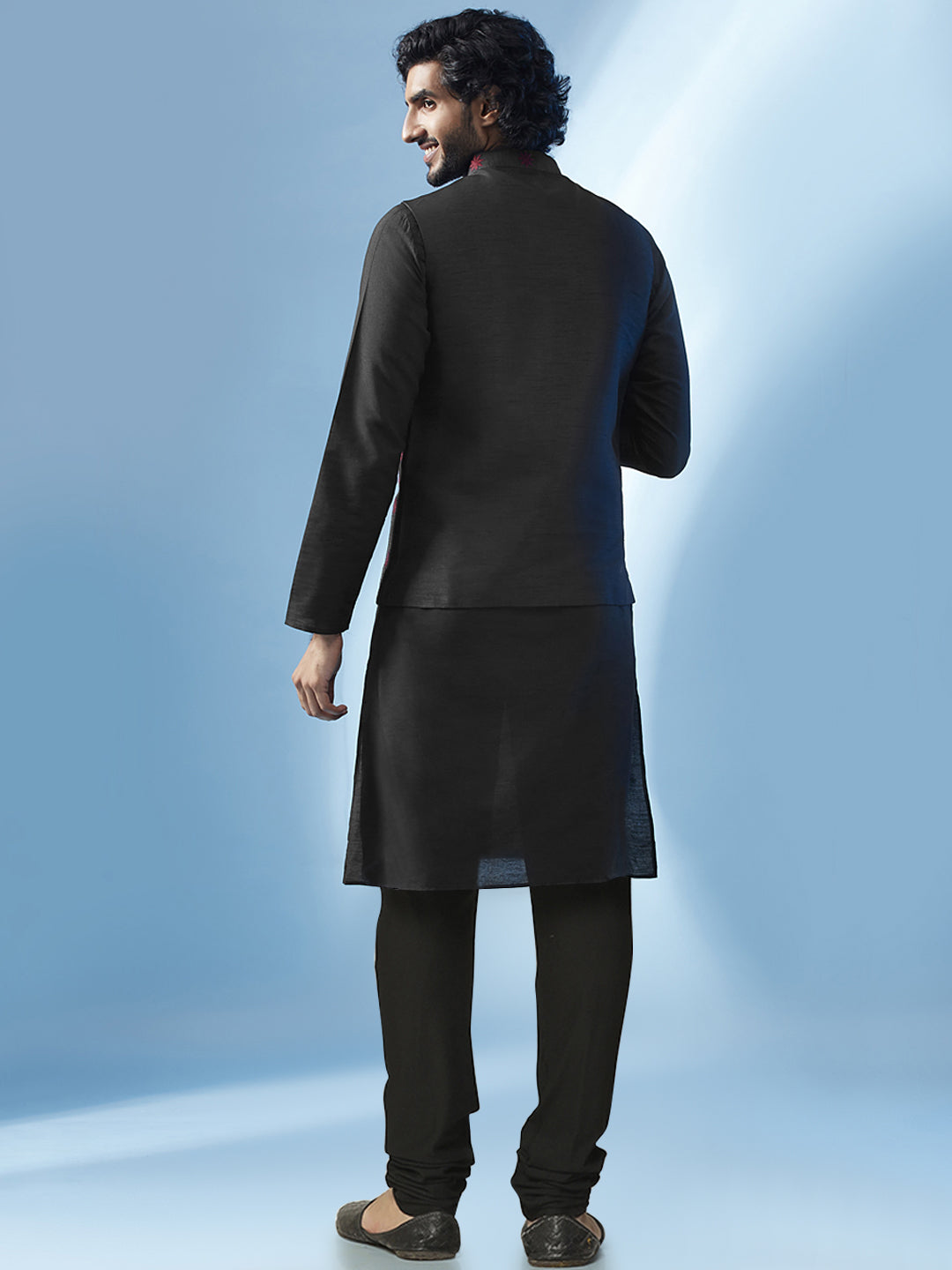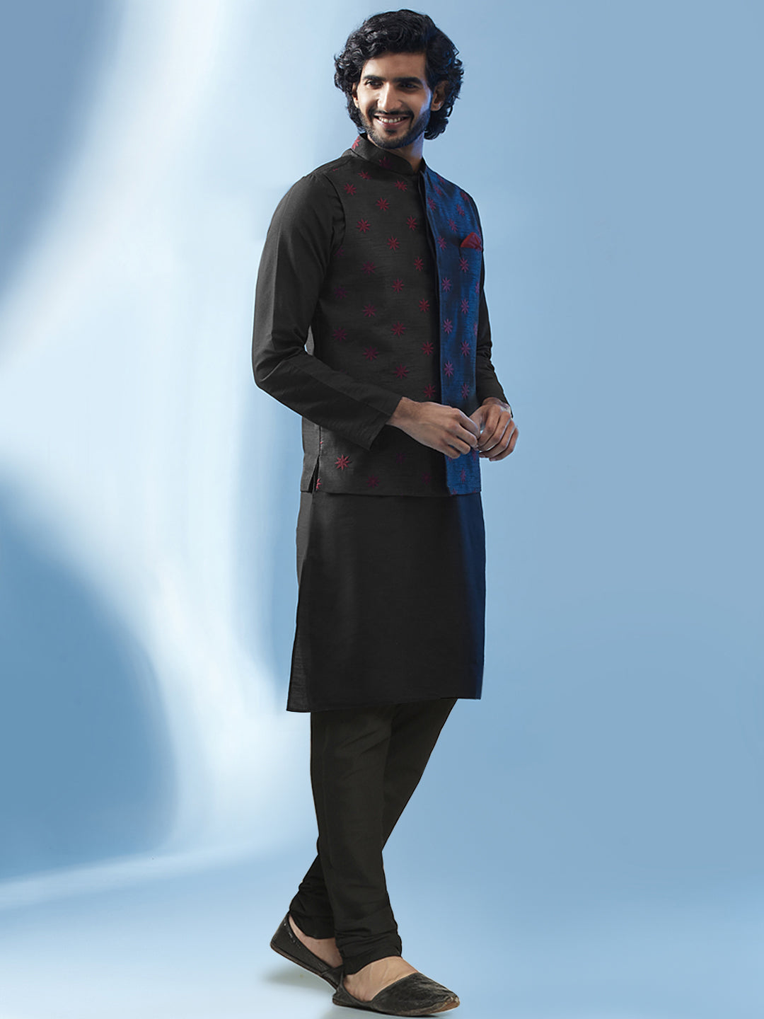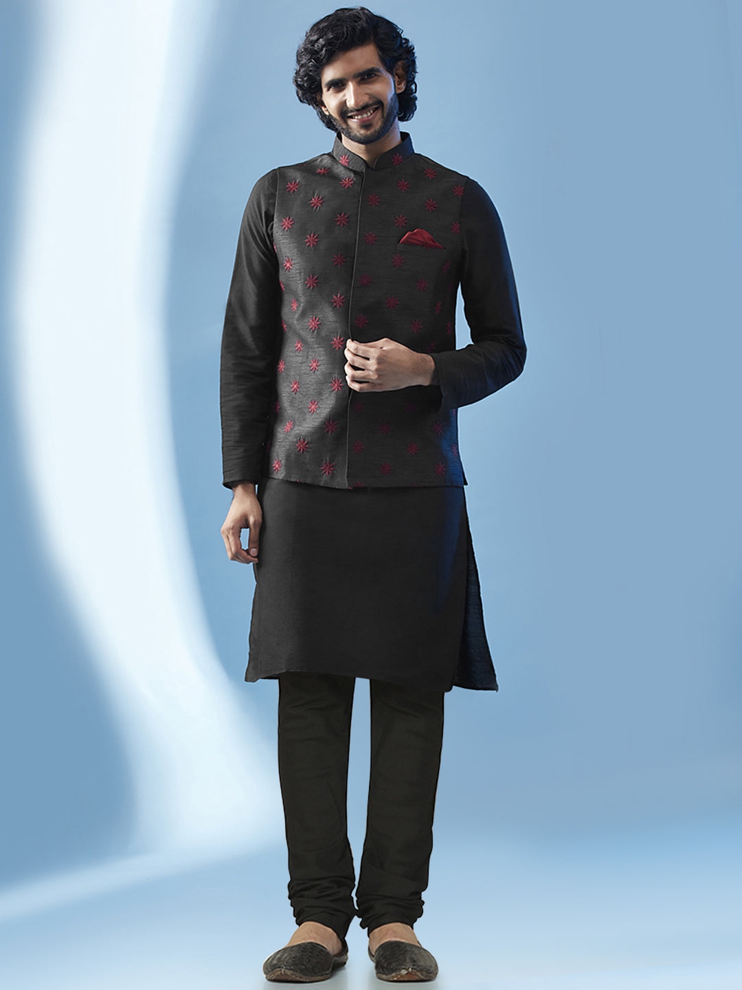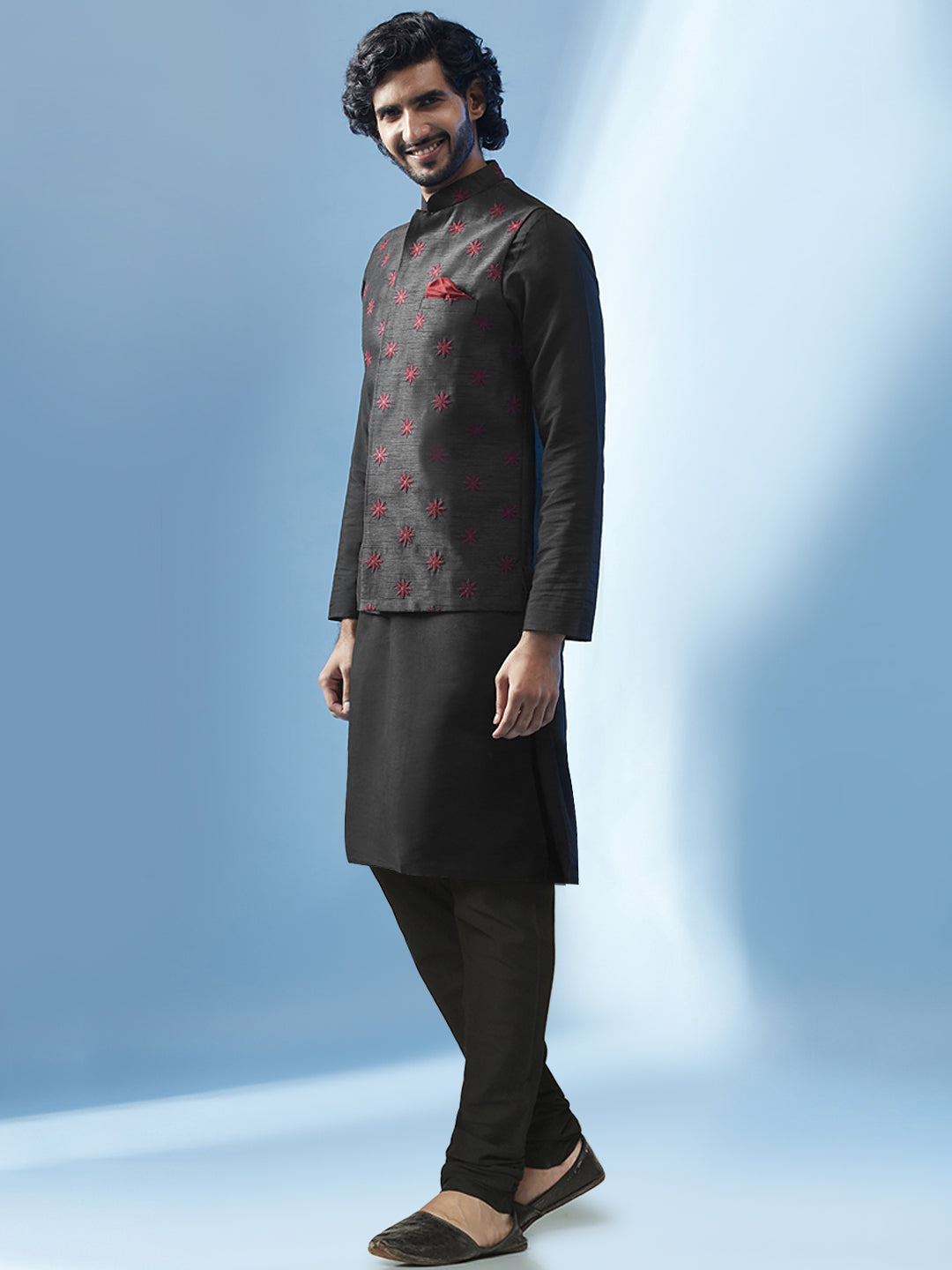 This Kurta Jacket Set with Black Color is an elegant mandarin collar style that is perfect for occasional wear. With a full sleeve Embroidered design and comfortable fabric, it will make you look stylish.