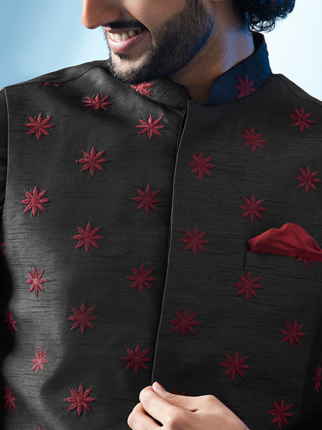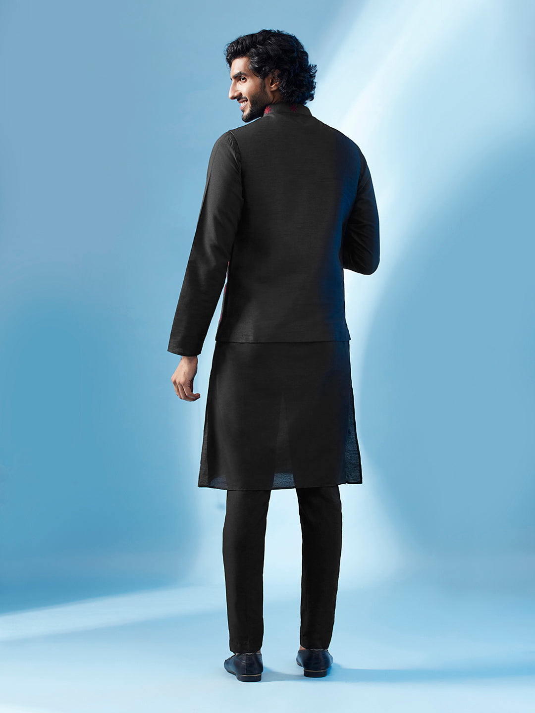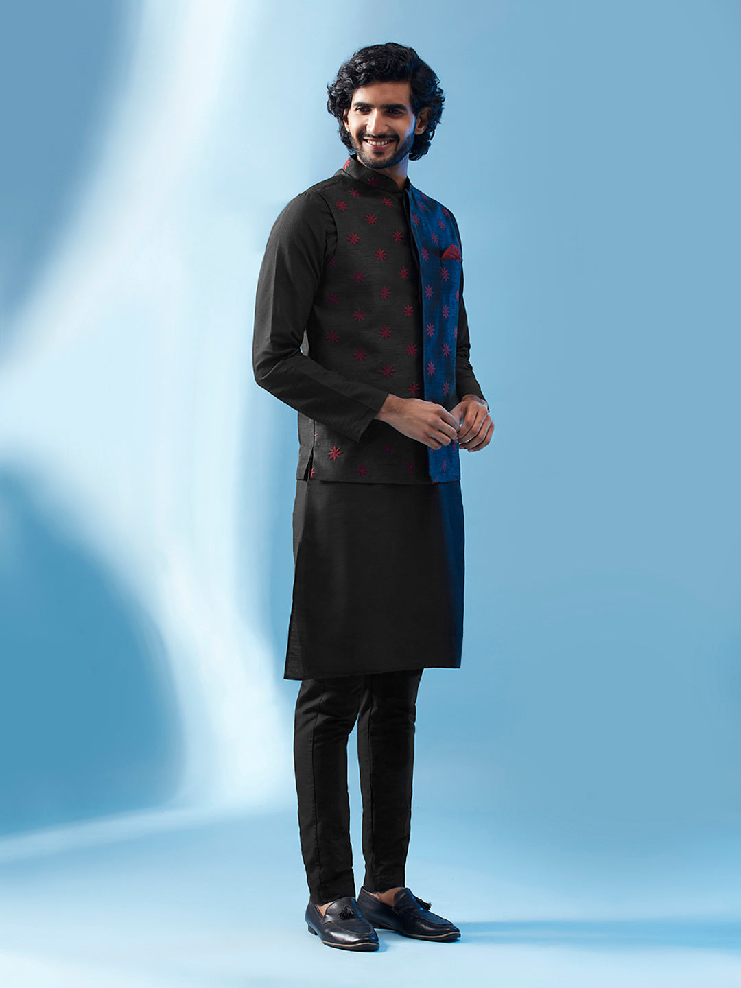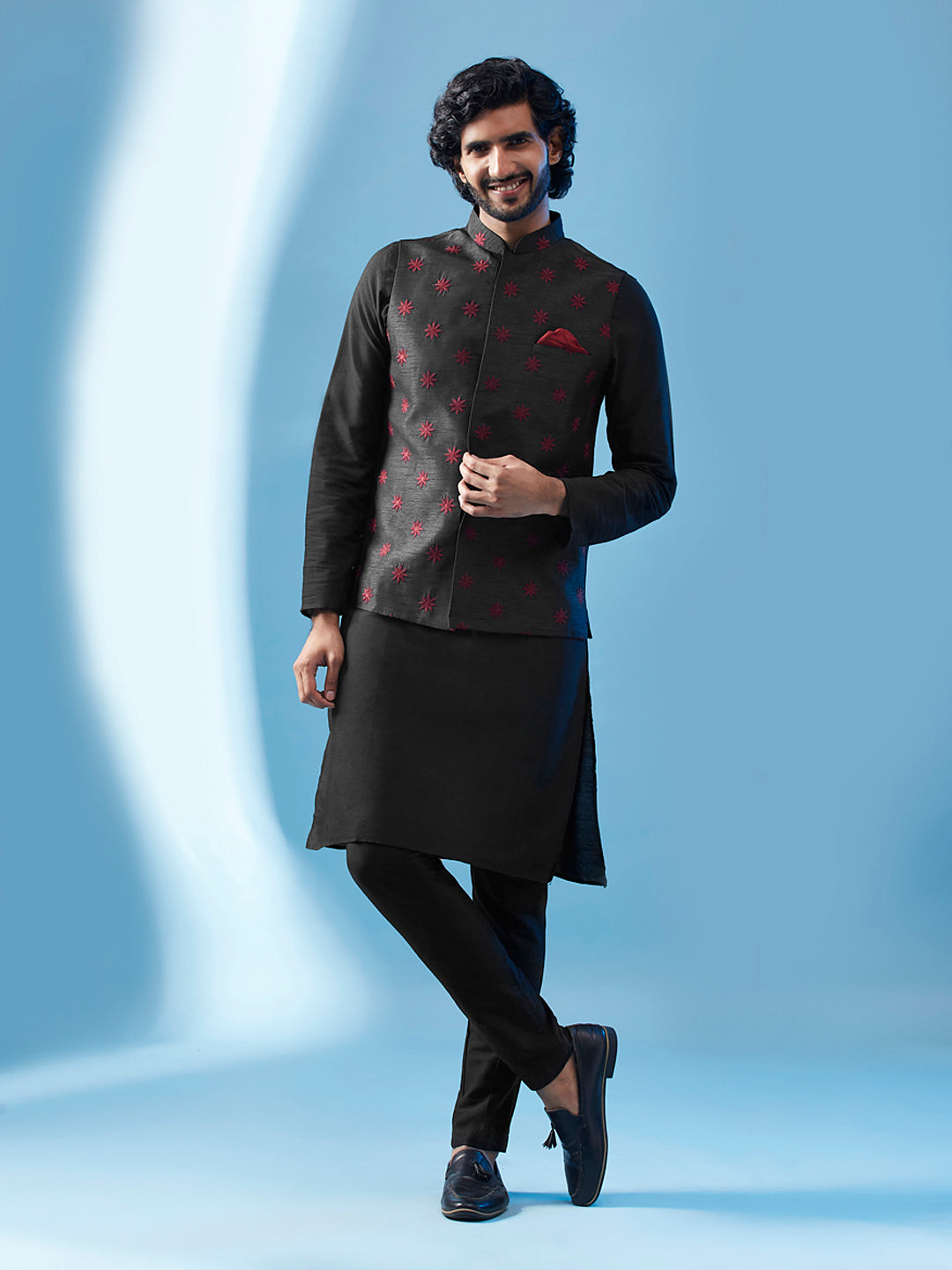 This Kurta Jacket Set with Black Color is an elegant mandarin collar style that is perfect for occasional wear. With a full sleeve Embellished design and comfortable fabric, it will make you look stylish.