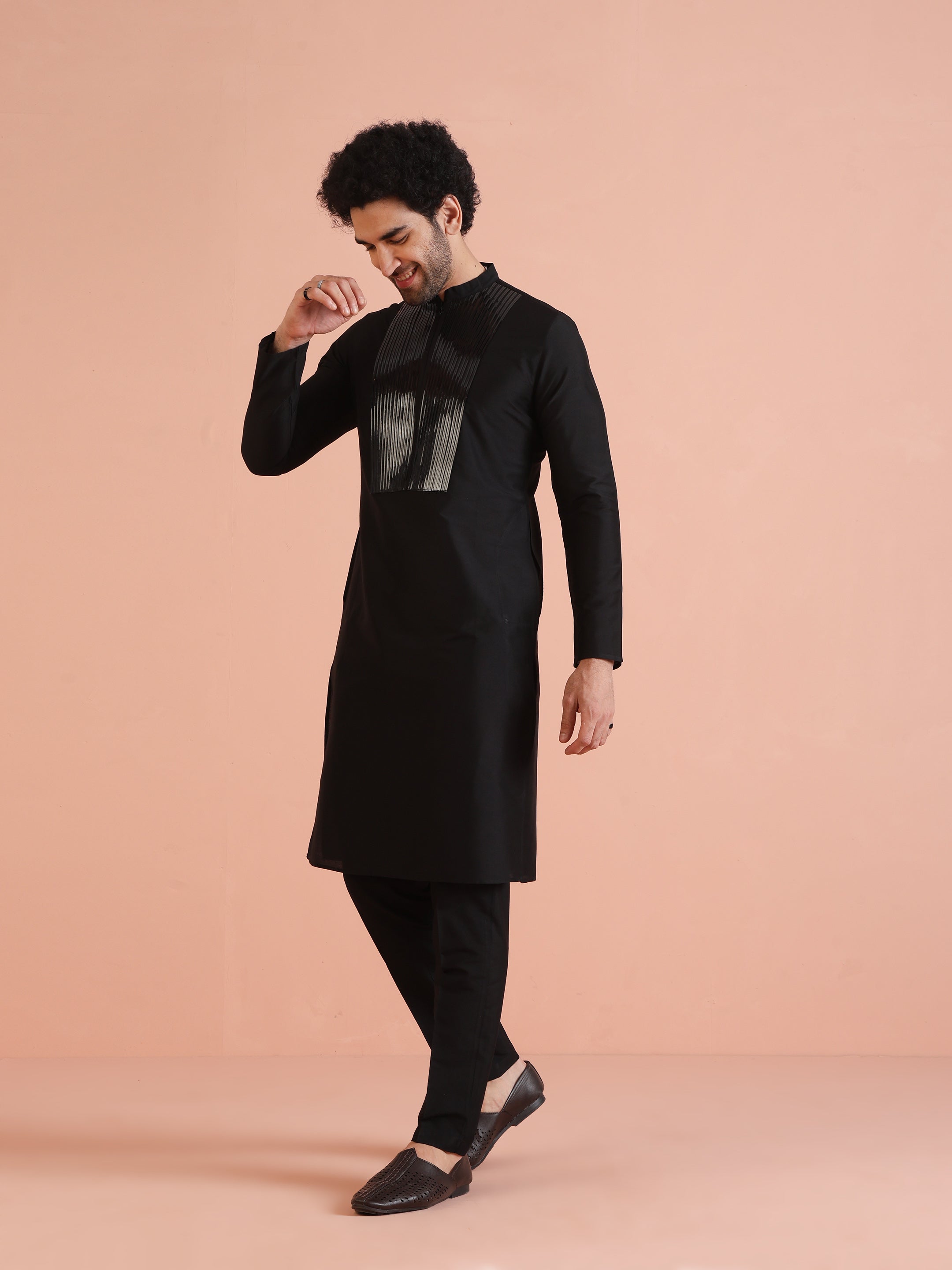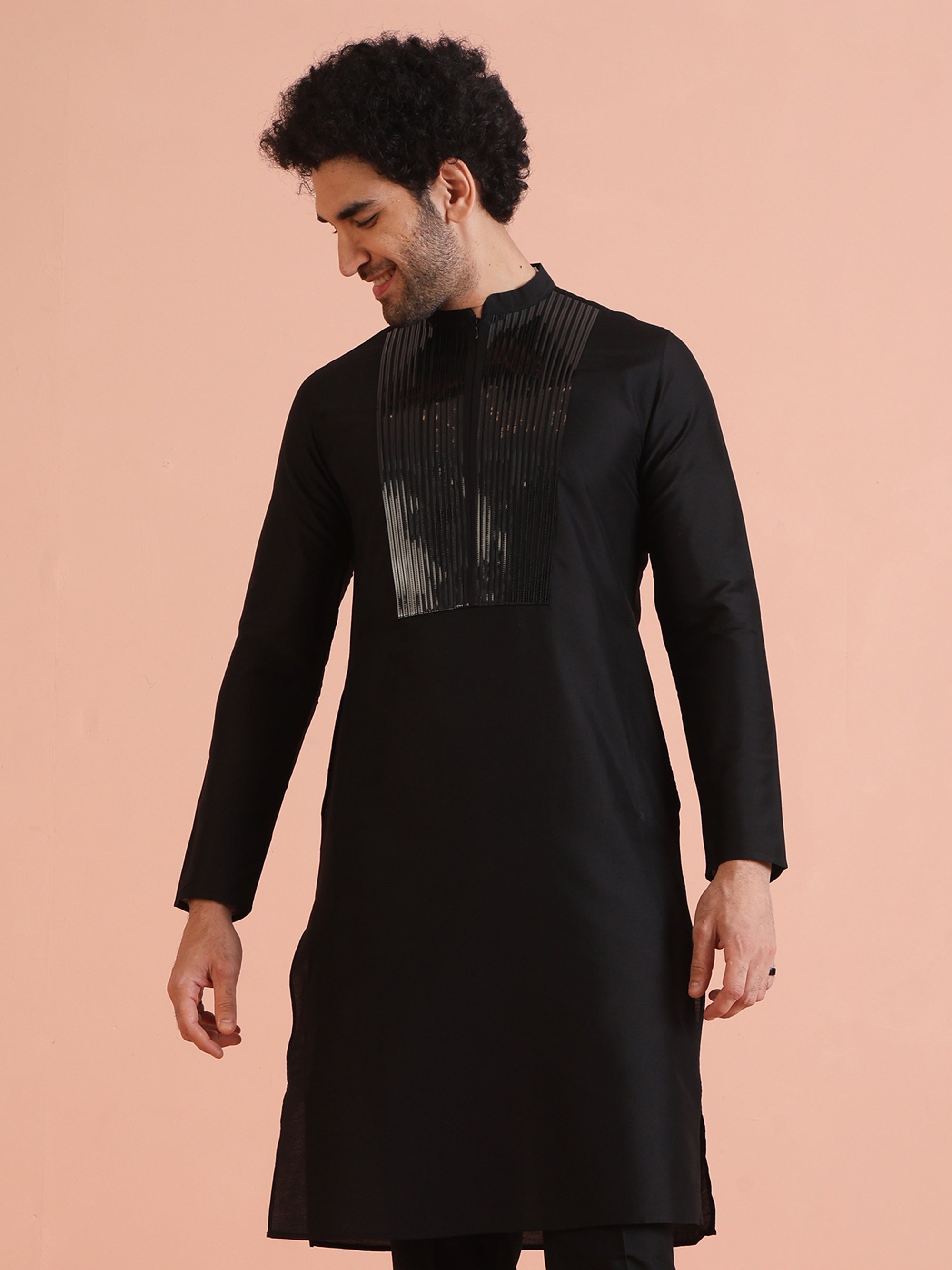 Make a statement with this black cotton blend kurta featuring tape work embellishment. Its regular fit offers all-day comfort, perfect for festive events or casual traditional gatherings.