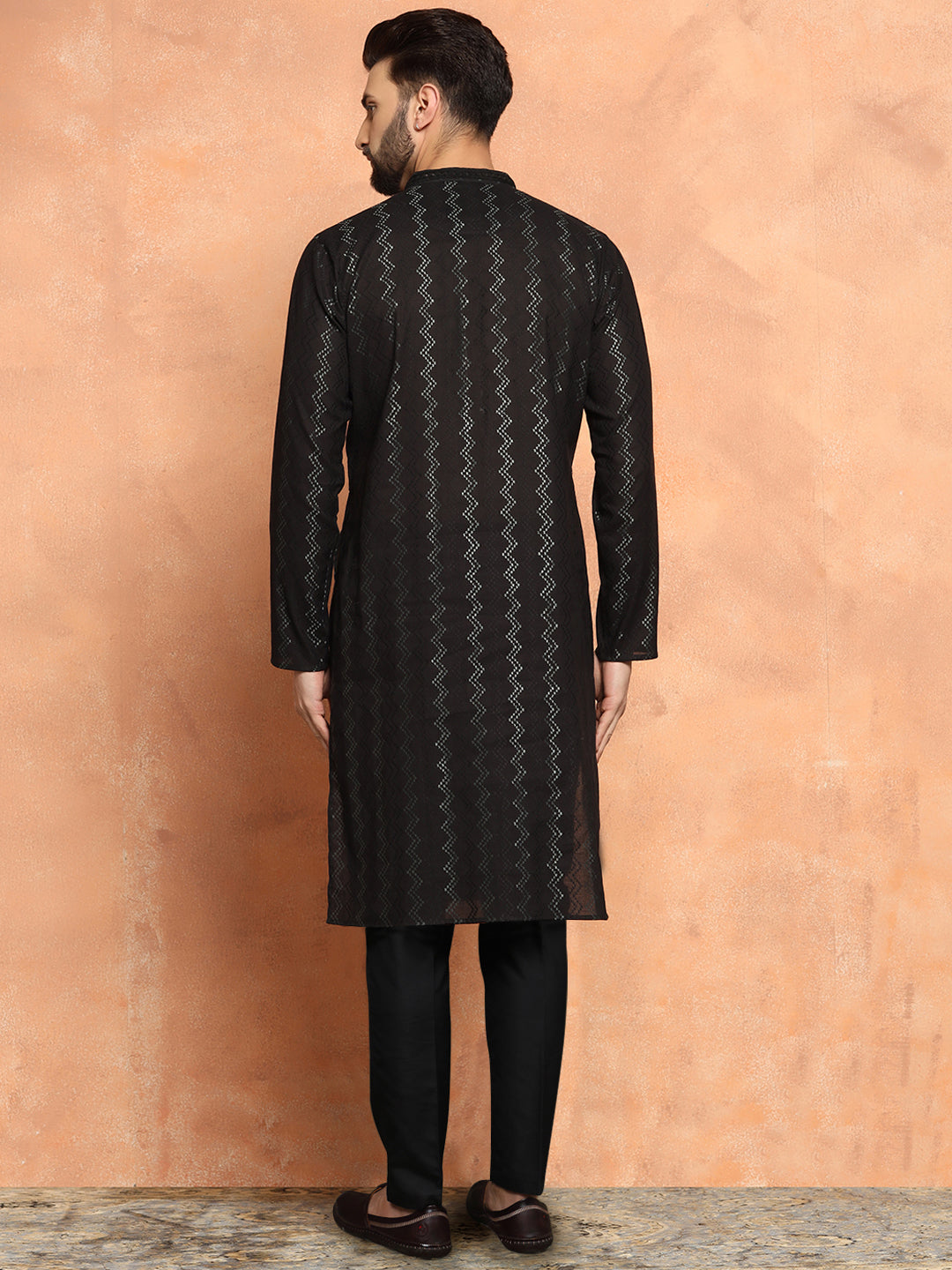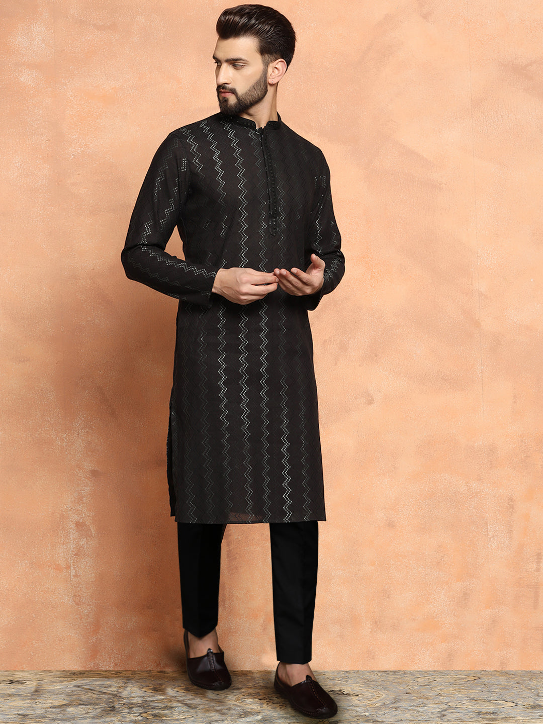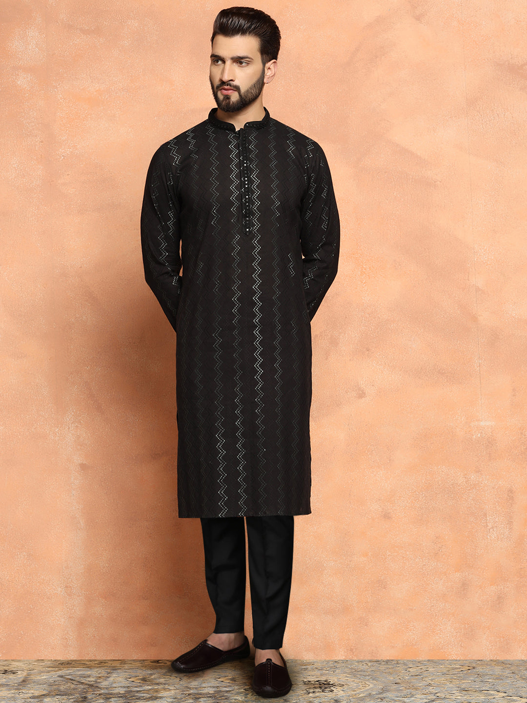 This Kurta Set with Black Color is an elegant mandarin collar style that is perfect for occasional wear. With a full sleeve Embroidered design and comfortable fabric, it will make you look stylish.