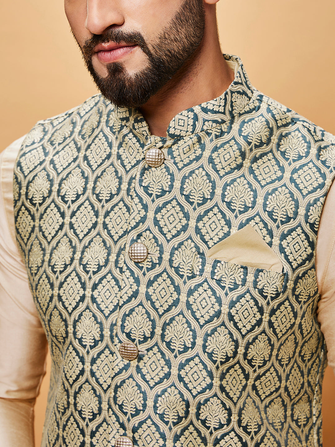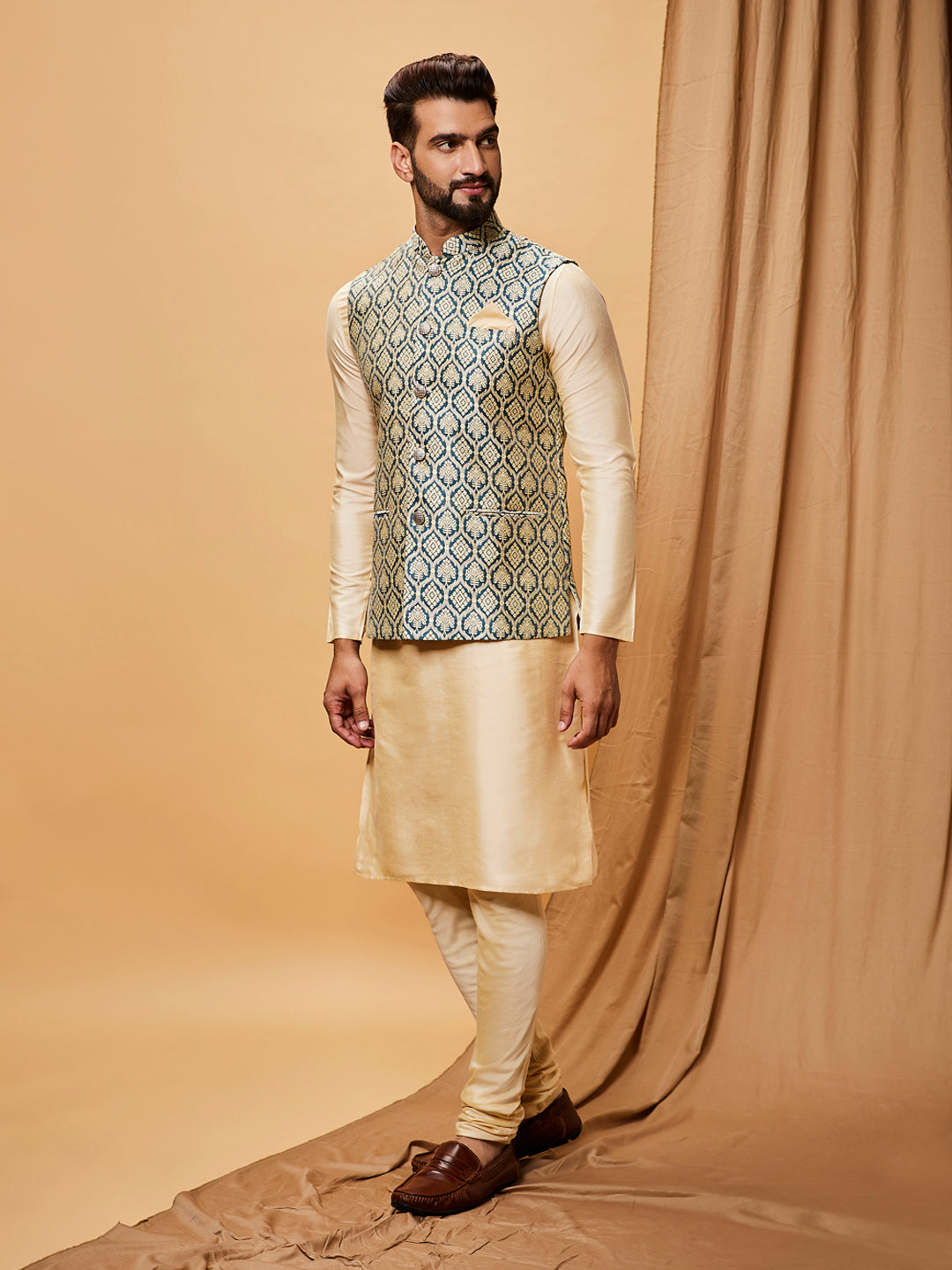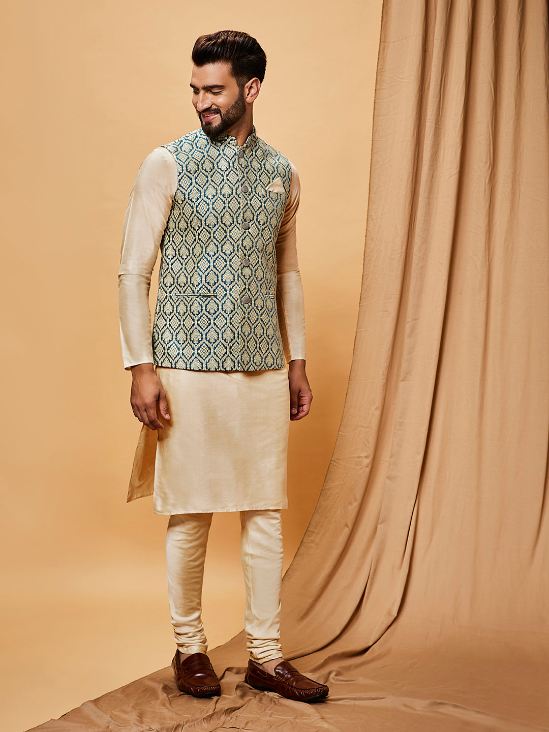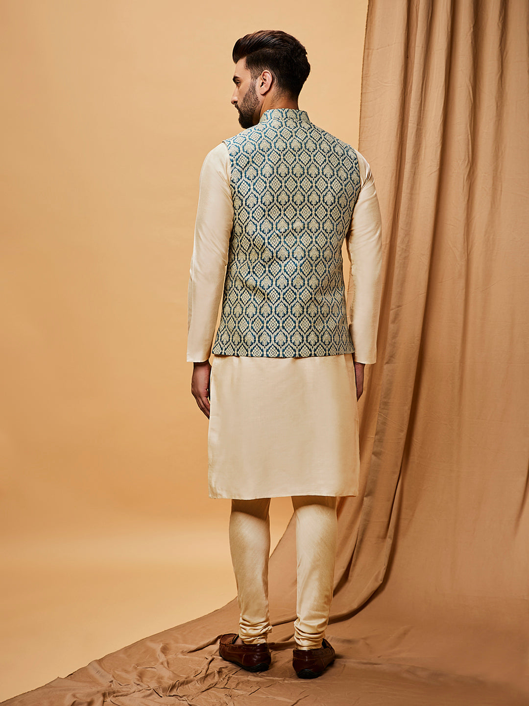 Cream Silk Blend Green Textured Nehru Jacket Kurta Set