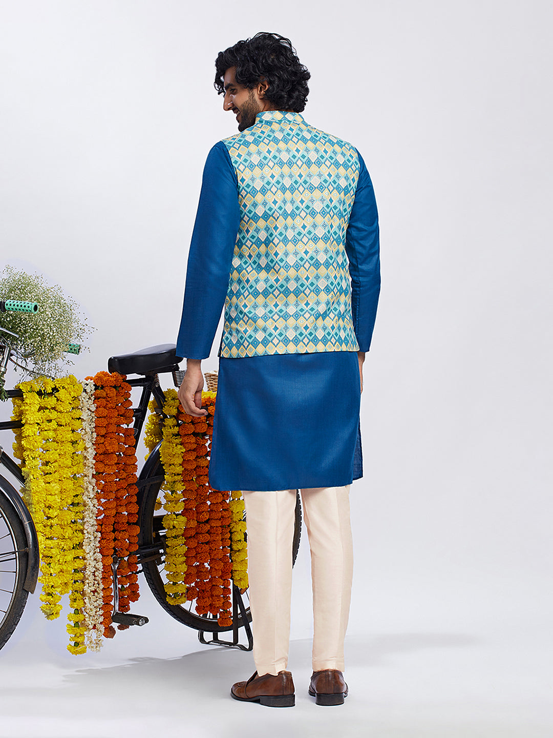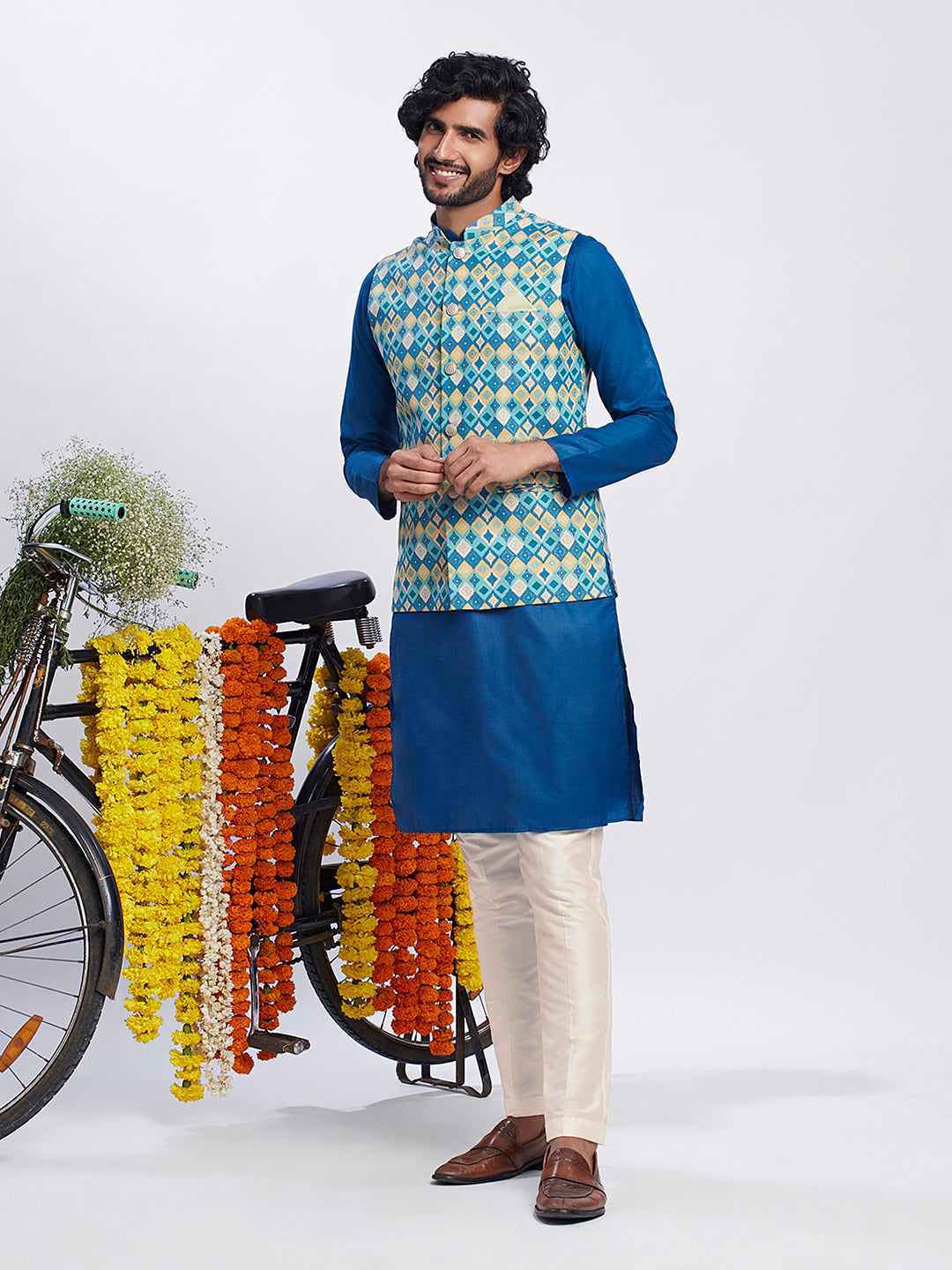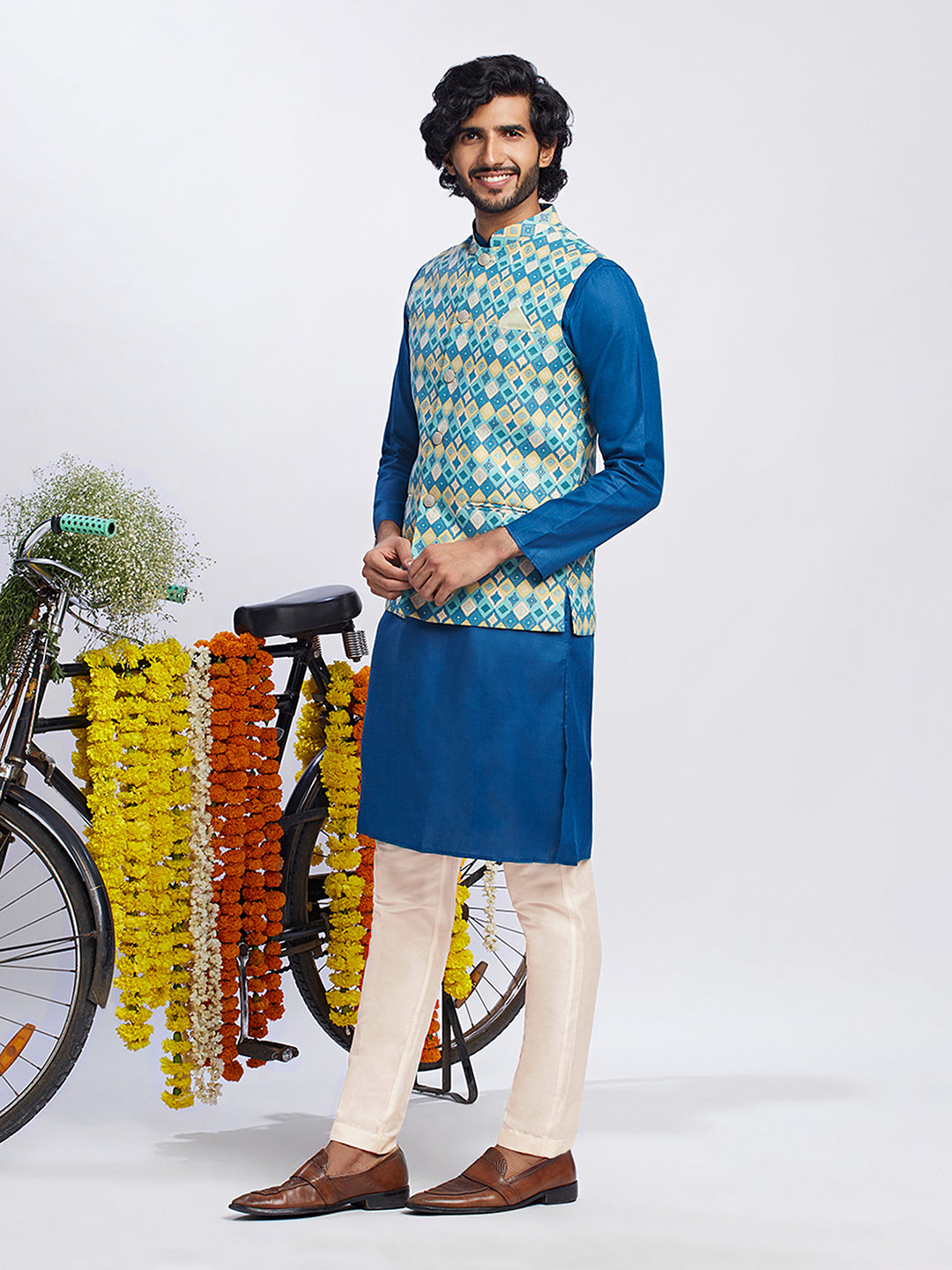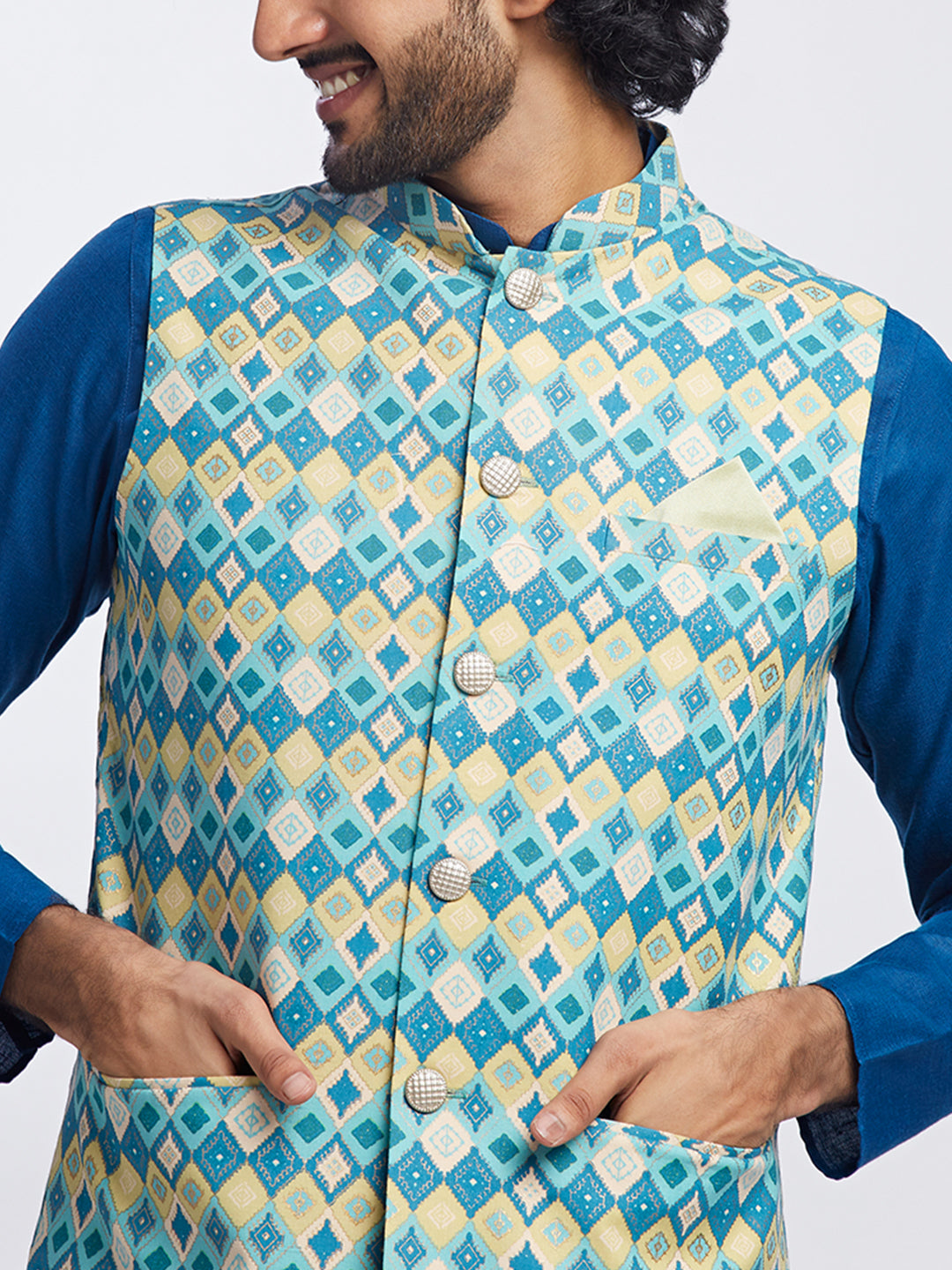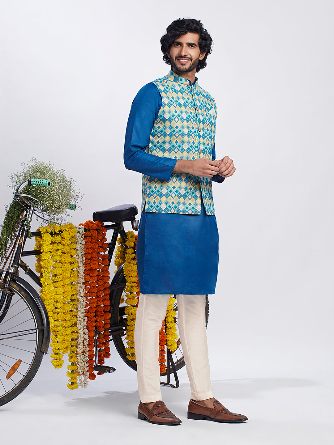 This Kurta Jacket Set with Blue Color is an elegant mandarin collar style that is perfect for occasional wear. With a full sleeve Geometric design and comfortable fabric, it will make you look stylish.