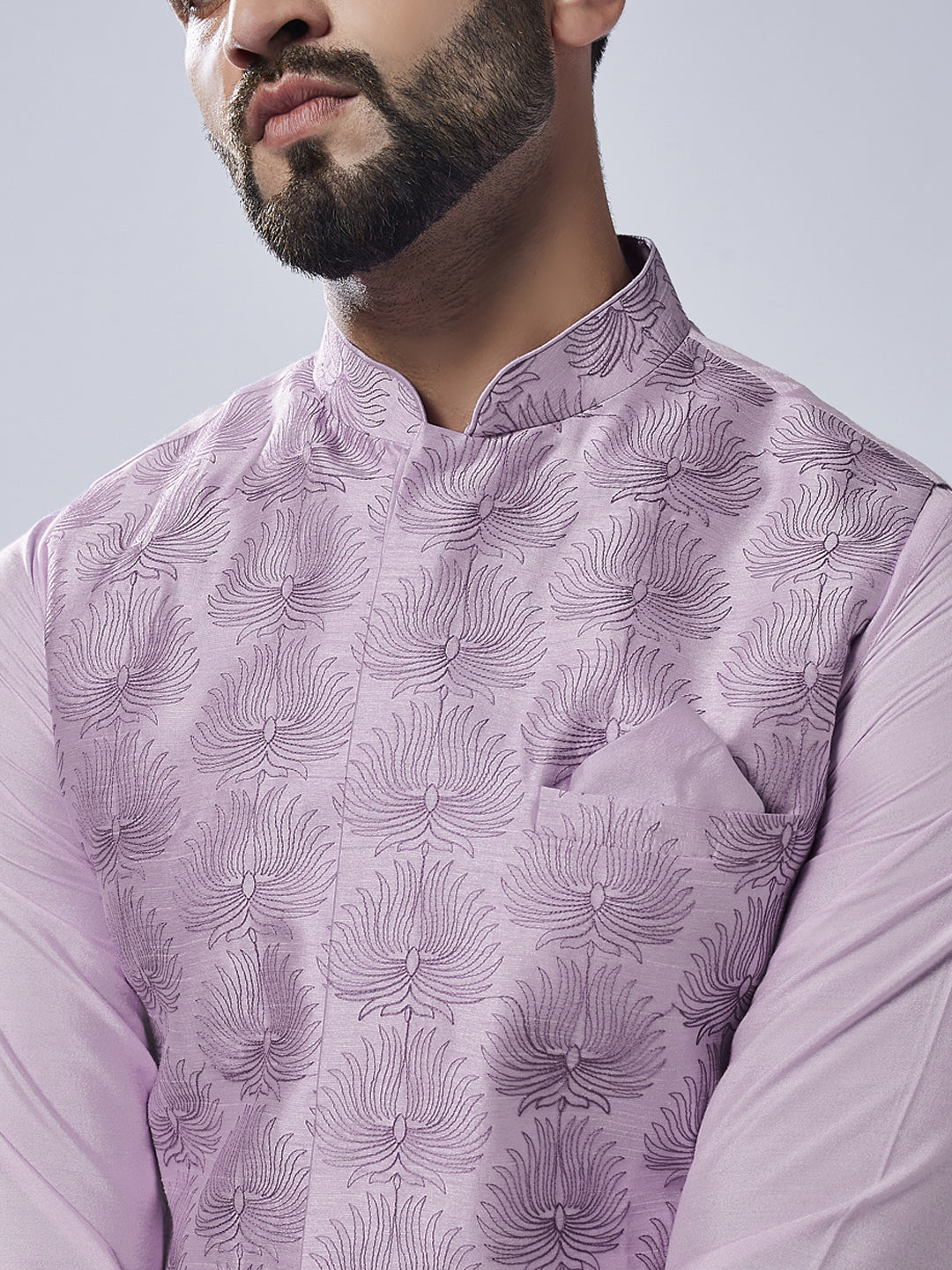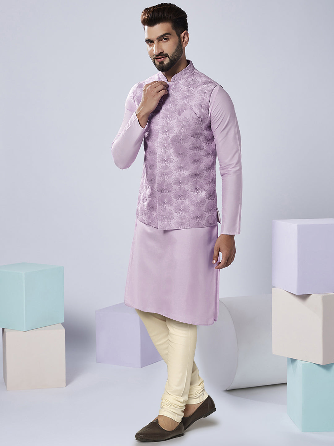 This Kurta Jacket Set with Lavender Color is an elegant mandarin collar style that is perfect for occasional wear. With a full sleeve Embroidered design and comfortable fabric, it will make you look stylish.