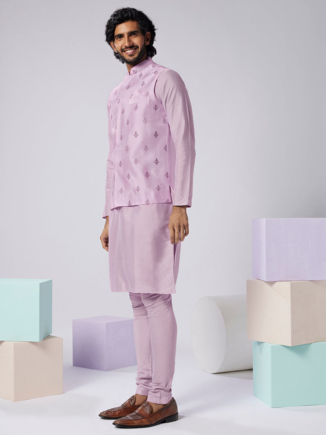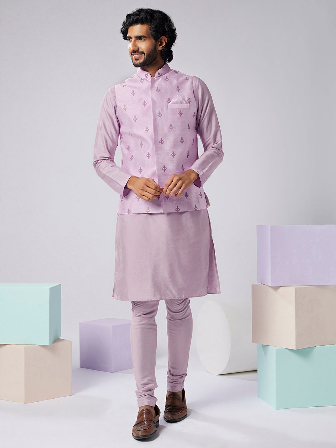 This Kurta Jacket Set with Lavender Color is an elegant mandarin collar style that is perfect for occasional wear. With a full sleeve Embellished design and comfortable fabric, it will make you look stylish.