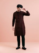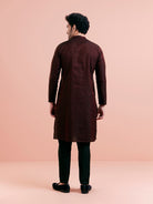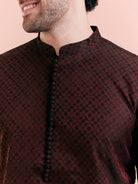 This maroon and black silk blend jacquard kurta features a textured design and regular fit. Perfect for festive events, it combines elegance with comfort for a standout traditional look.