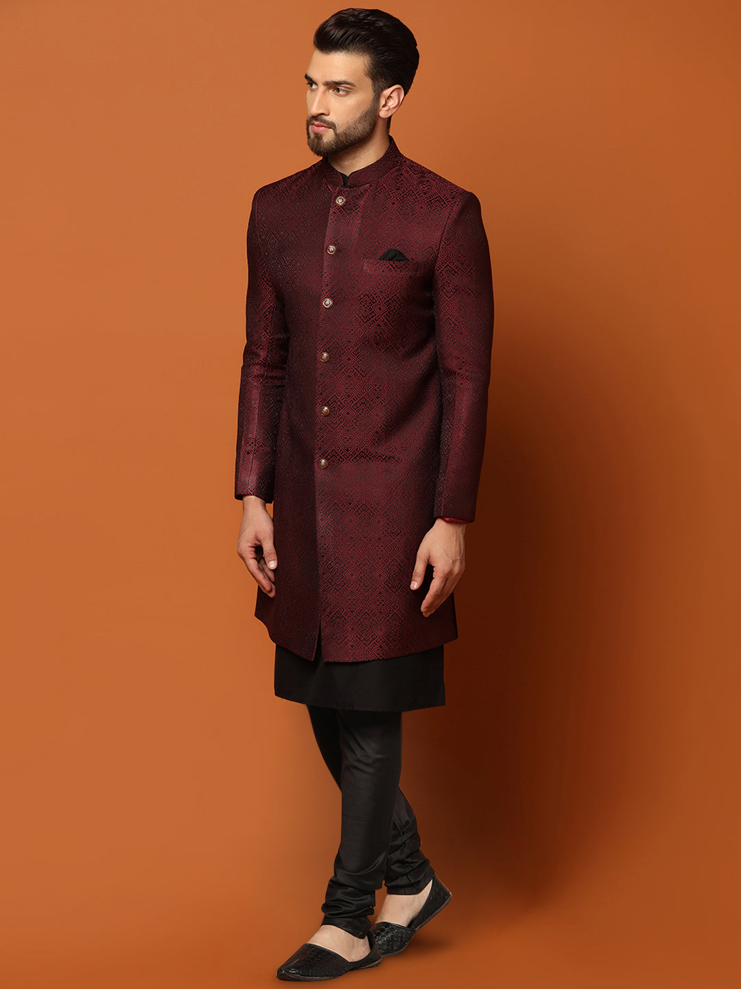 Showcase your refined taste with this maroon silk blend jacquard kurta, Indowestern, and churidar set. The textured design and regular fit make it an excellent choice for cultural events.