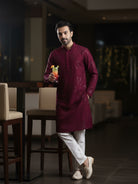 This Kurta Set with Maroon Color is an elegant mandarin collar style that is perfect for occasional wear. With a full sleeve Embroidered design and comfortable fabric, it will make you look stylish.