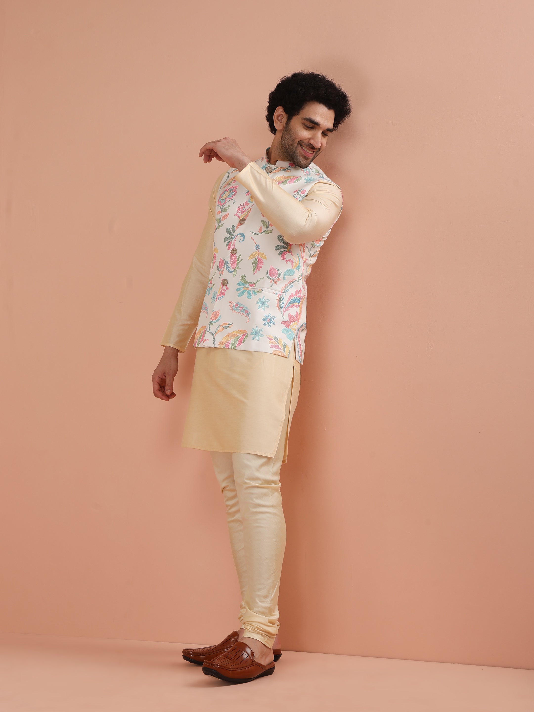 Who doesn't love a splash of color in their wardrobe? This vibrant multi-colored jacket is designed to make your ethnic looks even more dashing. Crafted from a soft cotton blend, it offers a perfect balance of style and comfort. The striking printed design adds a playful touch, making it ideal for festive celebrations and special occasions. With its regular fit, this jacket effortlessly complements your kurta, giving a fun, bold look.