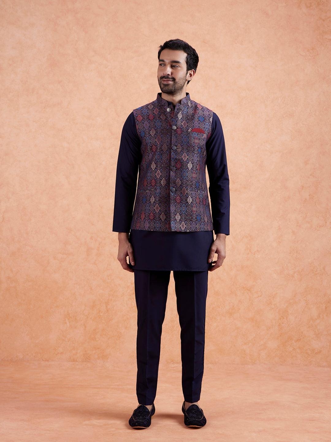 This multi-coloured silk blend jacquard jacket features a woven jacquard pattern and regular fit. Ideal for pairing with kurtas, it adds a vibrant touch to your ethnic wardrobe.