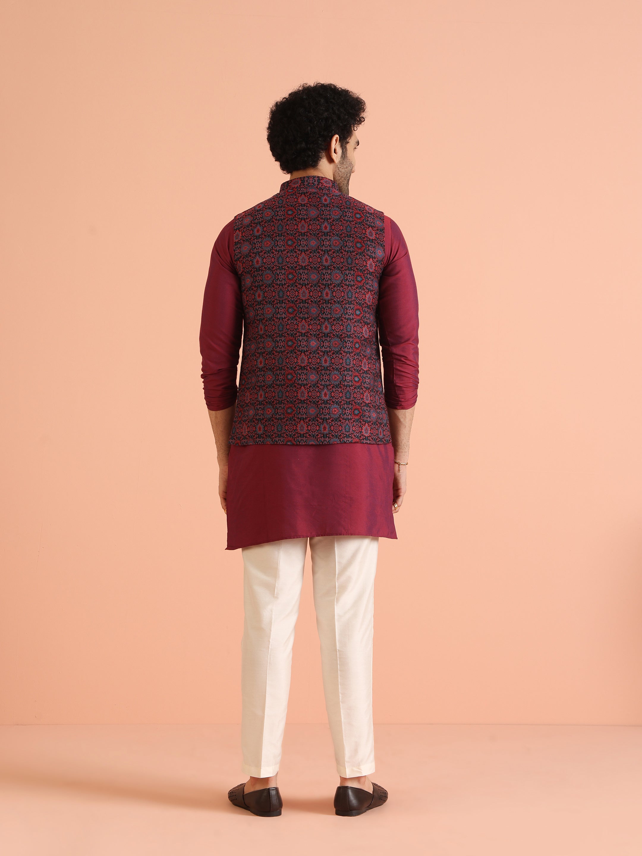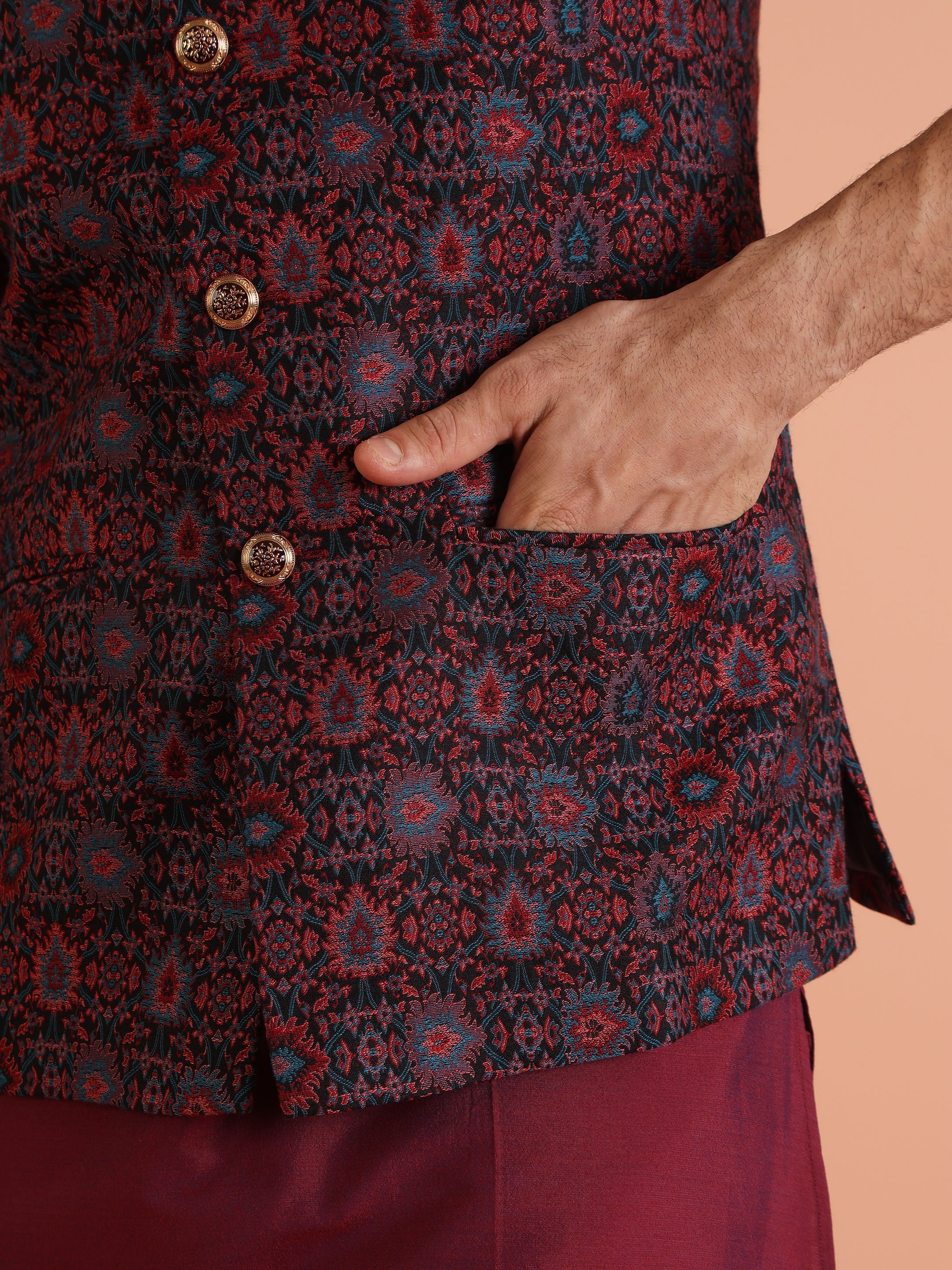 This multi-coloured silk blend jacquard jacket features a woven jacquard design and regular fit. Ideal for festive events, it adds vibrancy to your ethnic outfits.