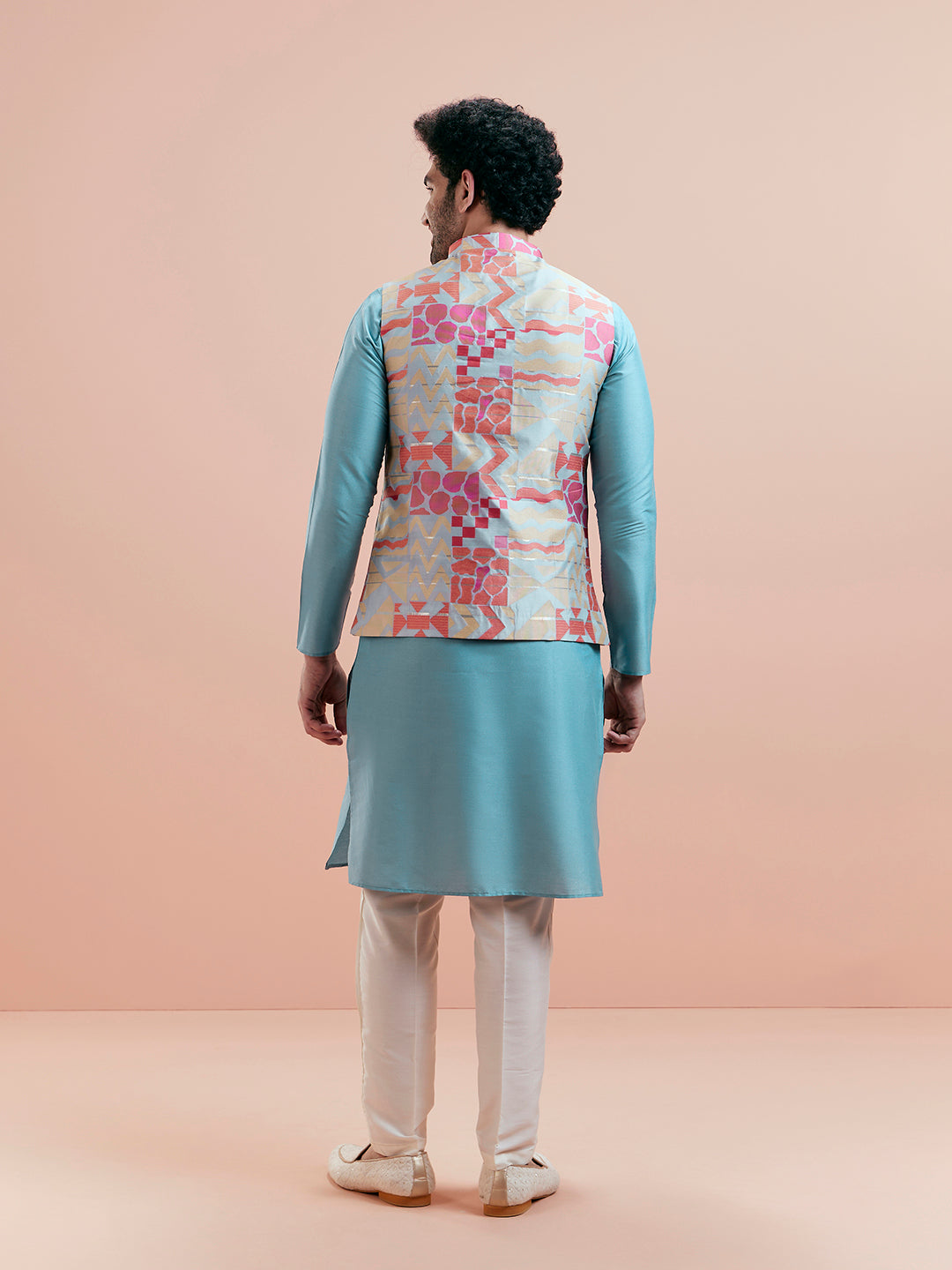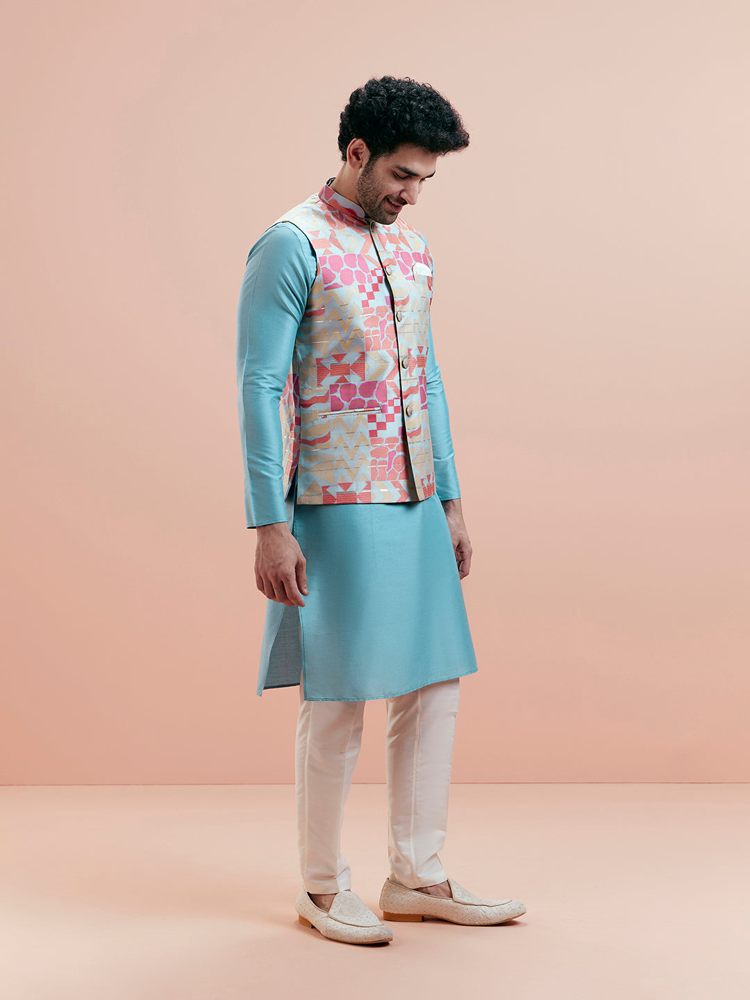 This multi-coloured silk blend jacket features a textured design and regular fit. Ideal for pairing with kurtas, it adds a vibrant touch to your ethnic collection.