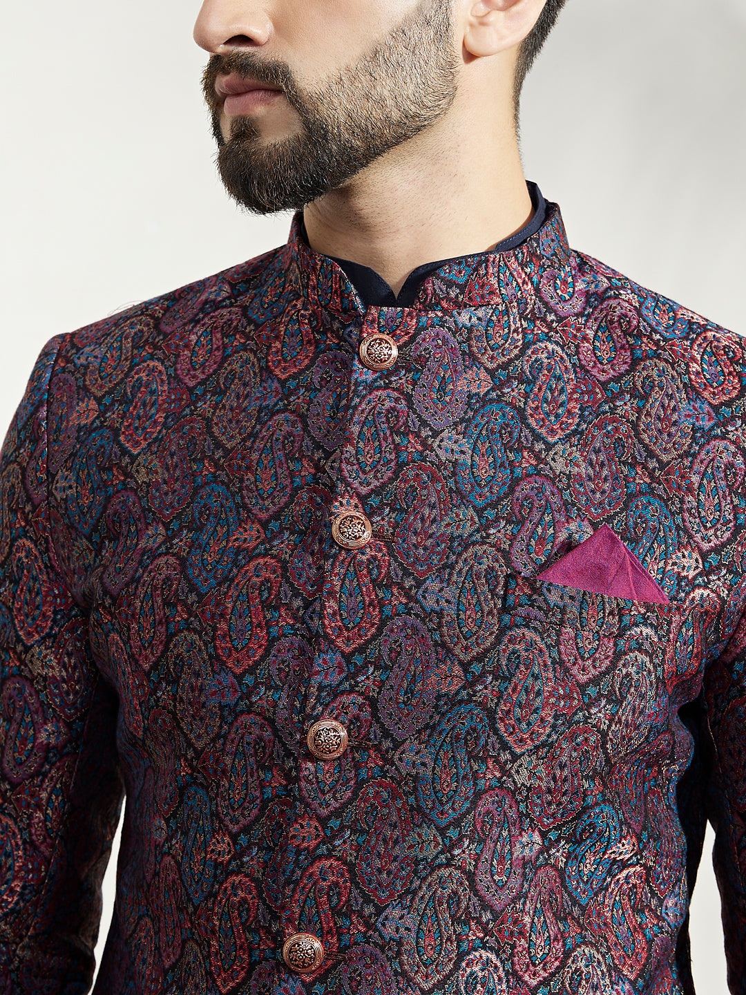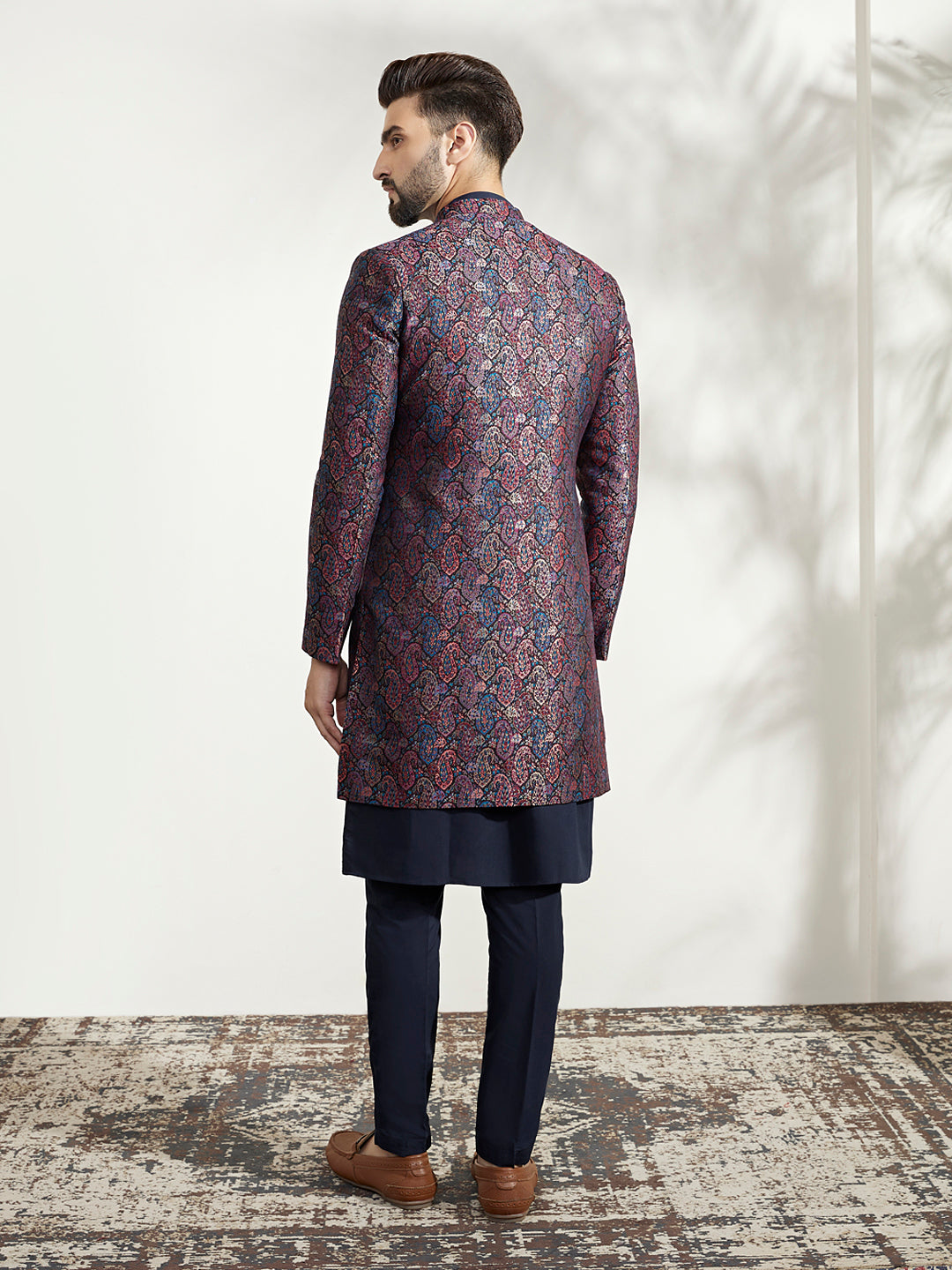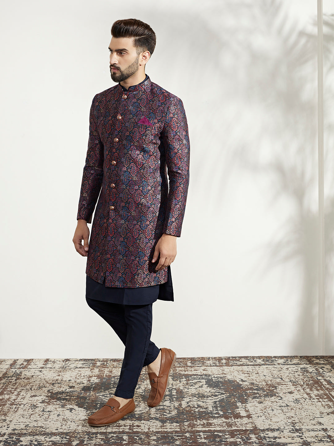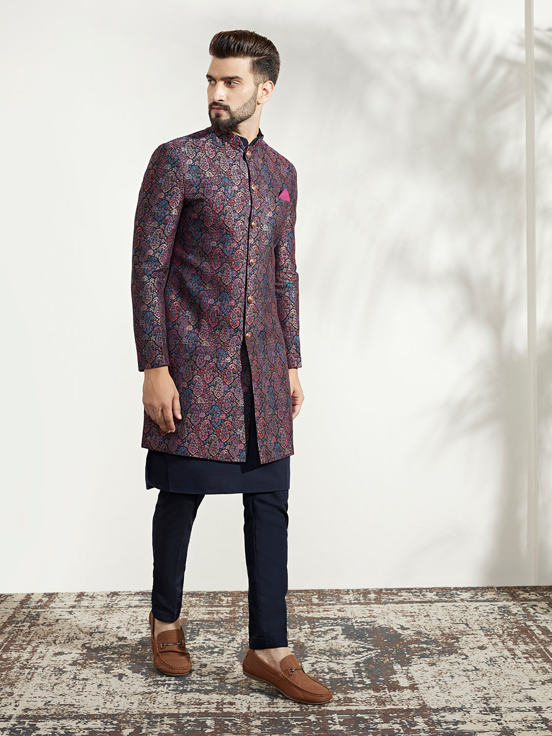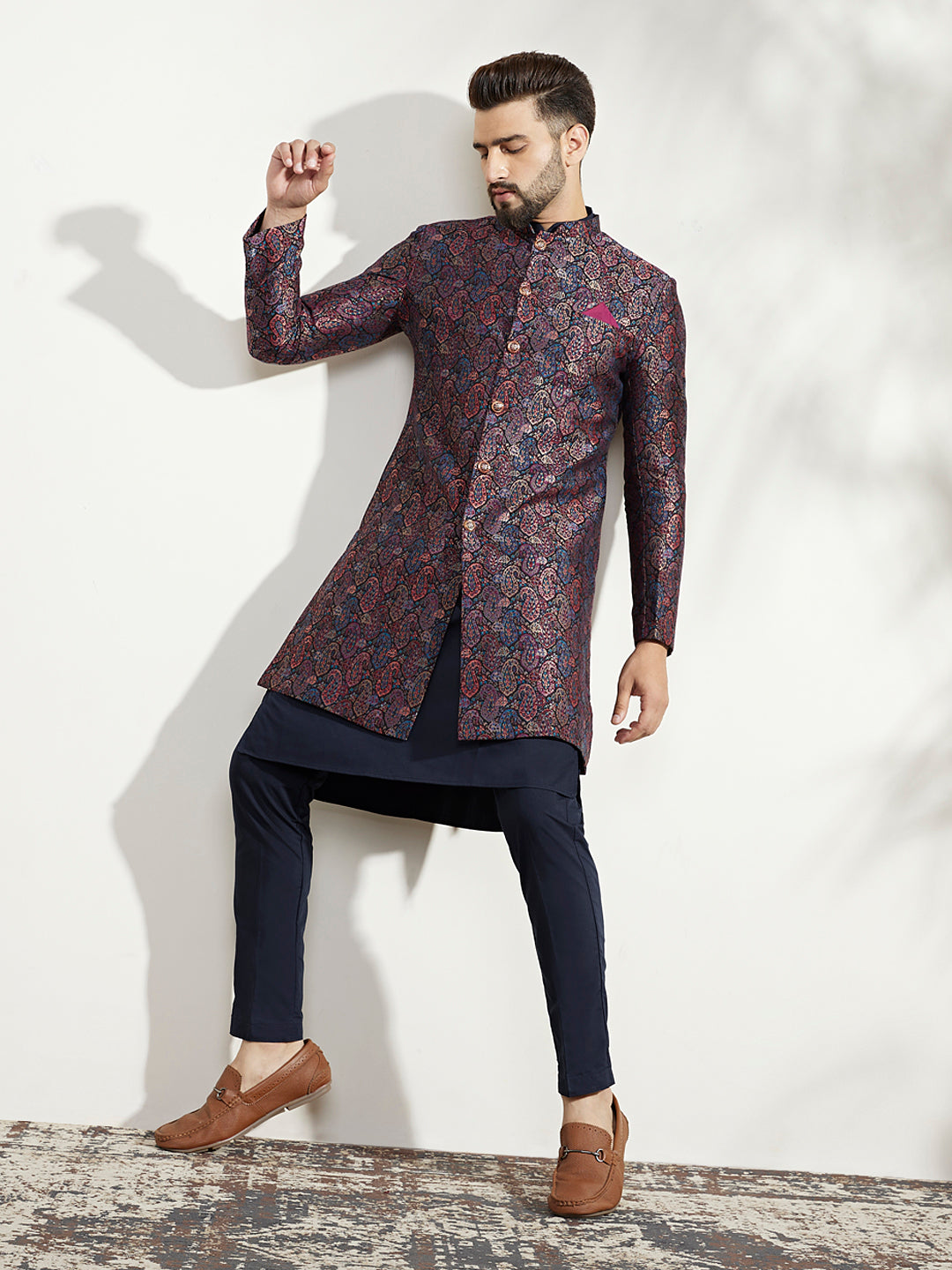 Your perfect festive outfit might be closer than you think! This multi-colored silk blend jacquard Indowestern trouser set brings together vibrant hues and intricate textures. The fabric’s rich design adds a playful yet sophisticated touch, while the regular fit ensures comfort and style for every celebration.