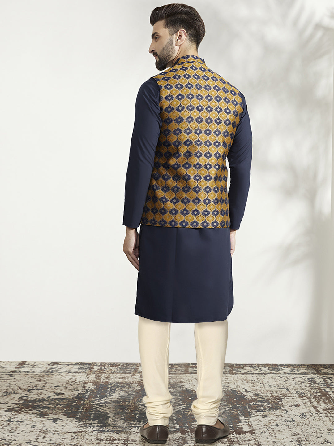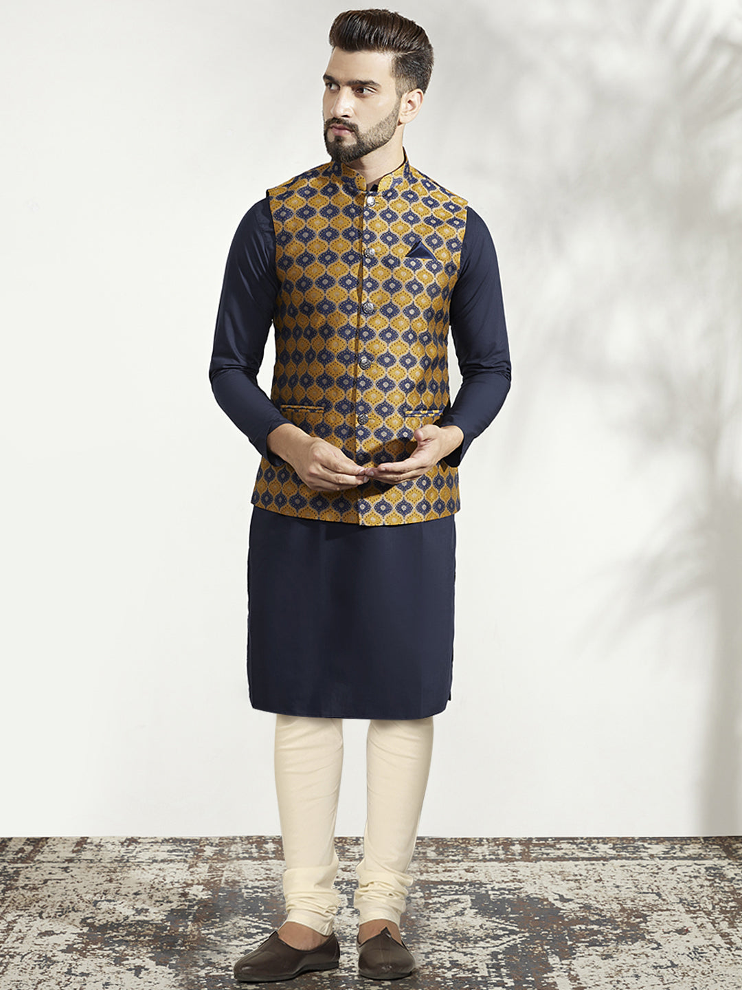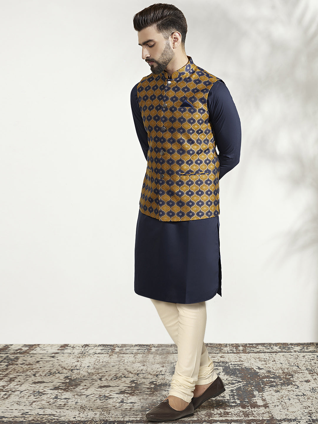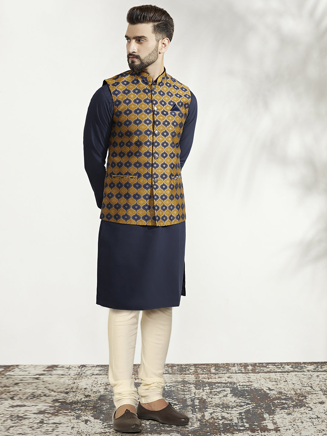 This Kurta Jacket Set with Mustard Color is an elegant mandarin collar style that is perfect for occasional wear. With a full sleeve Woven Design design and comfortable fabric, it will make you look stylish.