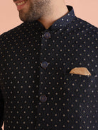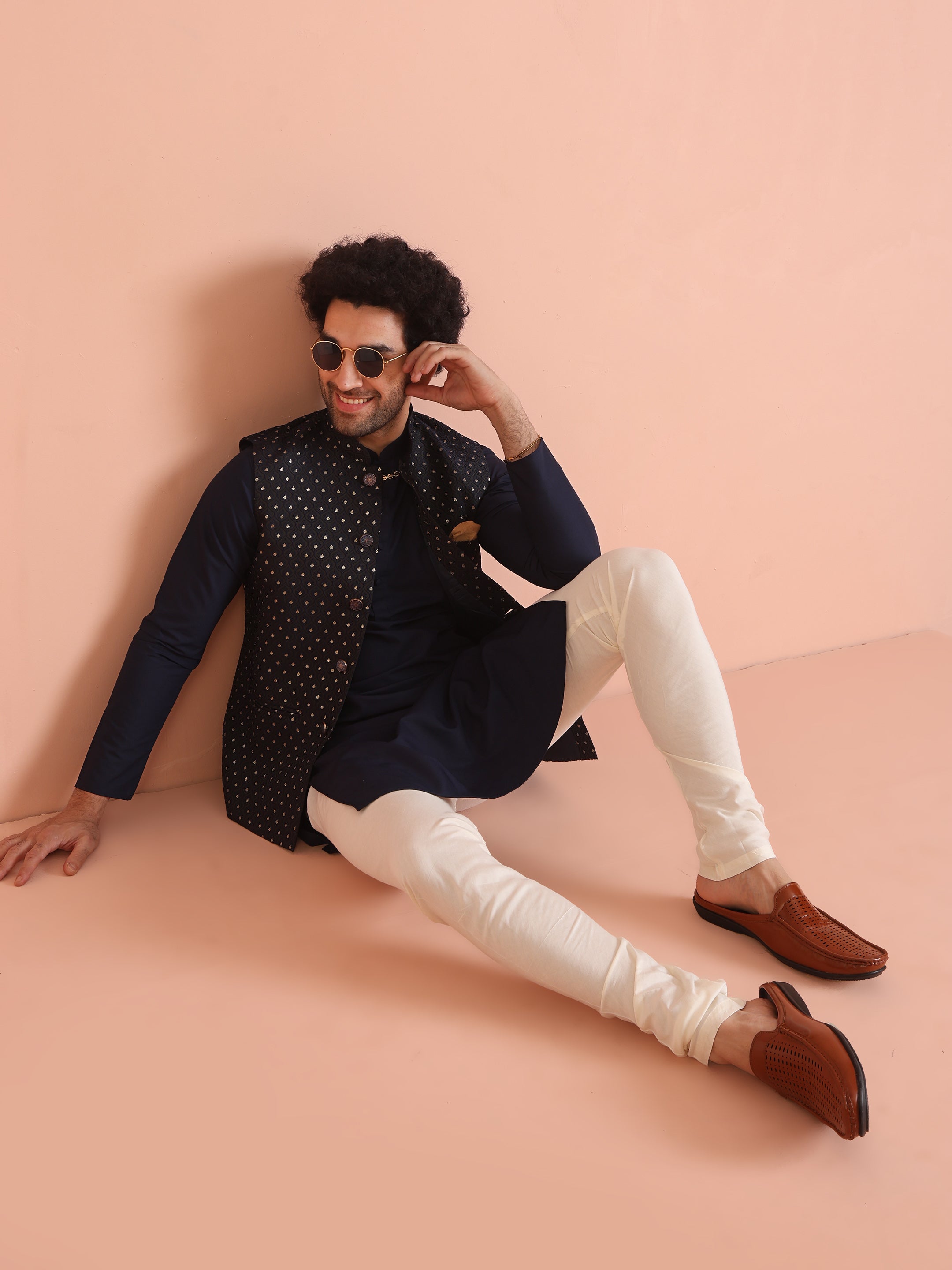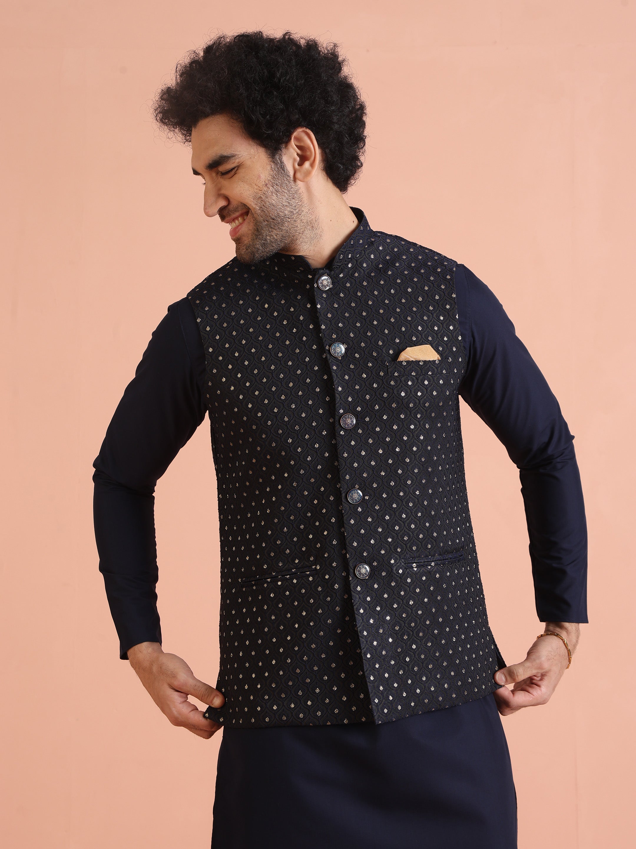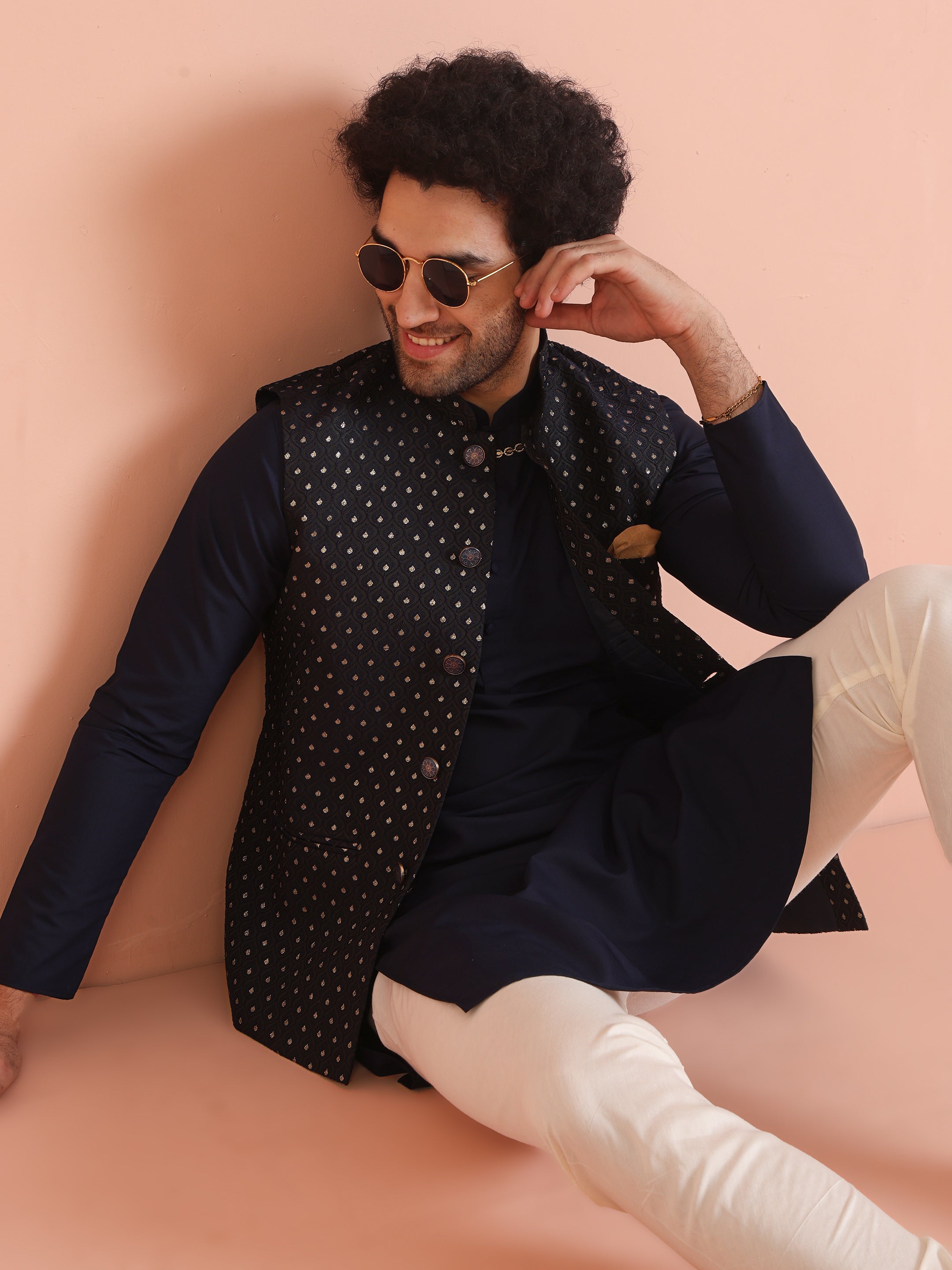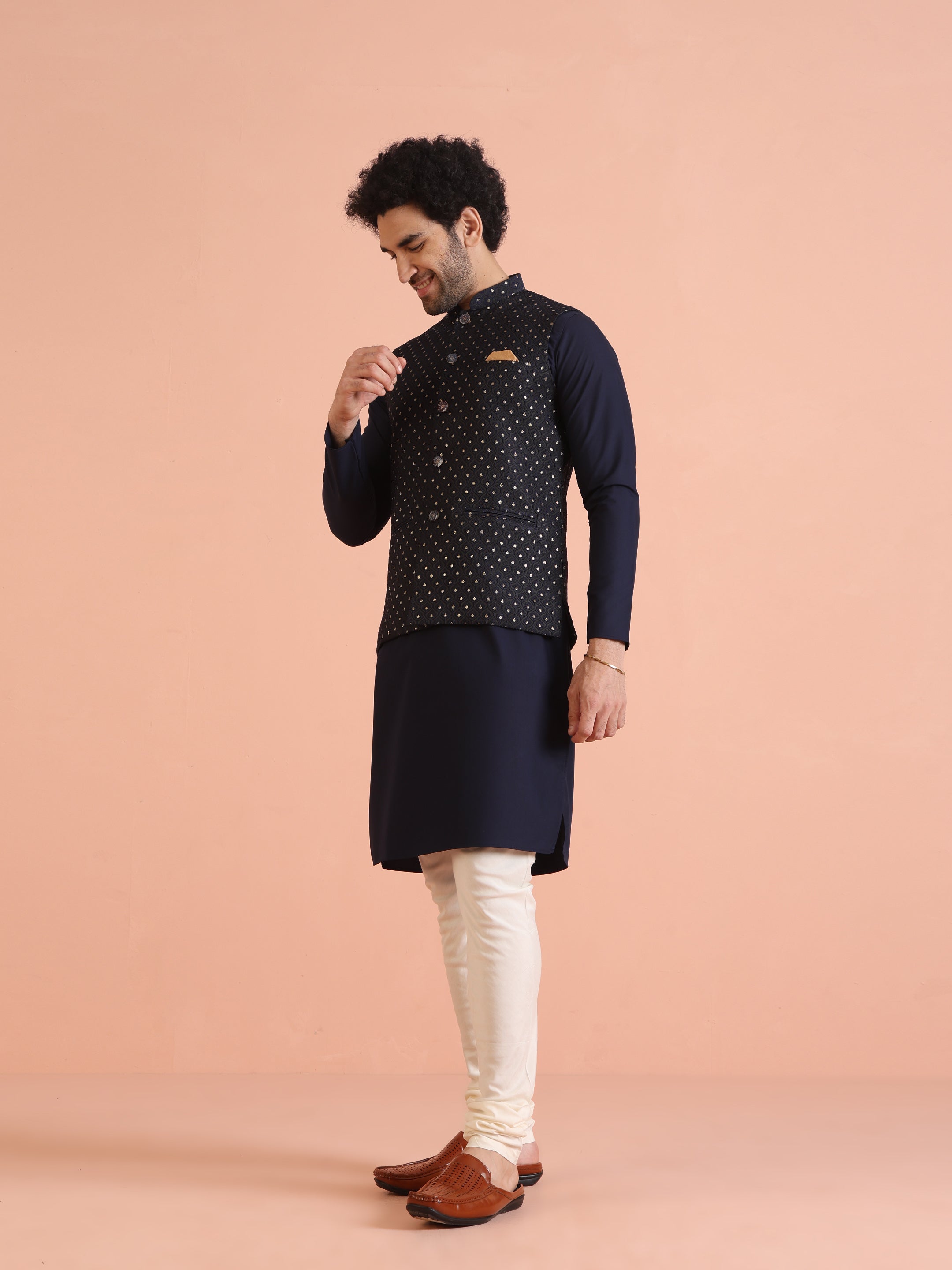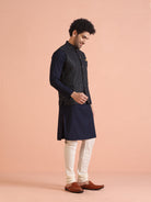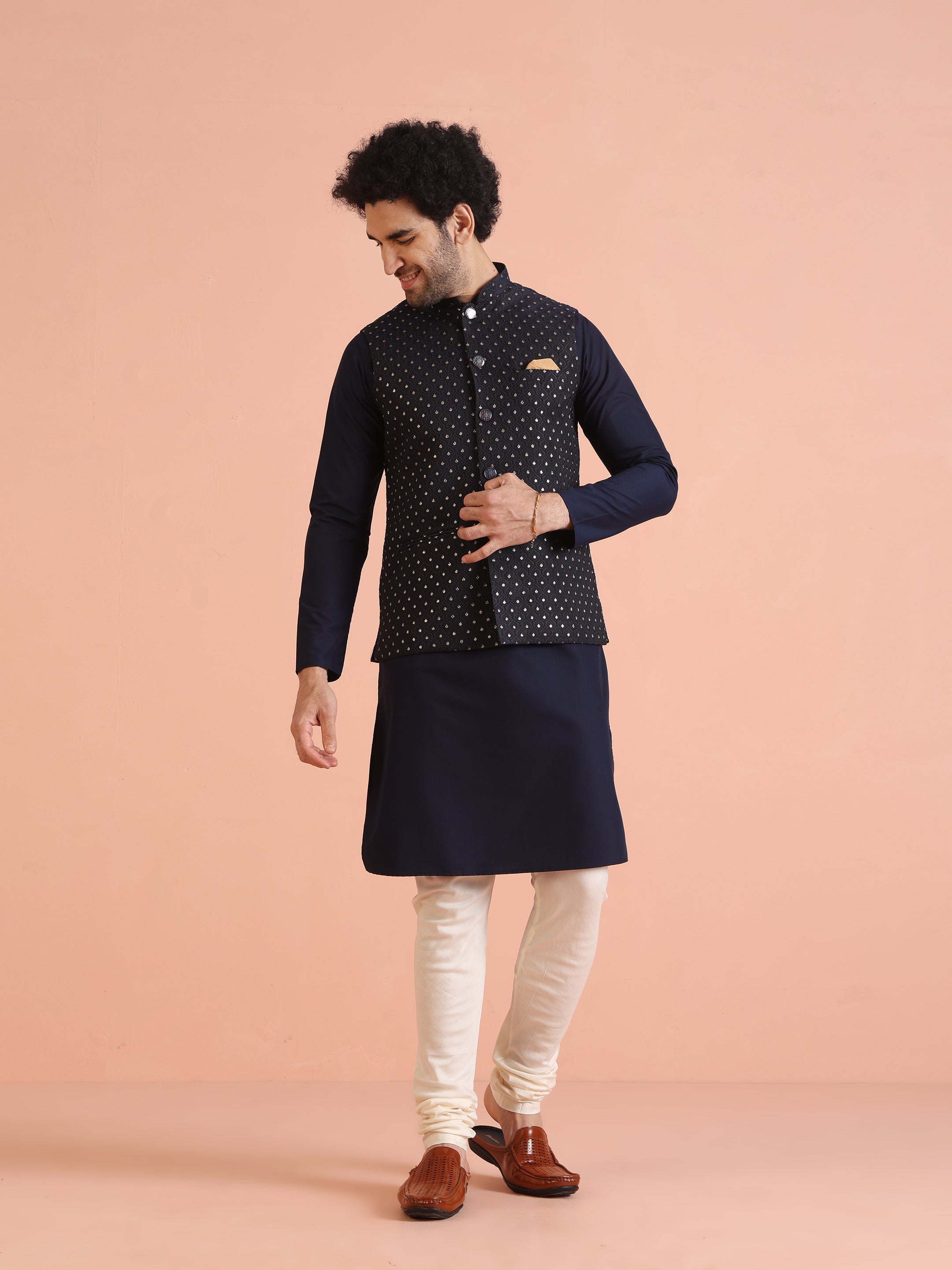 This navy blue silk blend jacquard kurta, jacket, and churidar set features embellished details and a regular fit. Ideal for festive occasions, it offers a blend of elegance and comfort.