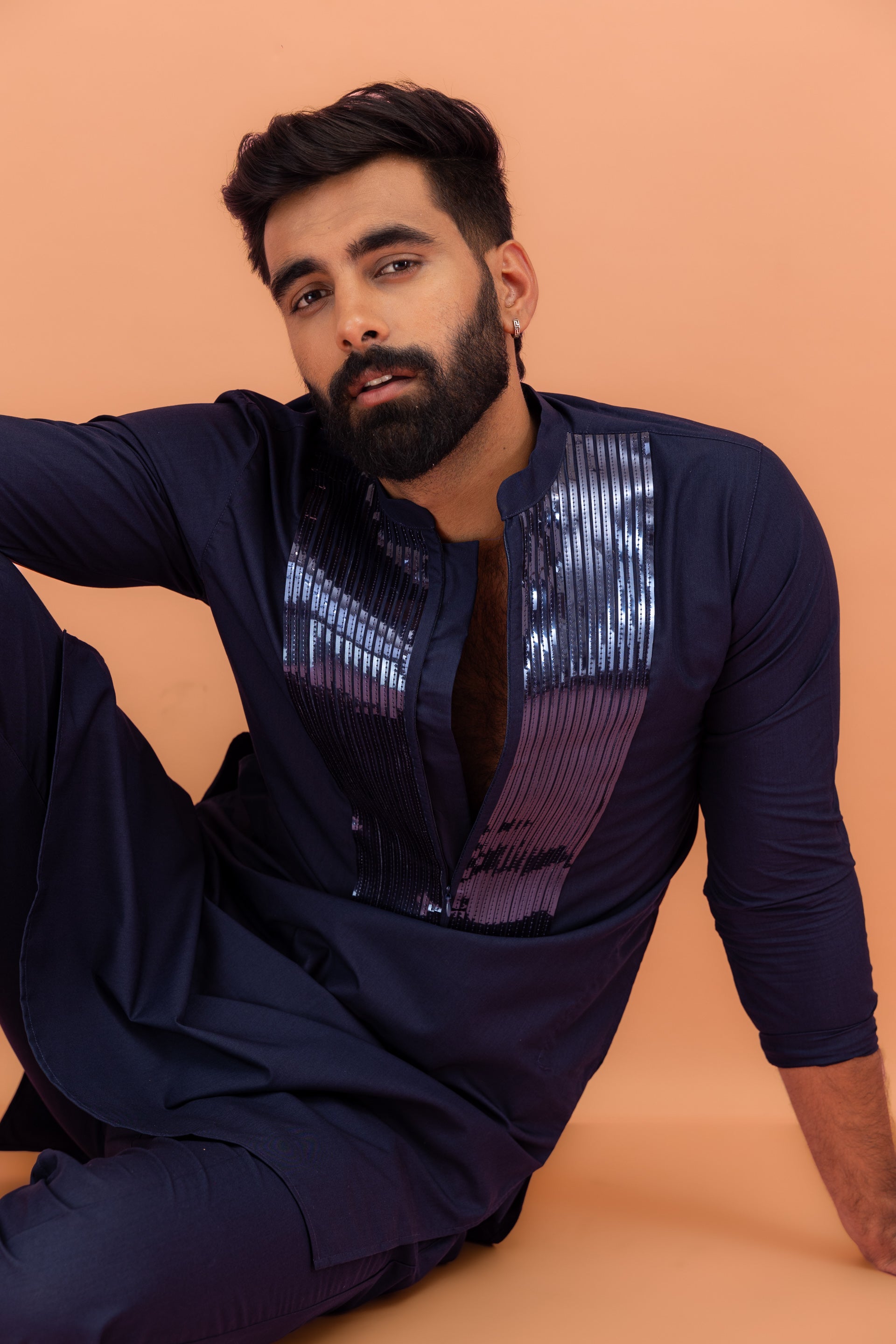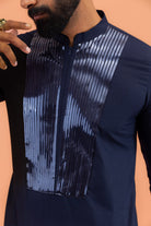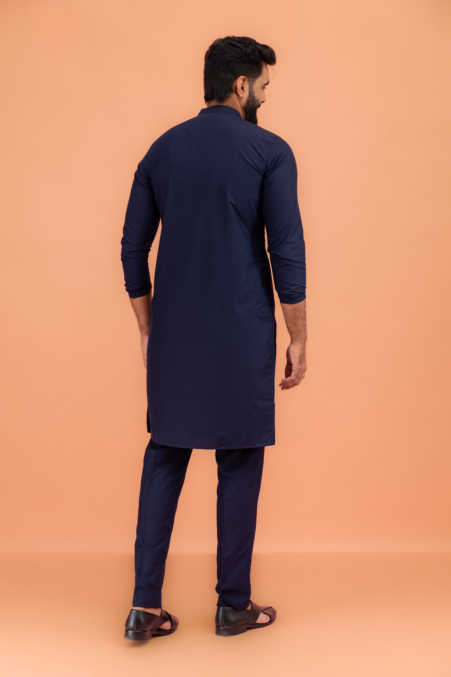 This Kurta Set with Navy Blue Color is an elegant mandarin collar style that is perfect for occasional wear. With a full sleeve Ethnic Motifs design and comfortable fabric, it will make you look stylish.