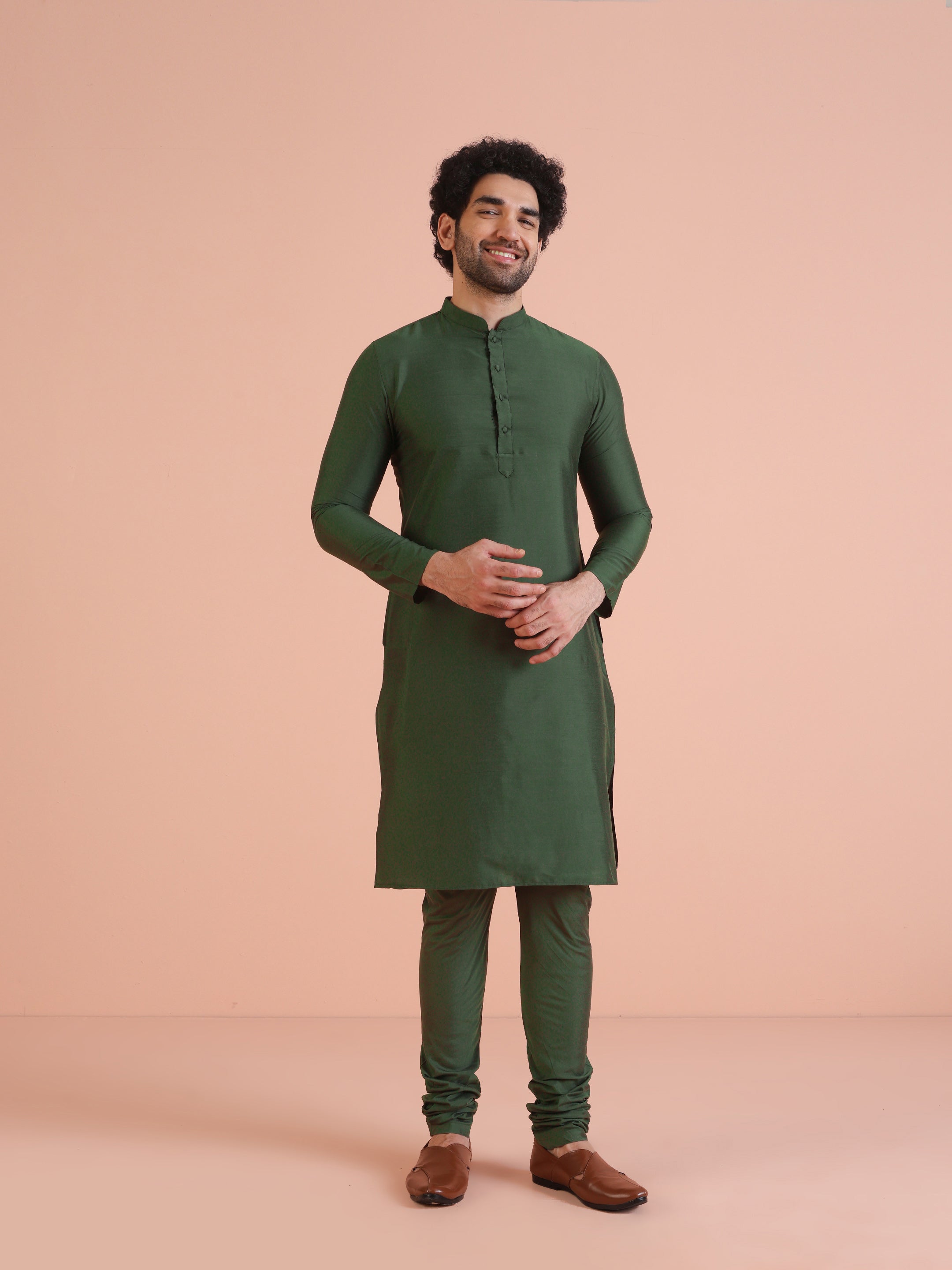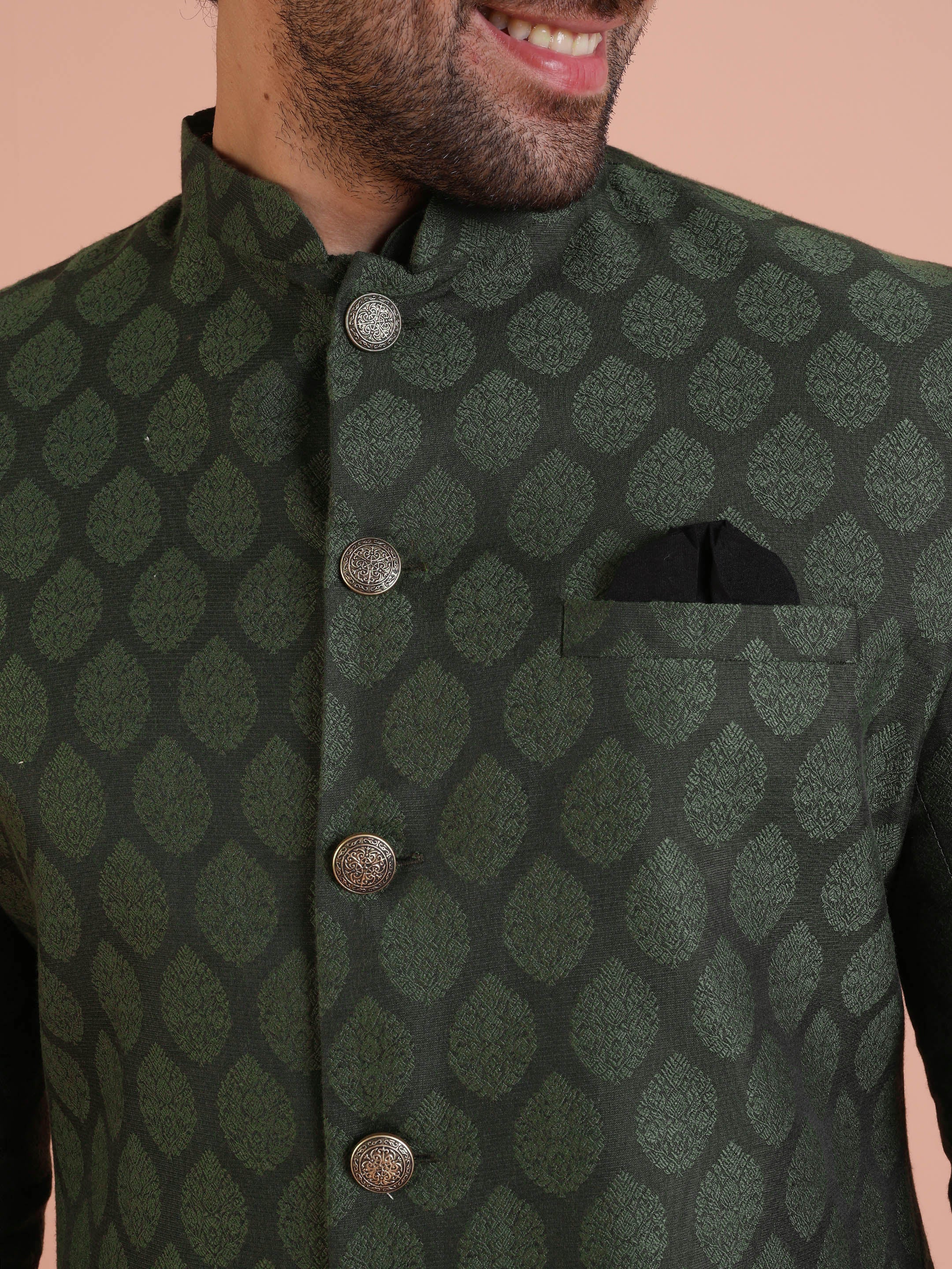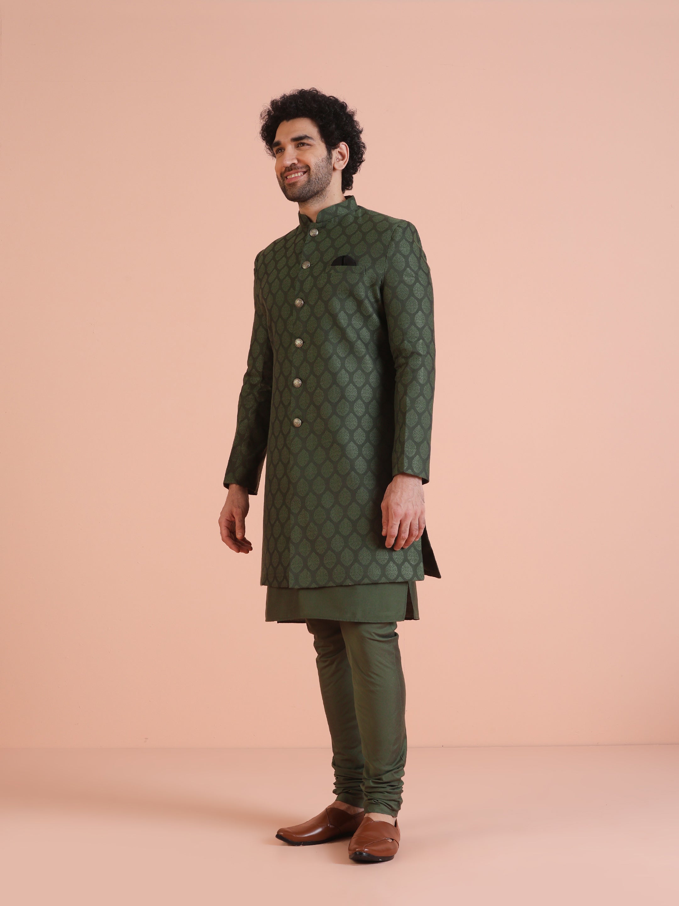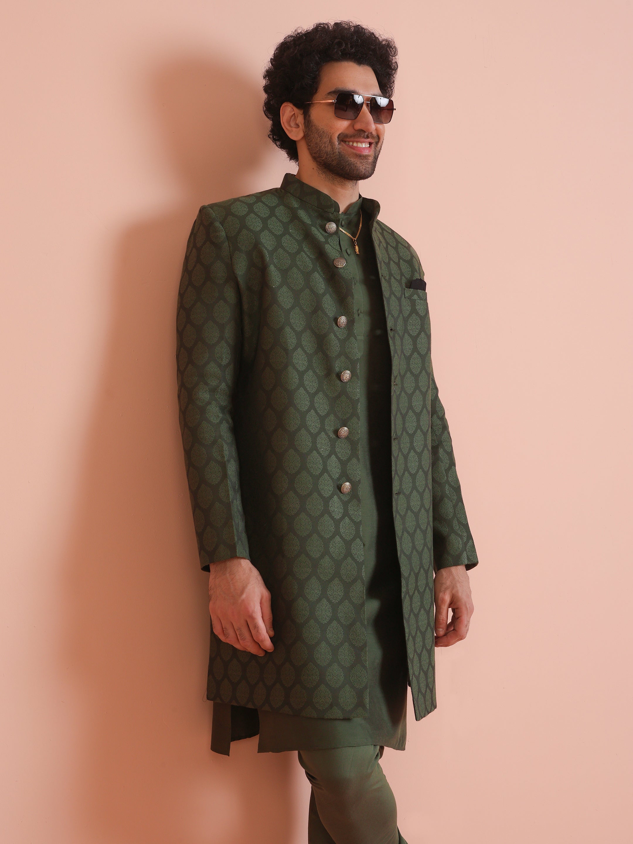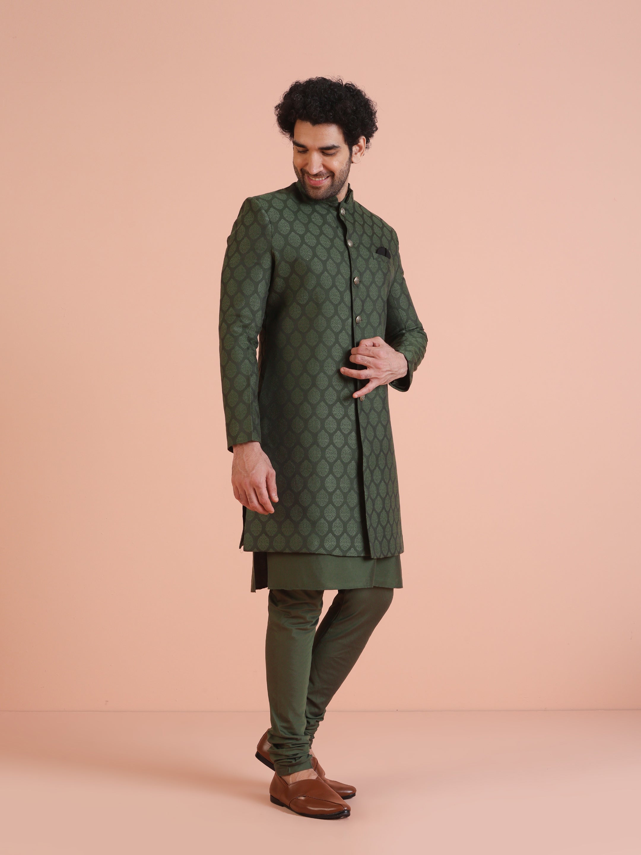Step up your style game with this elegant Indowestern set, crafted in a refined olive color. Featuring a mandarin collar and full sleeves, this set offers a perfect blend of tradition and modernity. The silk blend fabric ensures a luxurious feel, while providing comfort throughout the day. This set, which includes a kurta, Indowestern jacket, and bottomwear, is tailored for formal occasions, weddings, and festive events. Make a bold yet sophisticated statement with this versatile ensemble, designed to make you stand out in every crowd.