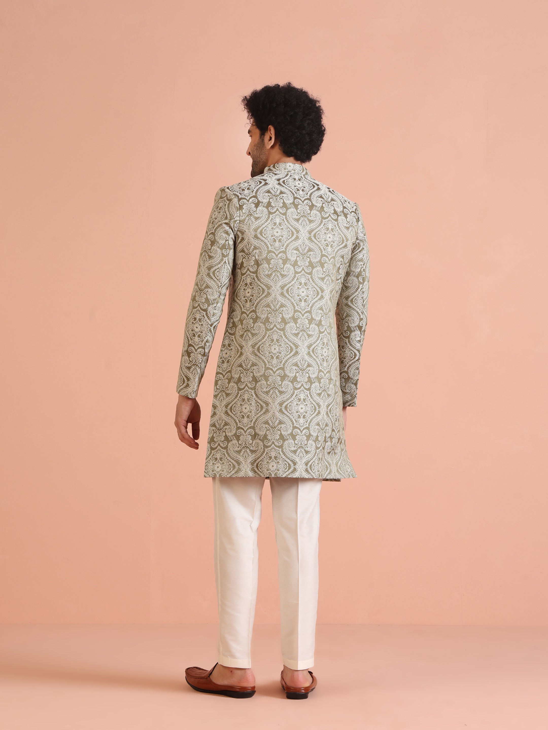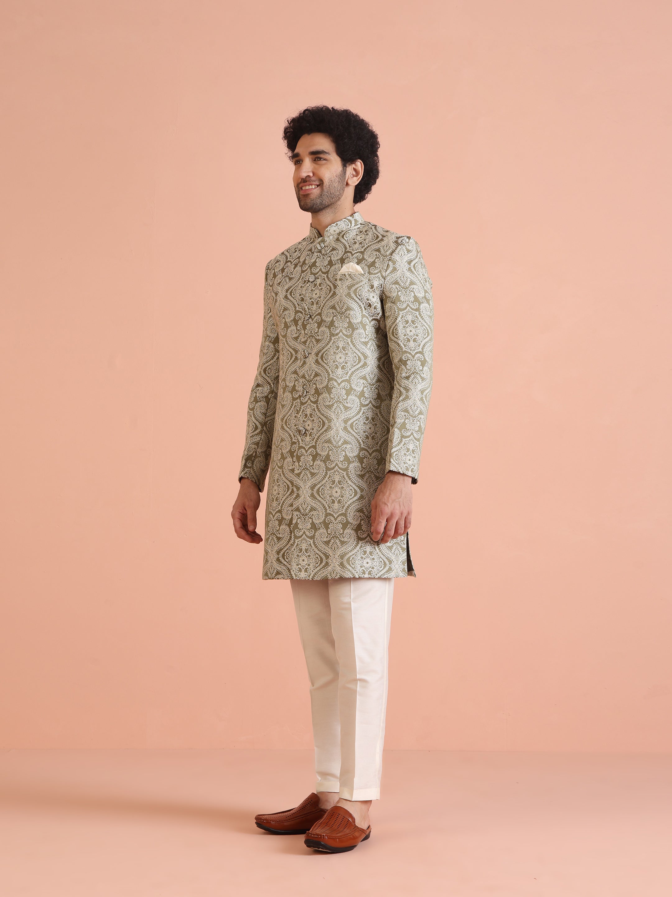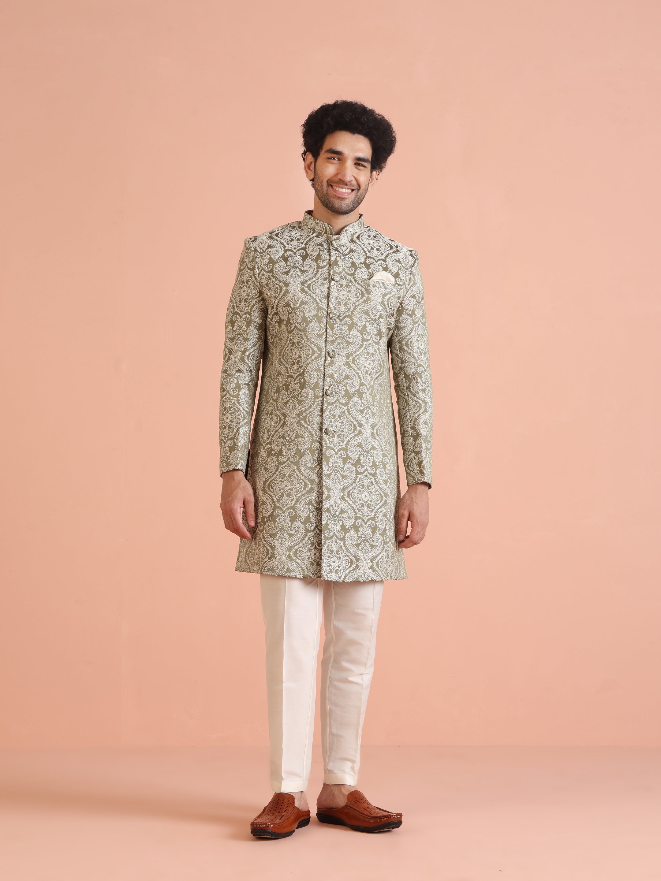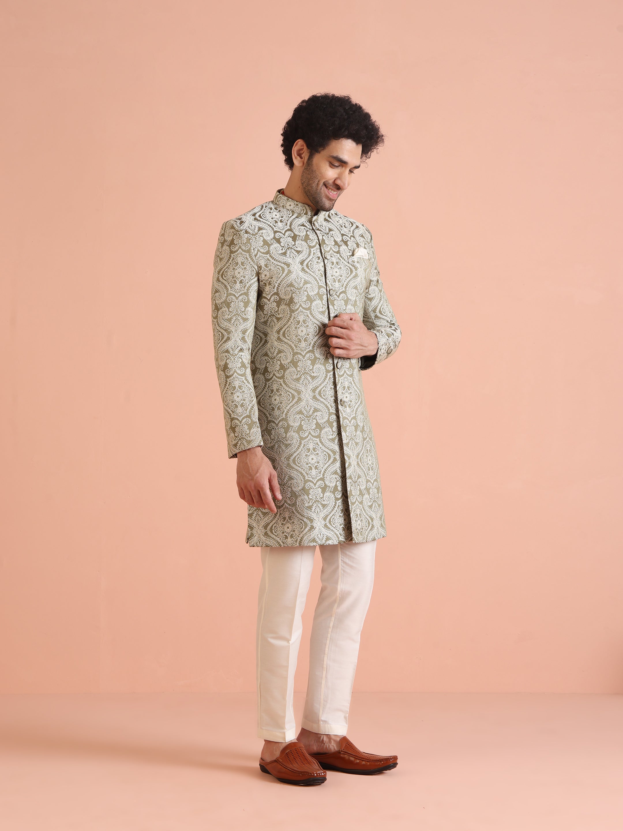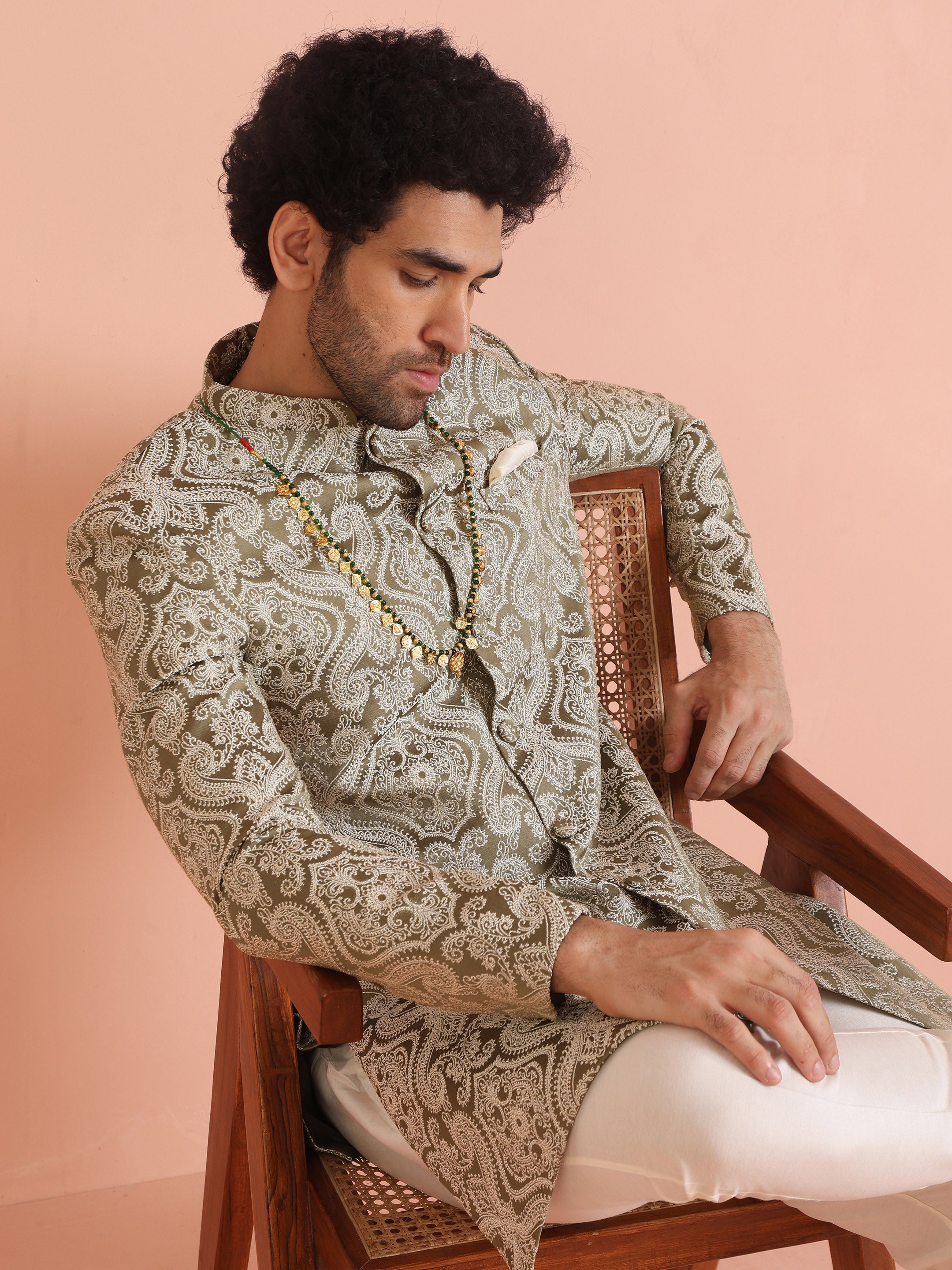 This Indowestern set is an elegant mandarin collar style that is perfect for occasional wear. With a full sleeve design, Olive colour and Silk Blend fabric, it will make you look stylish. Featuring a Indowestern & Bottomwear, it is perfect for formal occasions.
