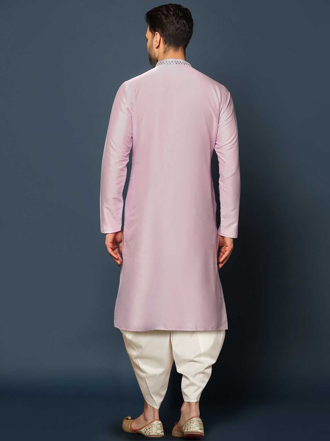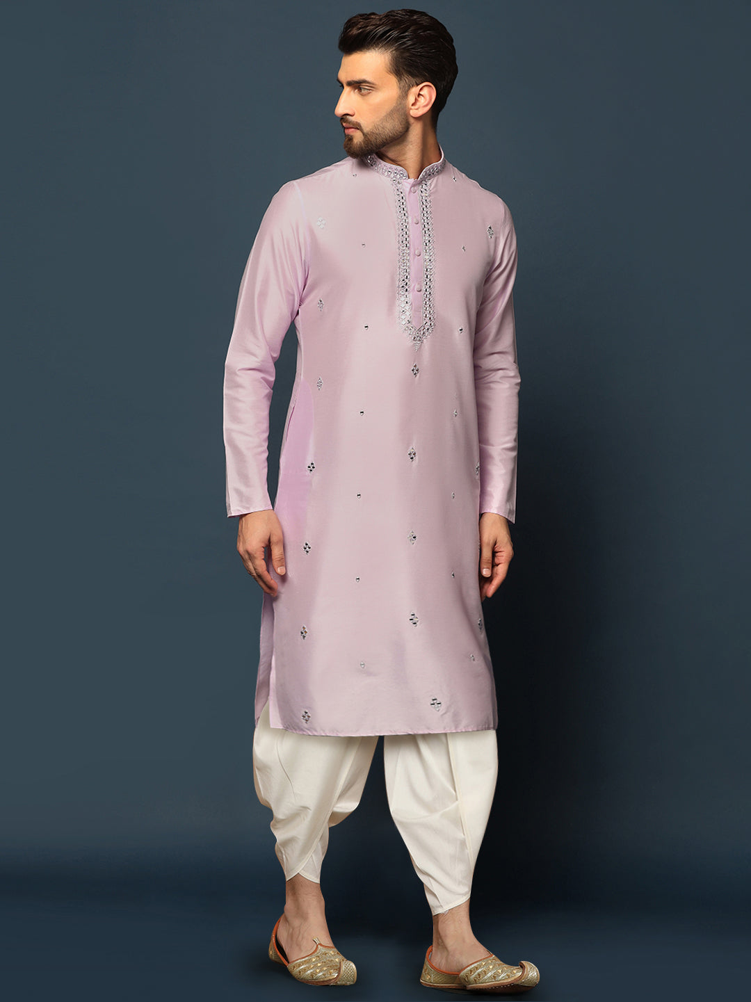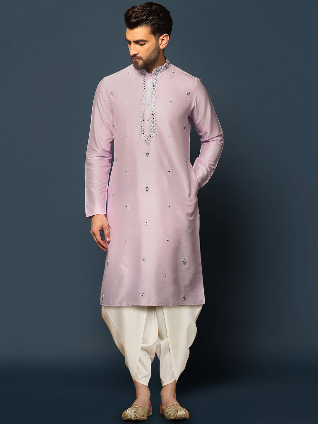 This lilac cotton blend kurta with mirror work embroidery, paired with a dhoti, offers a regular fit and stylish look. Perfect for festive events or traditional gatherings, it combines elegance with comfort.