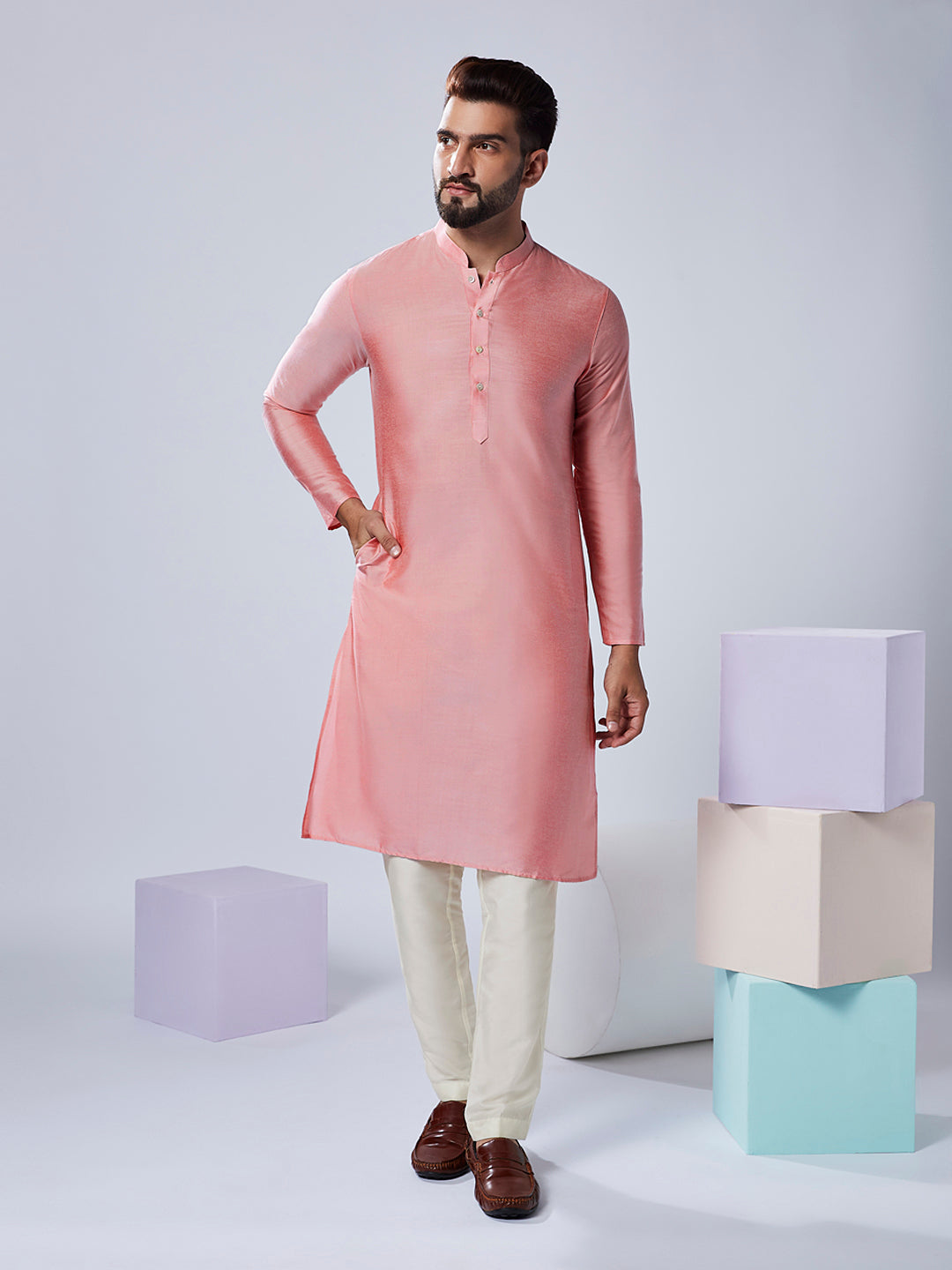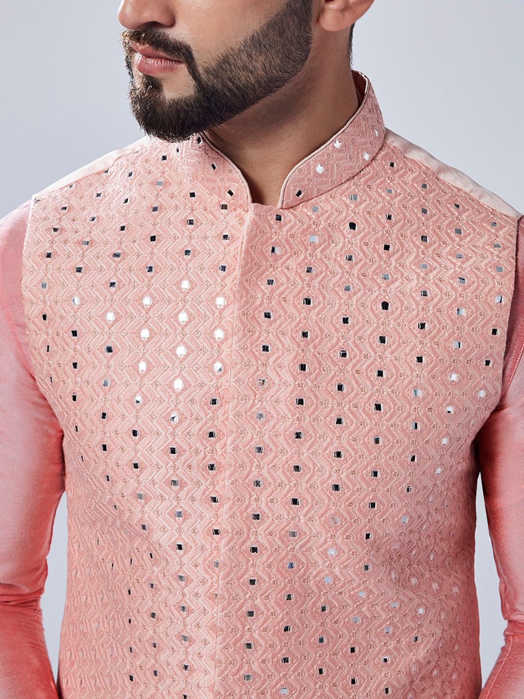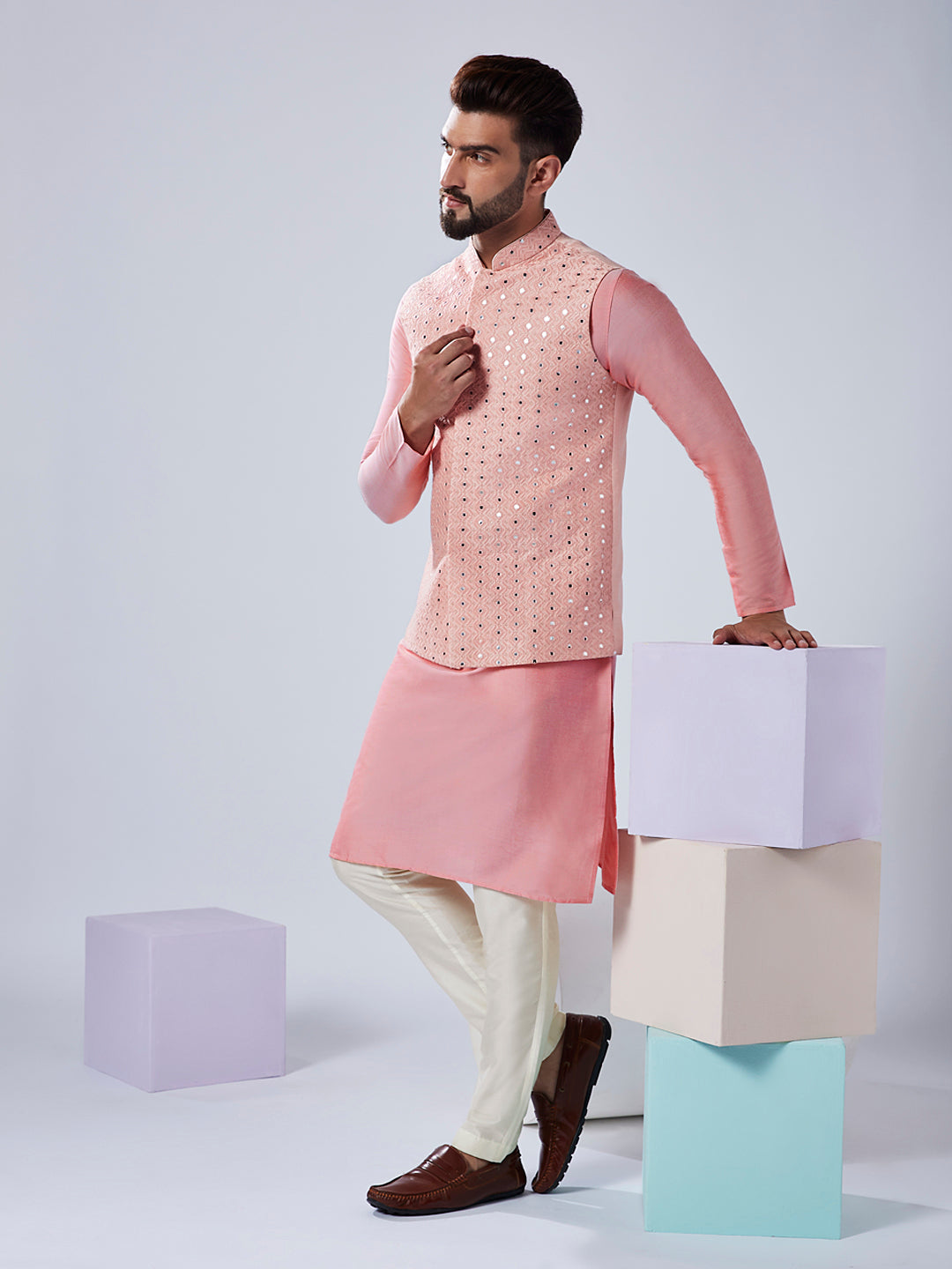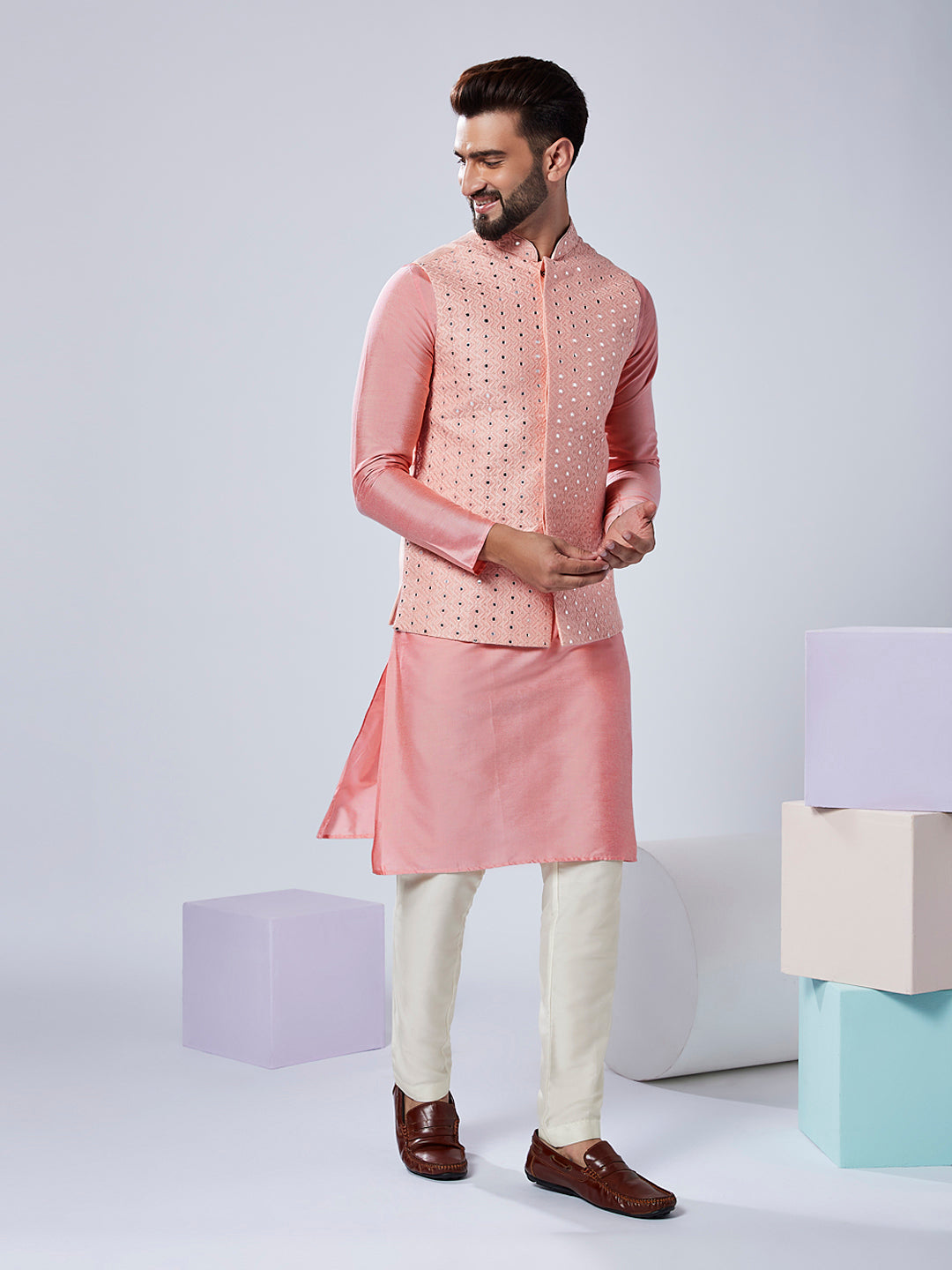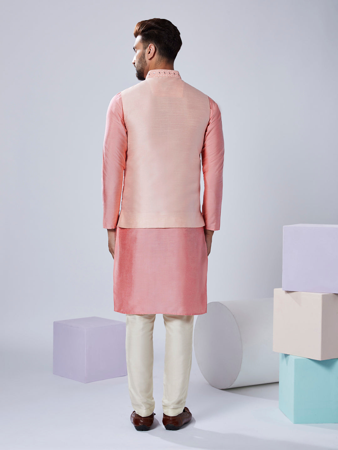 This pink silk blend kurta, jacket, and trouser set features elegant embroidery and a regular fit. Perfect for festive occasions, it combines sophistication with comfort.