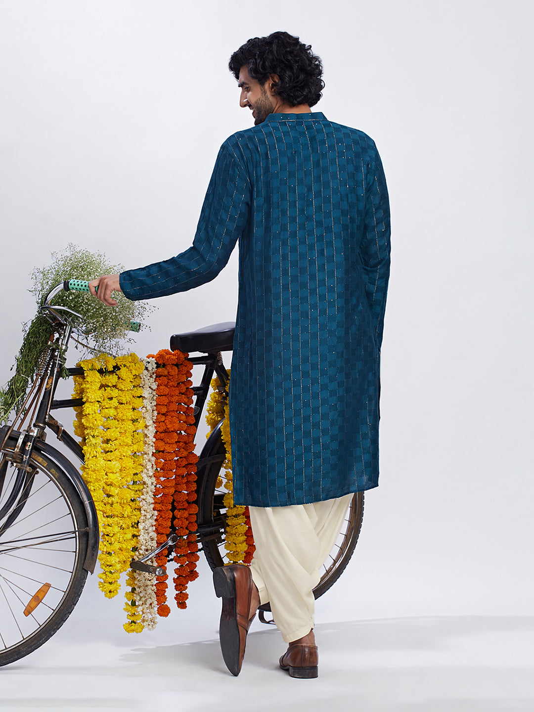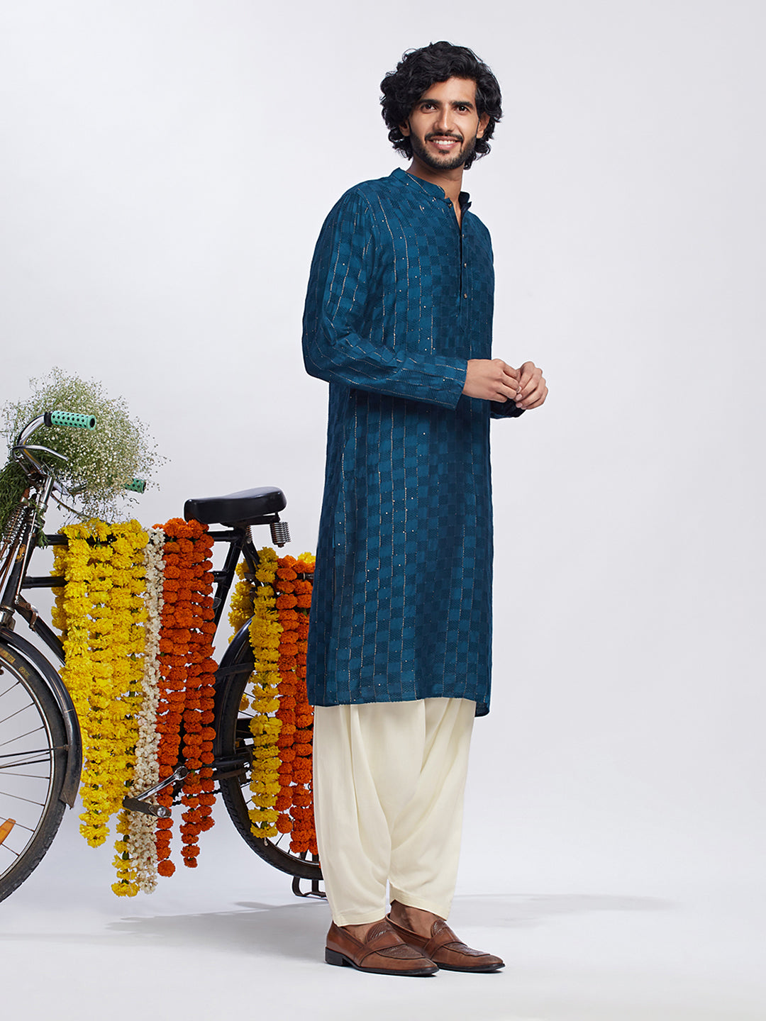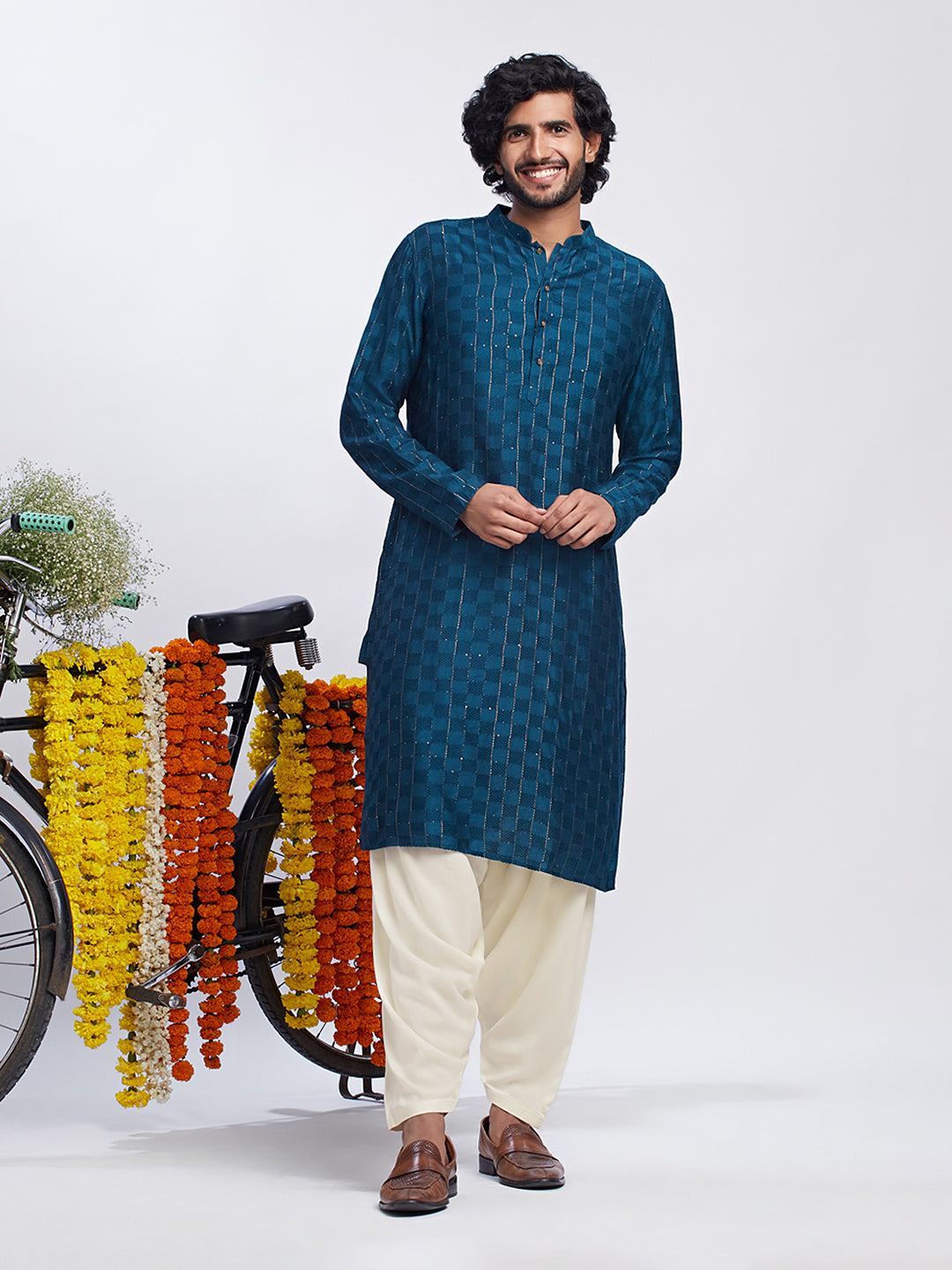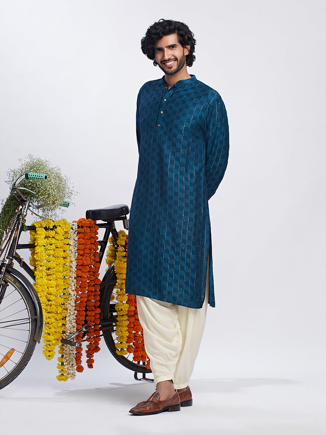 This Kurta Set with Turquoise Blue Color is an elegant mandarin collar style that is perfect for occasional wear. With a full sleeve Ethnic Motifs design and comfortable fabric, it will make you look stylish.
