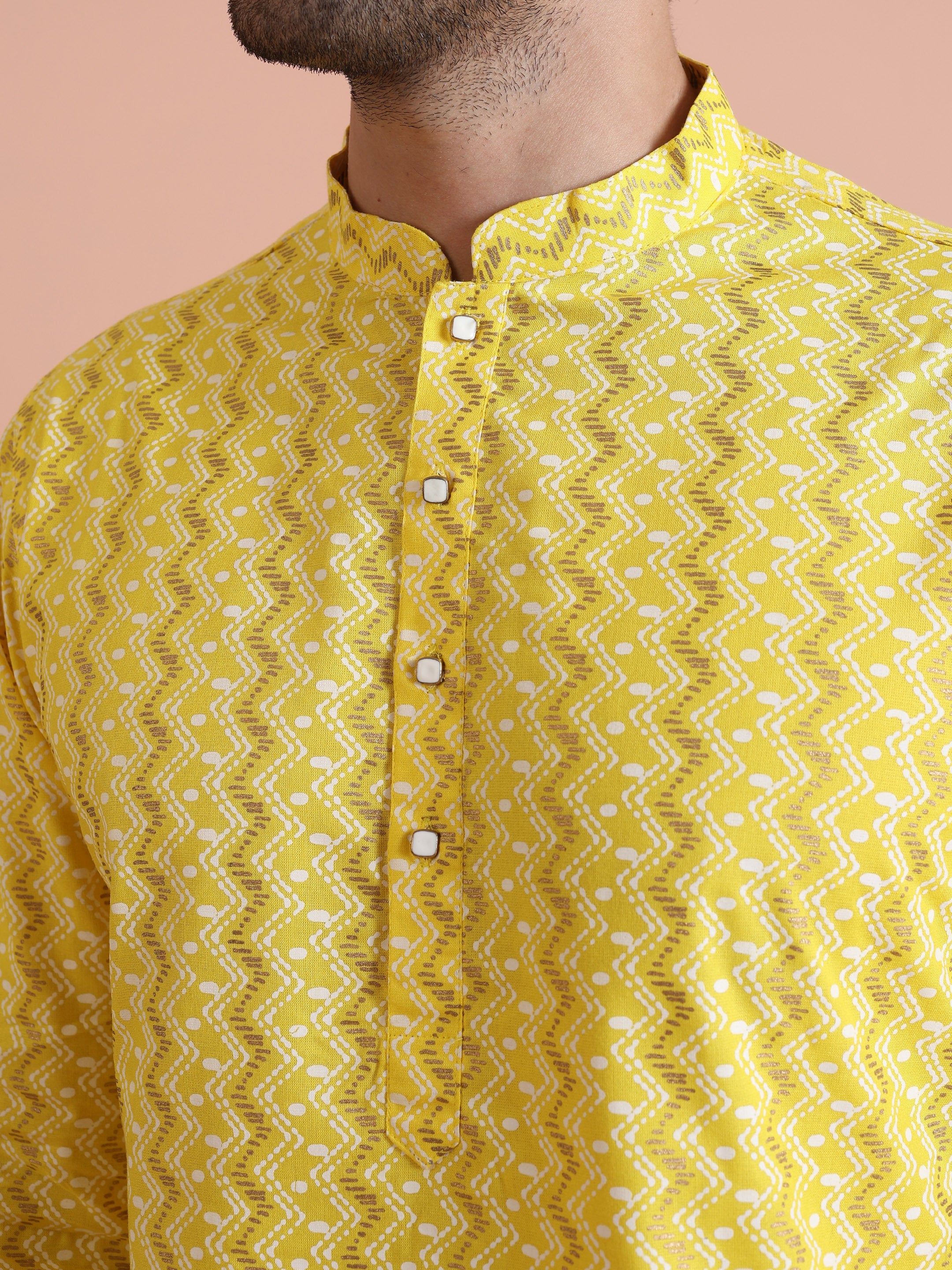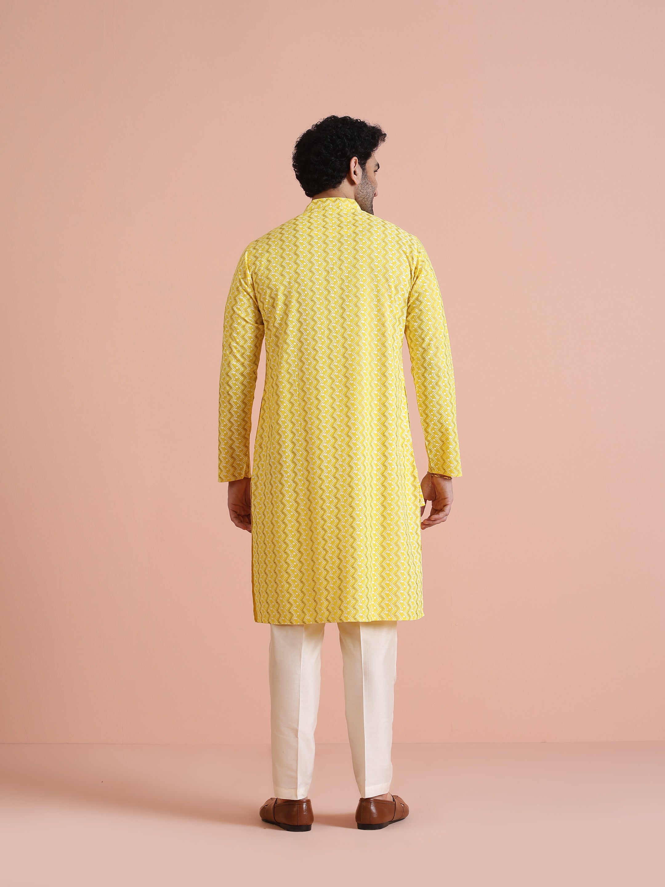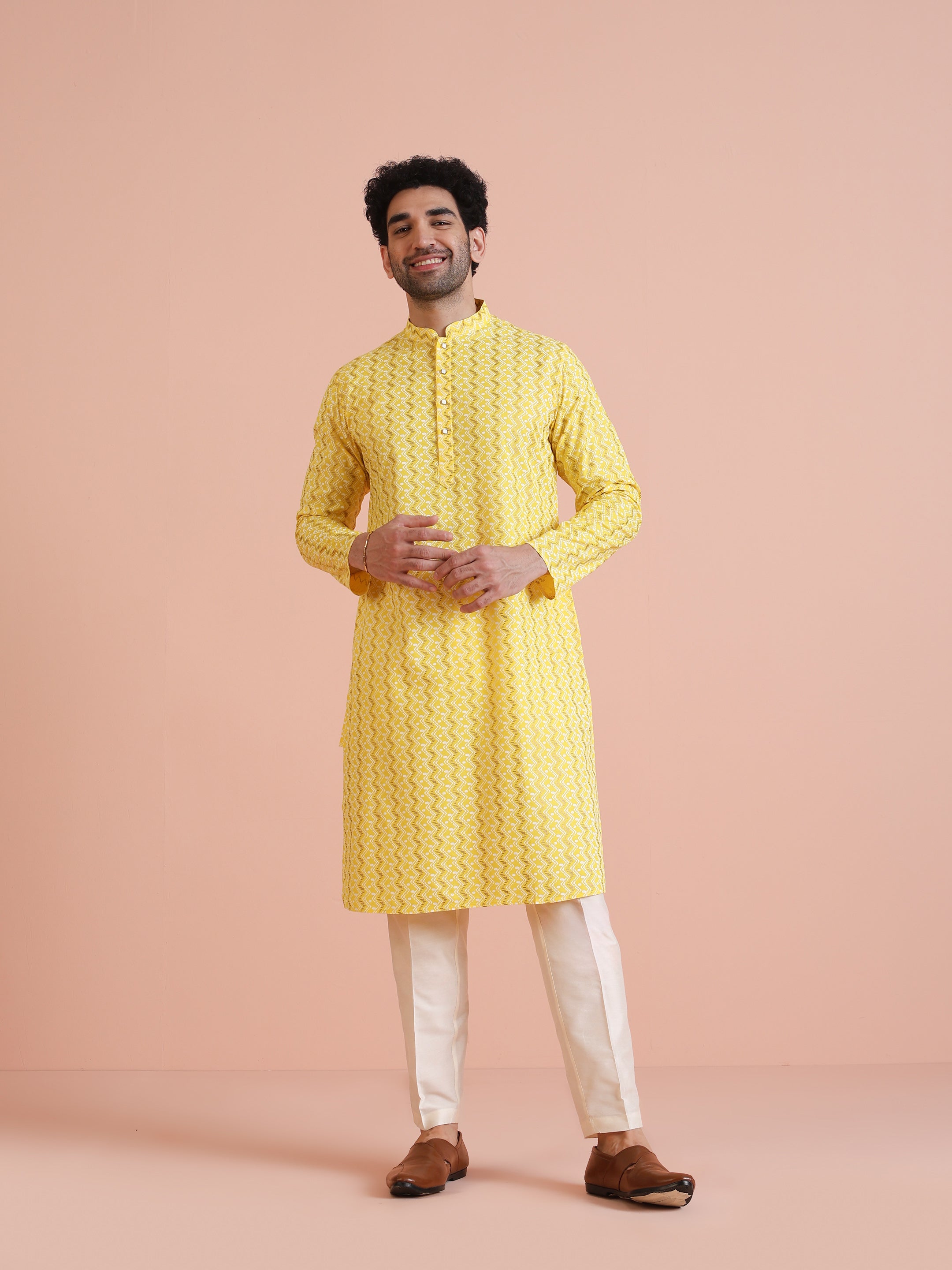 Make a statement with our Yellow Printed Kurta. Made from a soft cotton blend, this regular-fit kurta is perfect for any occasion, offering both comfort and style.