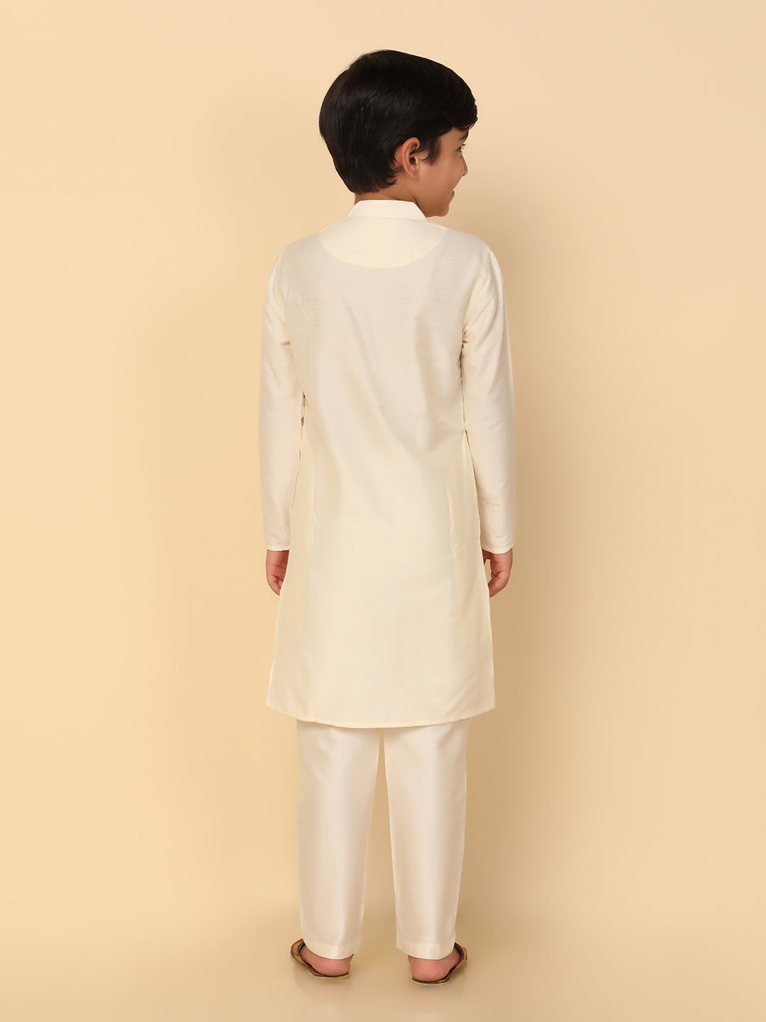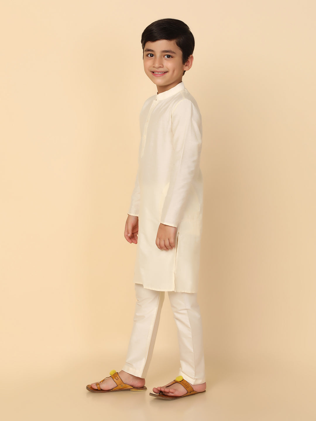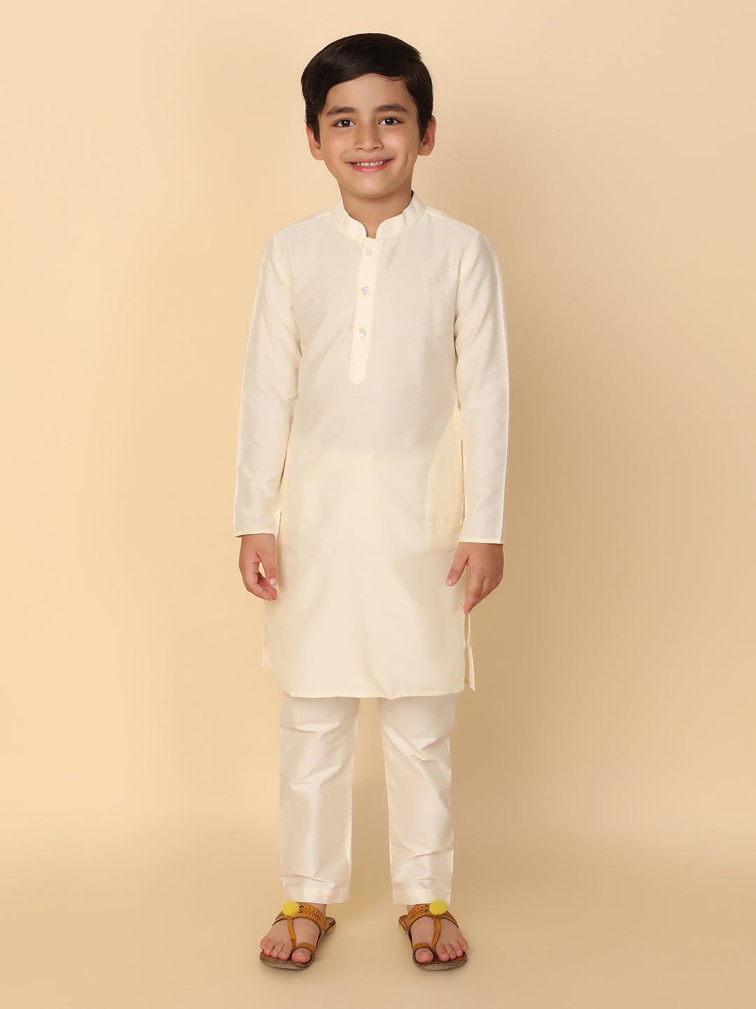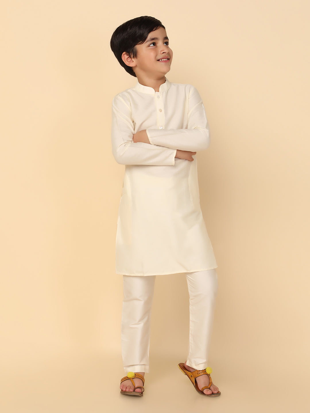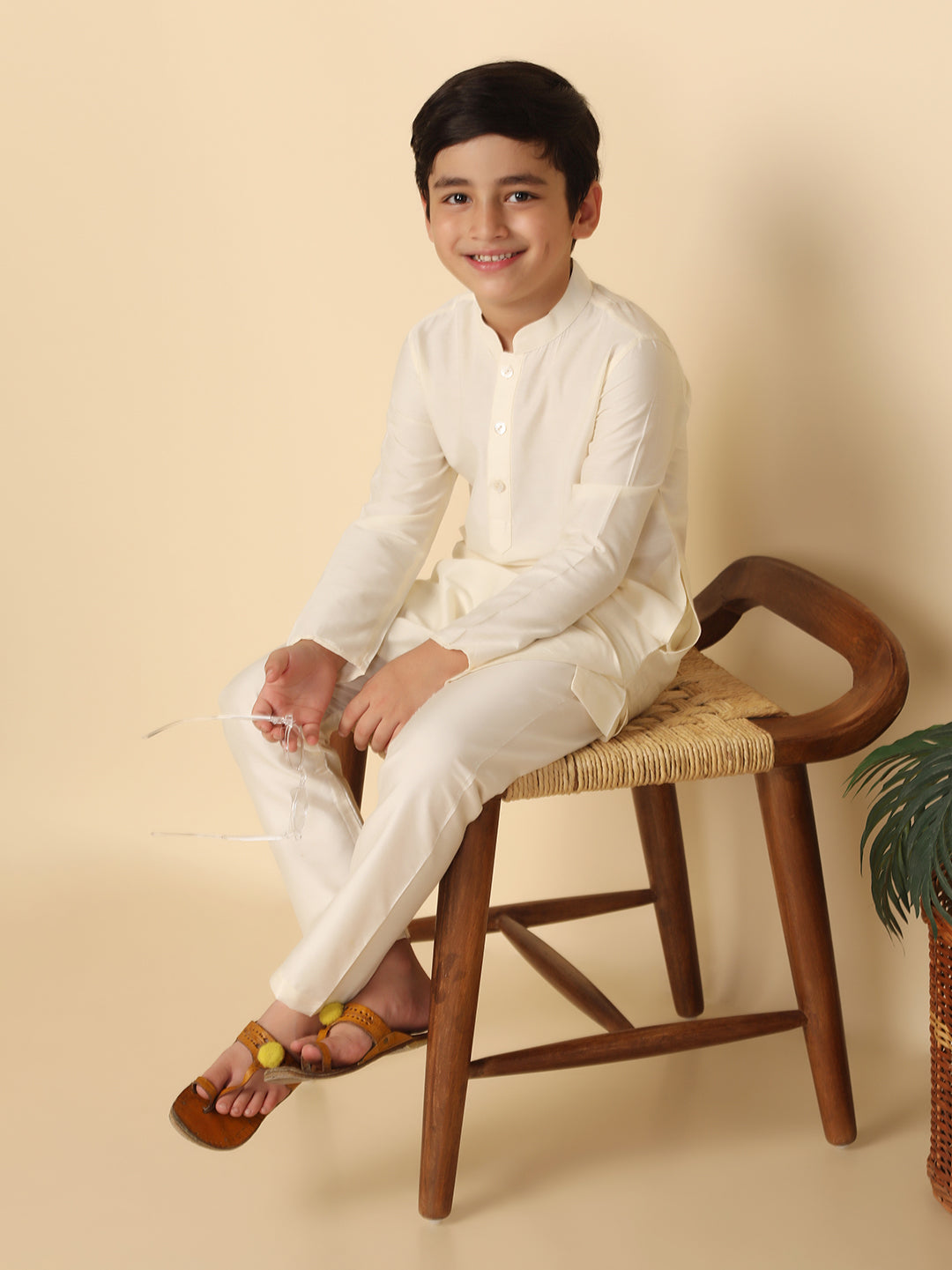 This Kurta Set is just perfect for festivals, or any kind off occasions. Its mandarin collar, style gives a charming look, this classic design is made from Cotton Blend fabric with Solid Dyed patterns and comes in Off White colours. Perfect for any occasion.