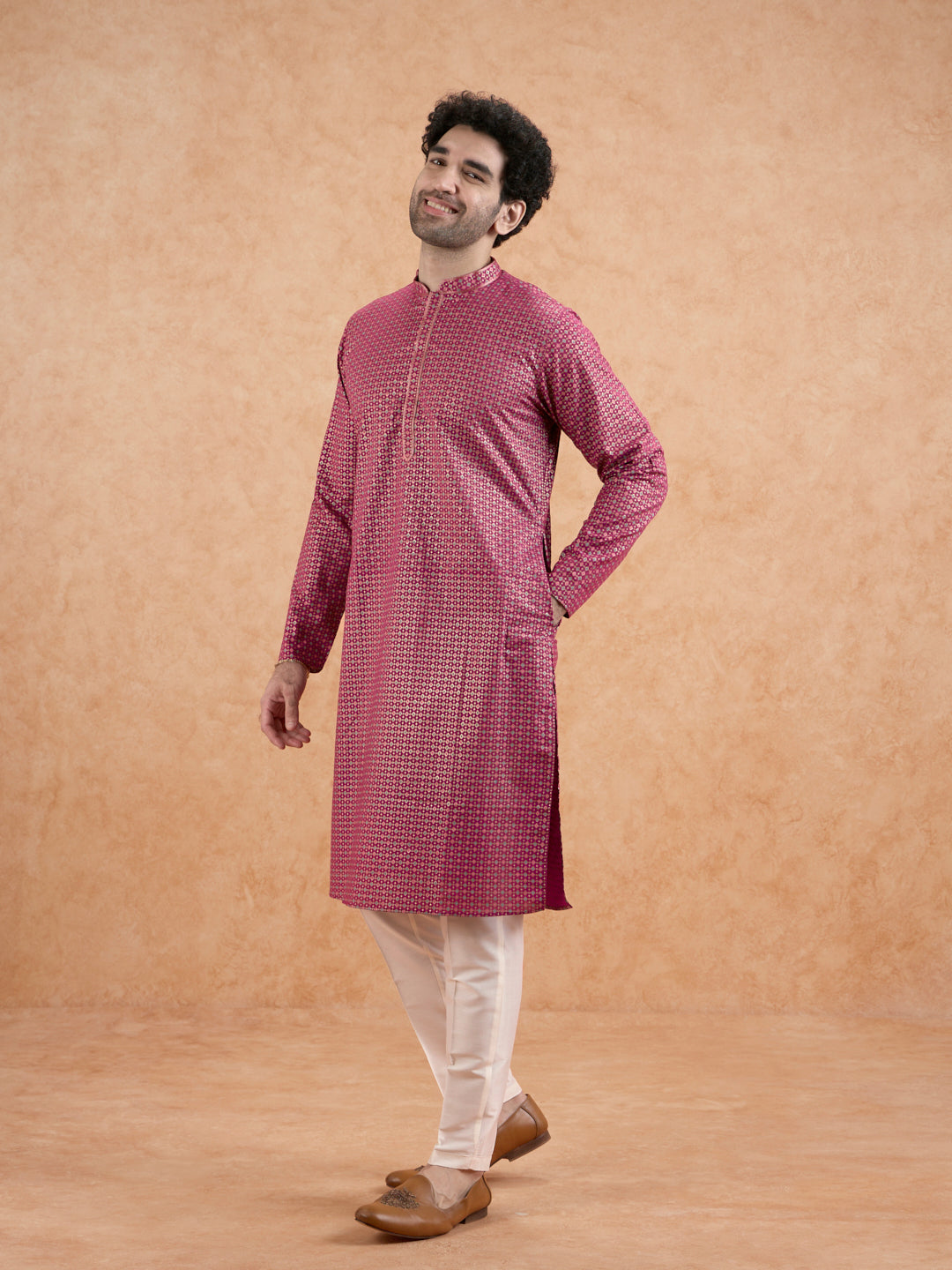 Magenta silk blend kurta trouser set rich self-weave design perfect for festive events, weddings, and celebrations.