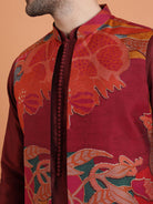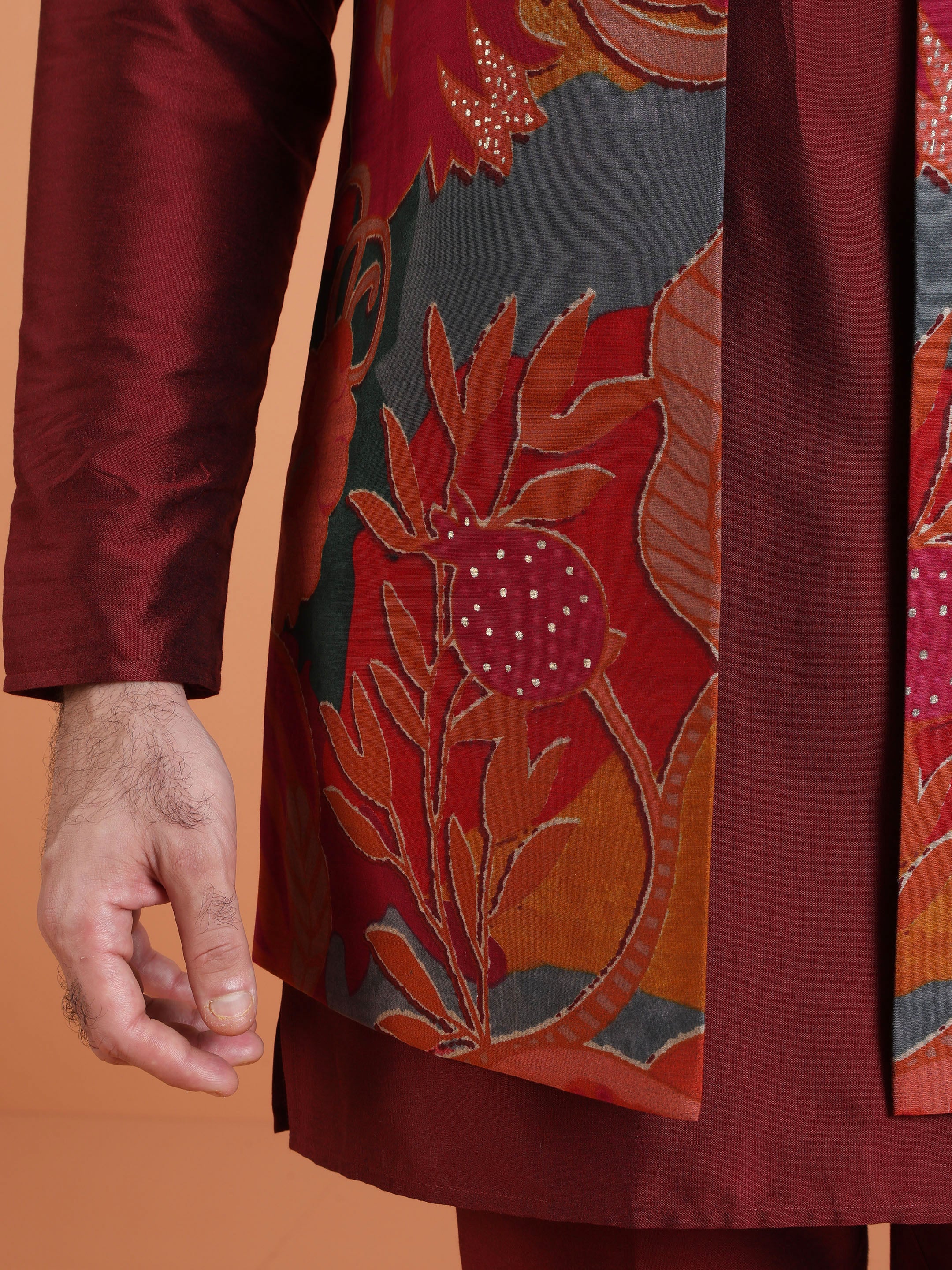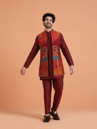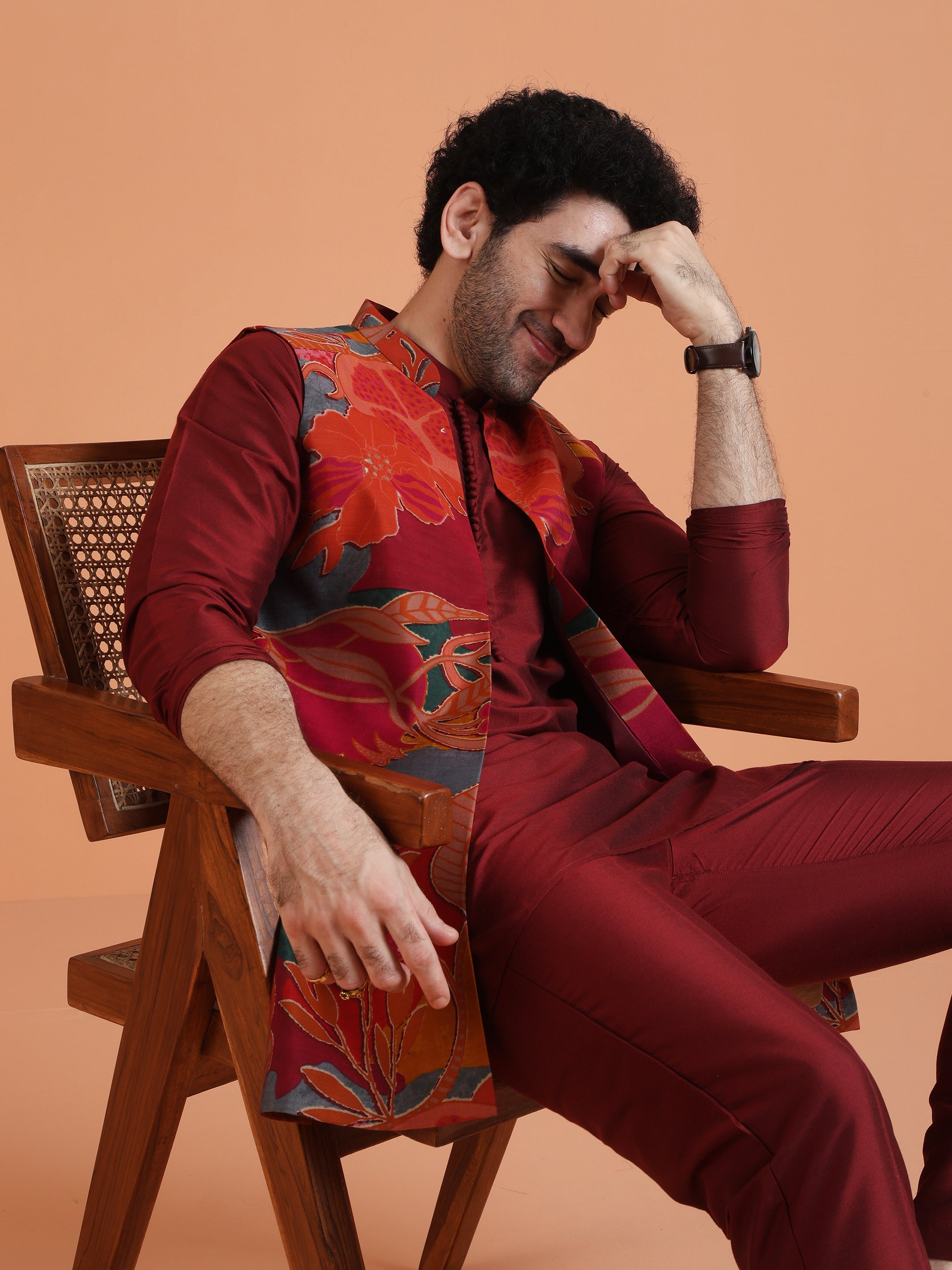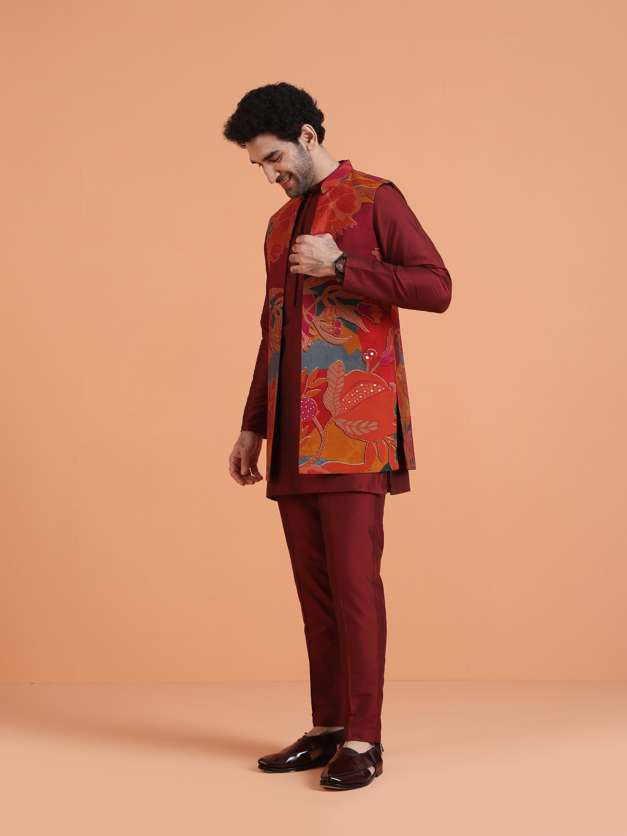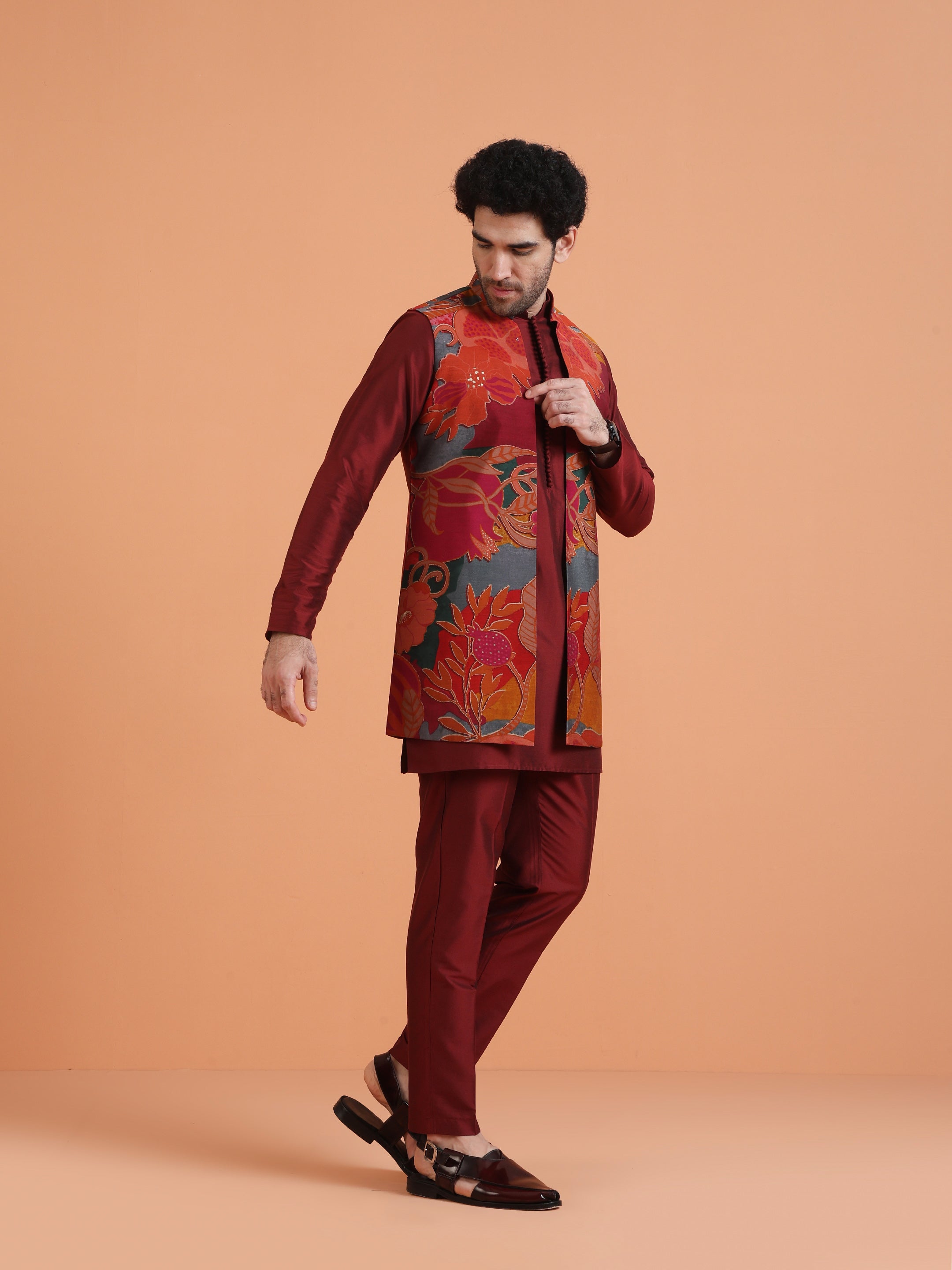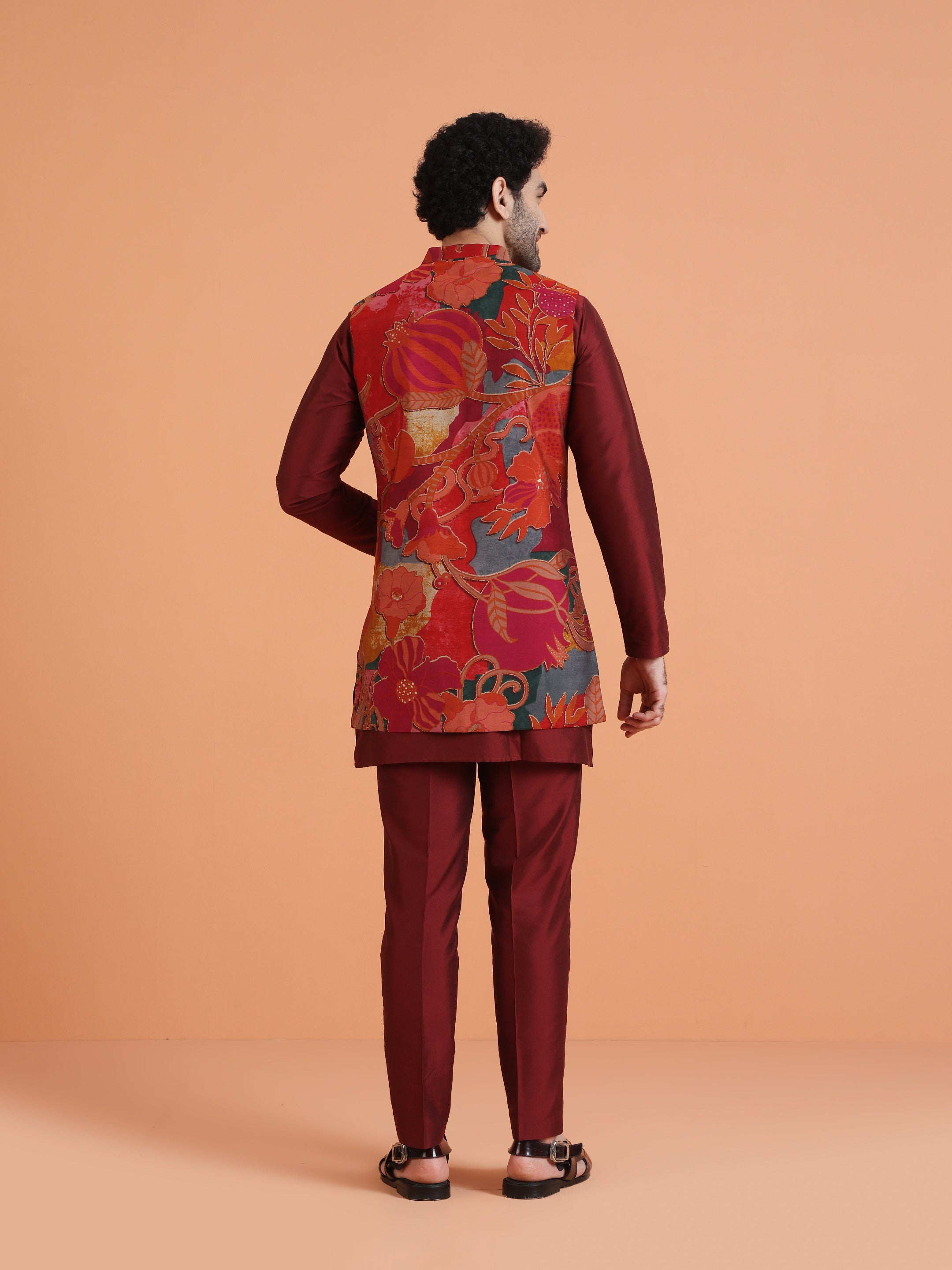 Maroon silk blend kurta trouser set with multicolor velvet appliqué floral long jacket. Ideal festive wear for weddings, sangeet & cocktails.