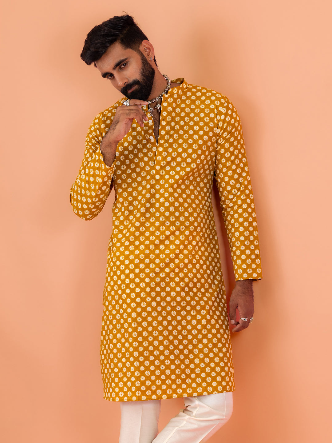 Experience classic elegance with this Men Mustard Tie & Dye Printed Only Kurta. The Printed Pattern adds a refined touch, while the breathable Cotton Blend fabric ensures comfort throughout the day. Ideal for festive events or casual wear, this Kurta is a wardrobe essential.