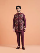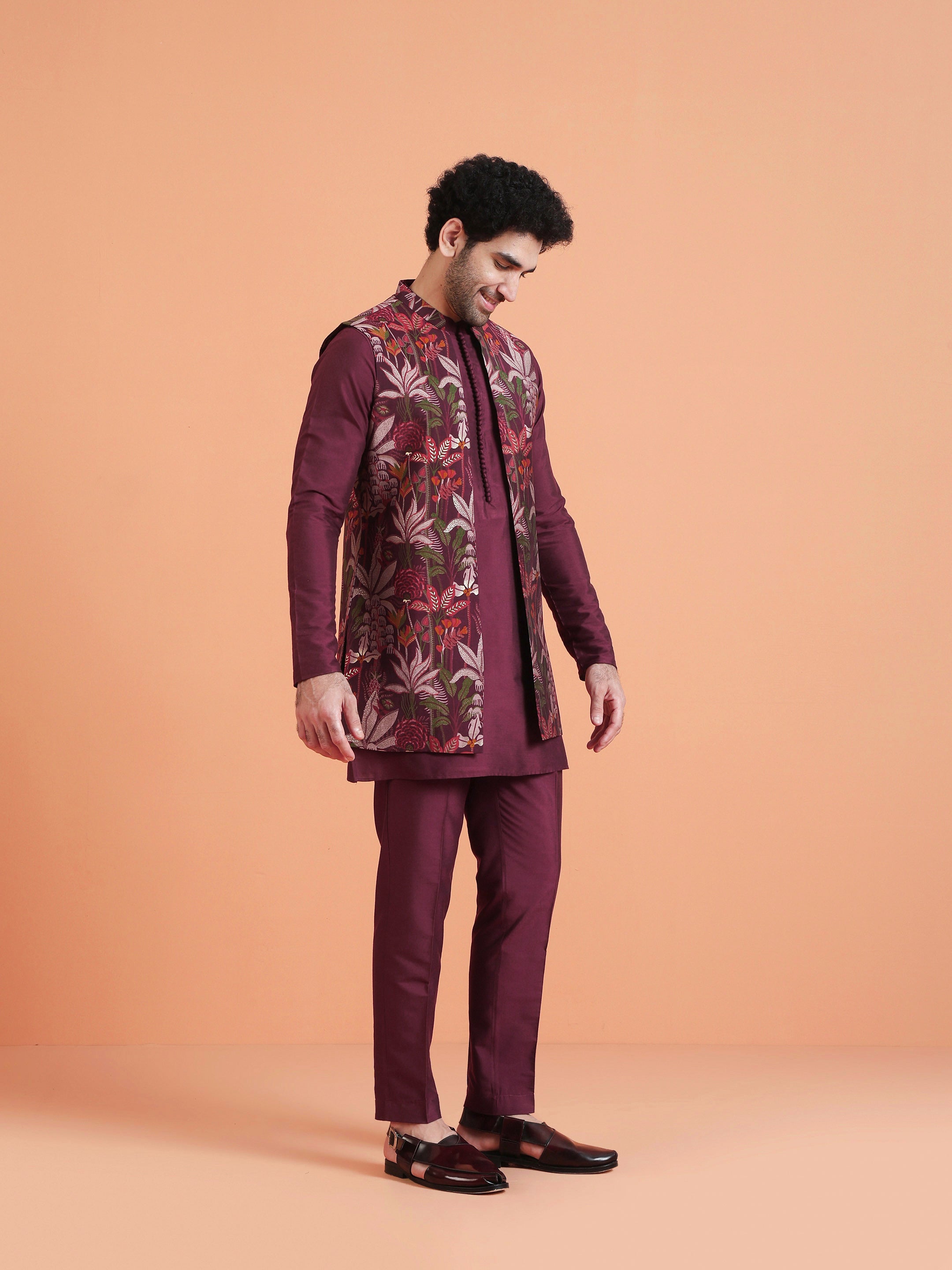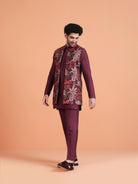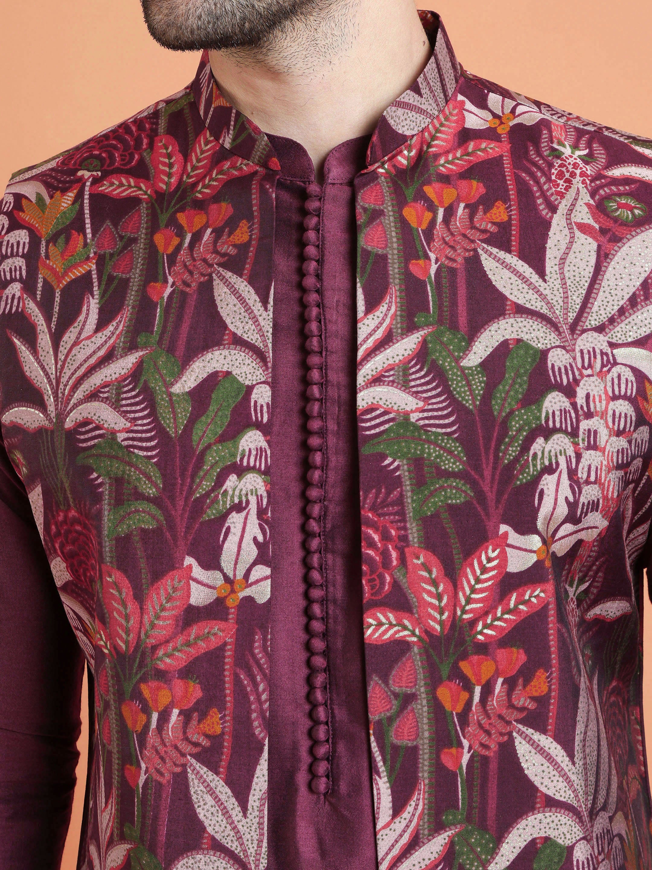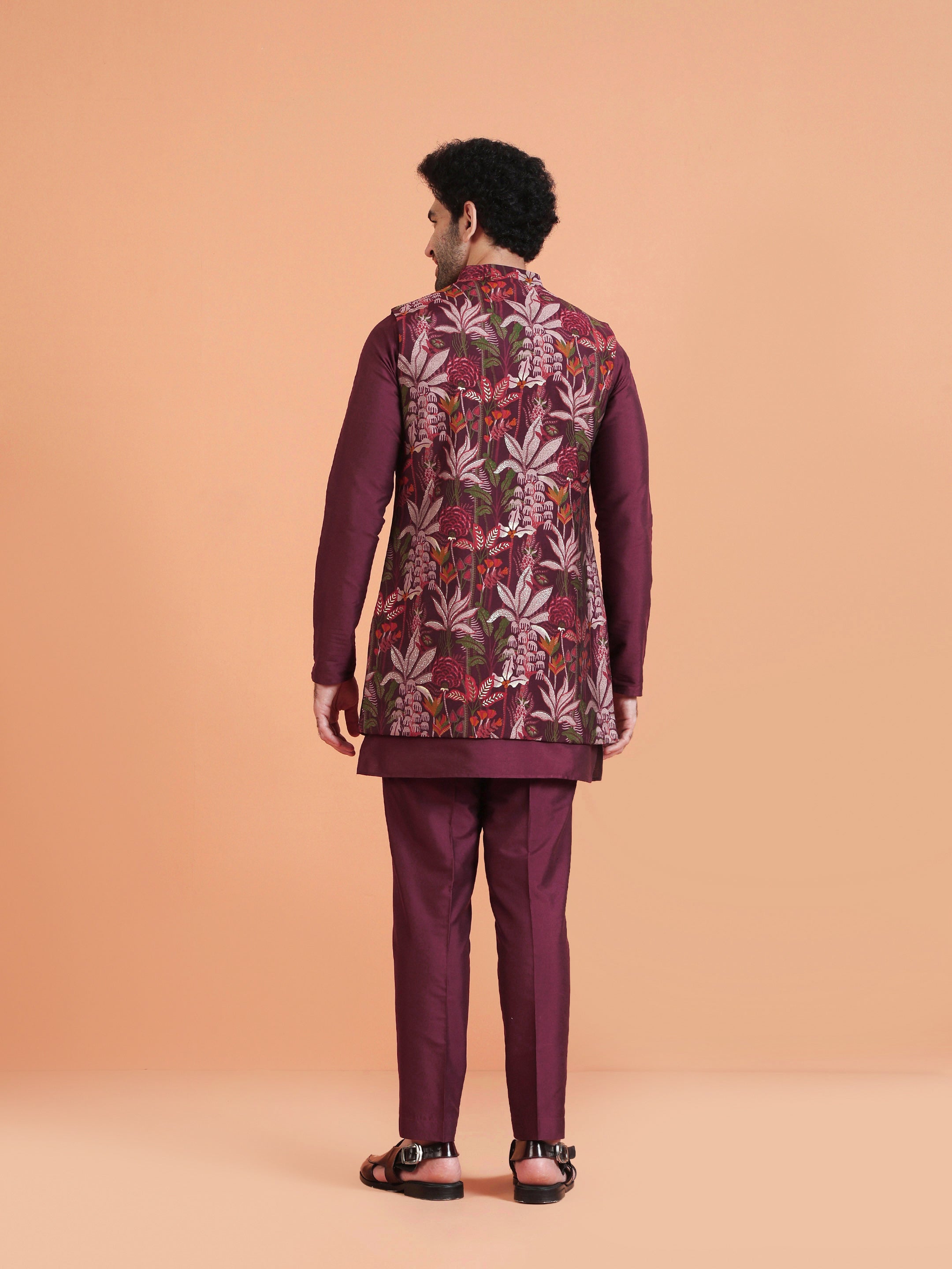 Maroon Silk Blend Floral Printed Long Jacket Set