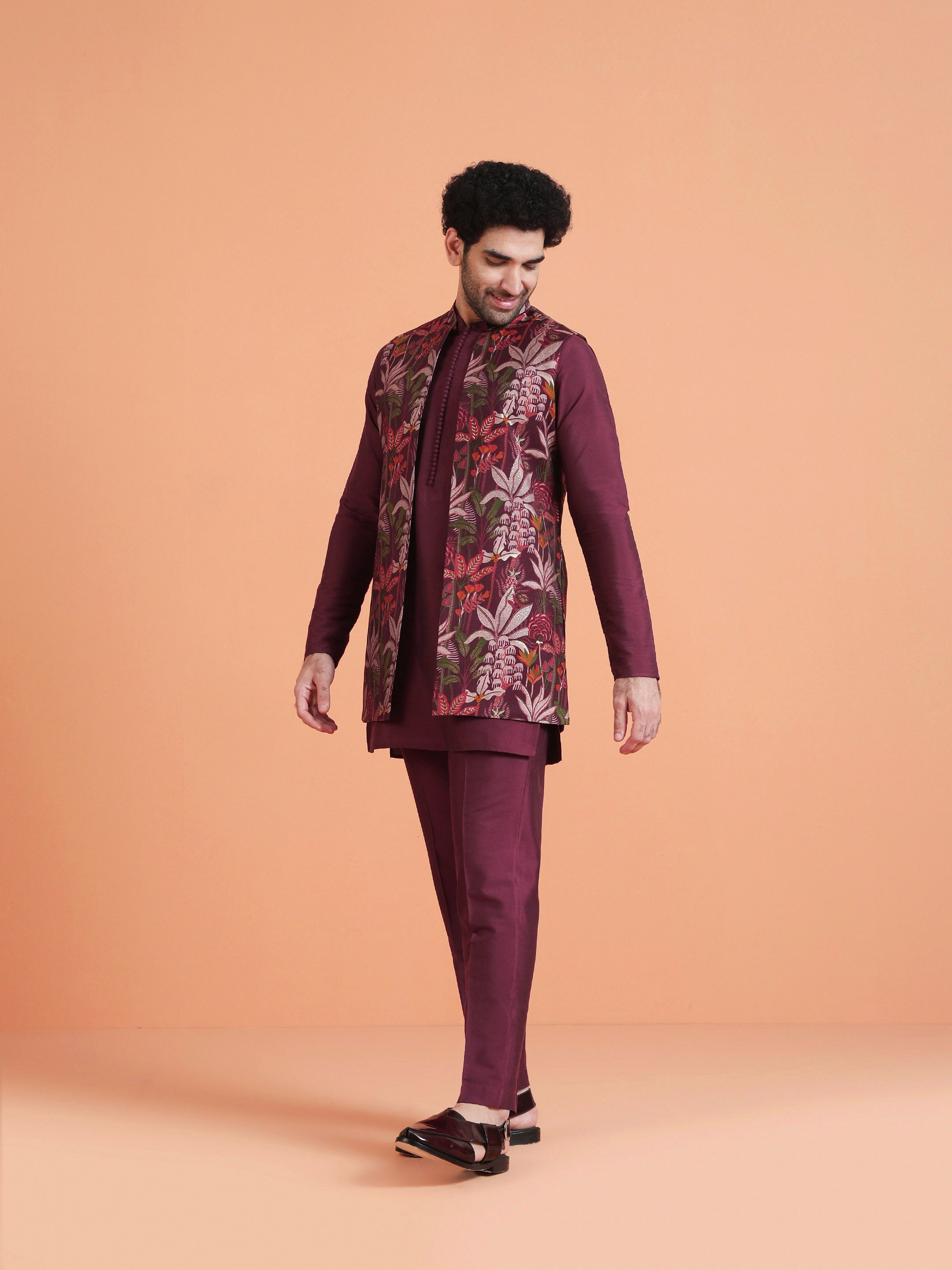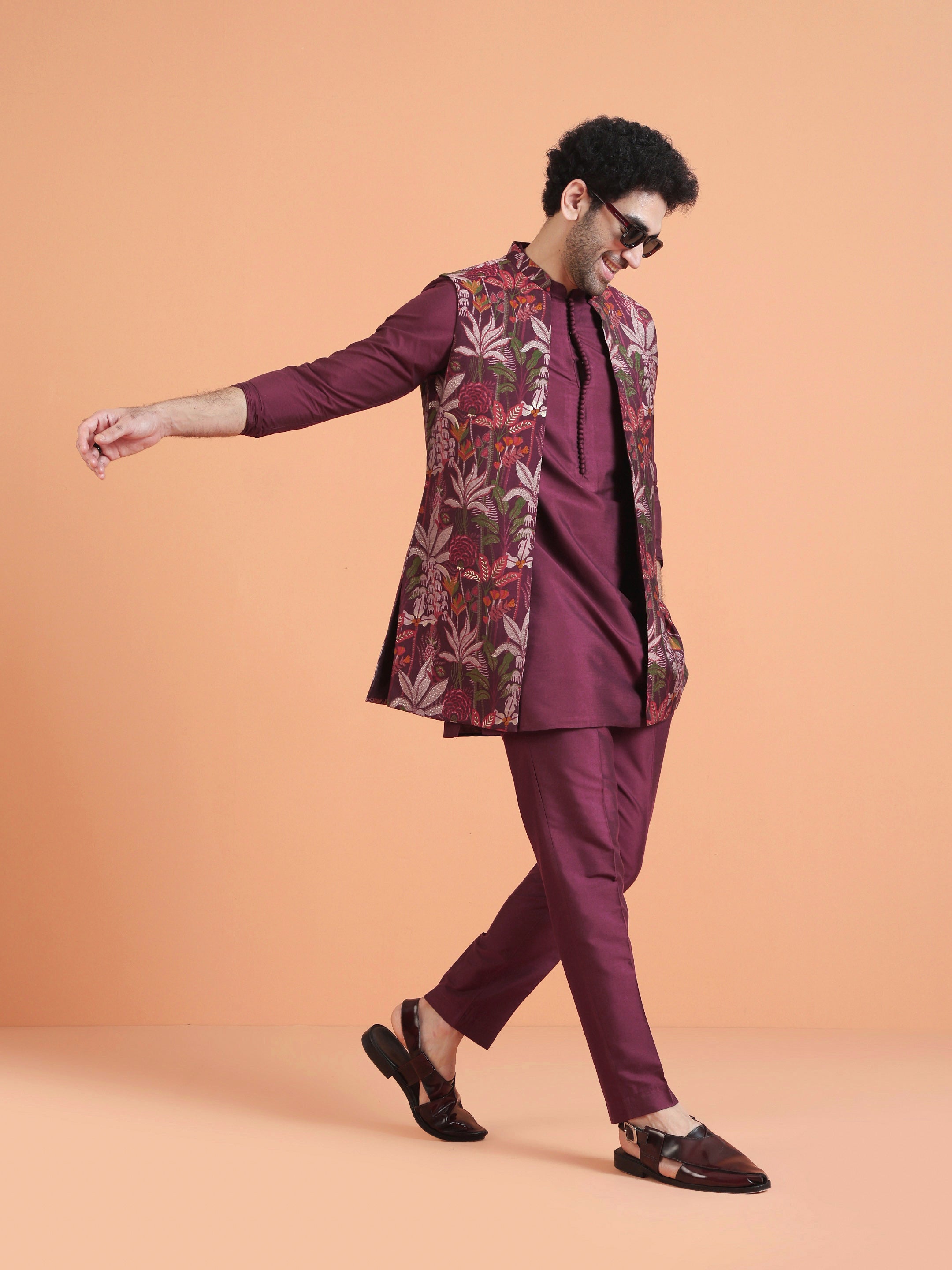 MultiColor Modal Chanderi Printed Mid Kurta Front Open Long Jacket Trouser Set, Perfect festive ethnic wear for men, ideal festive and casual occasions.