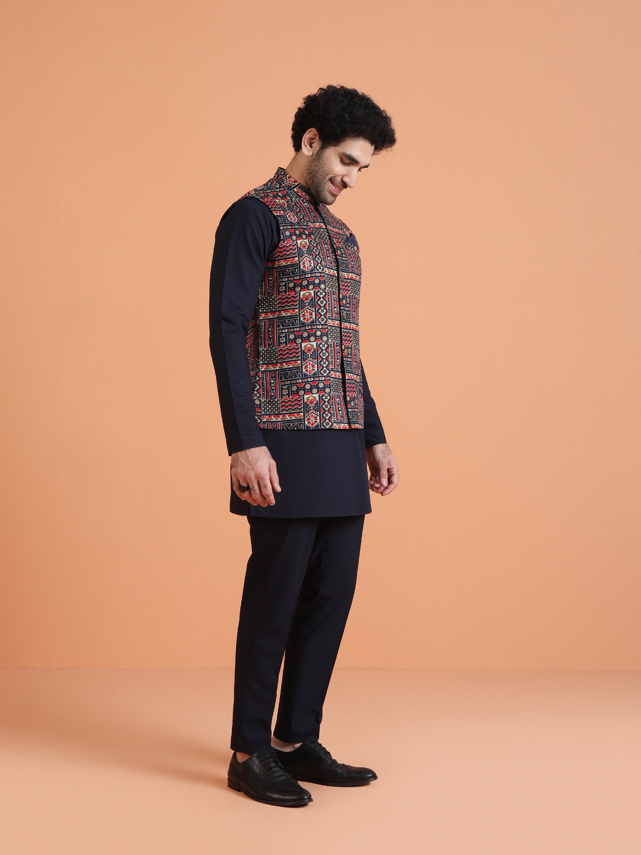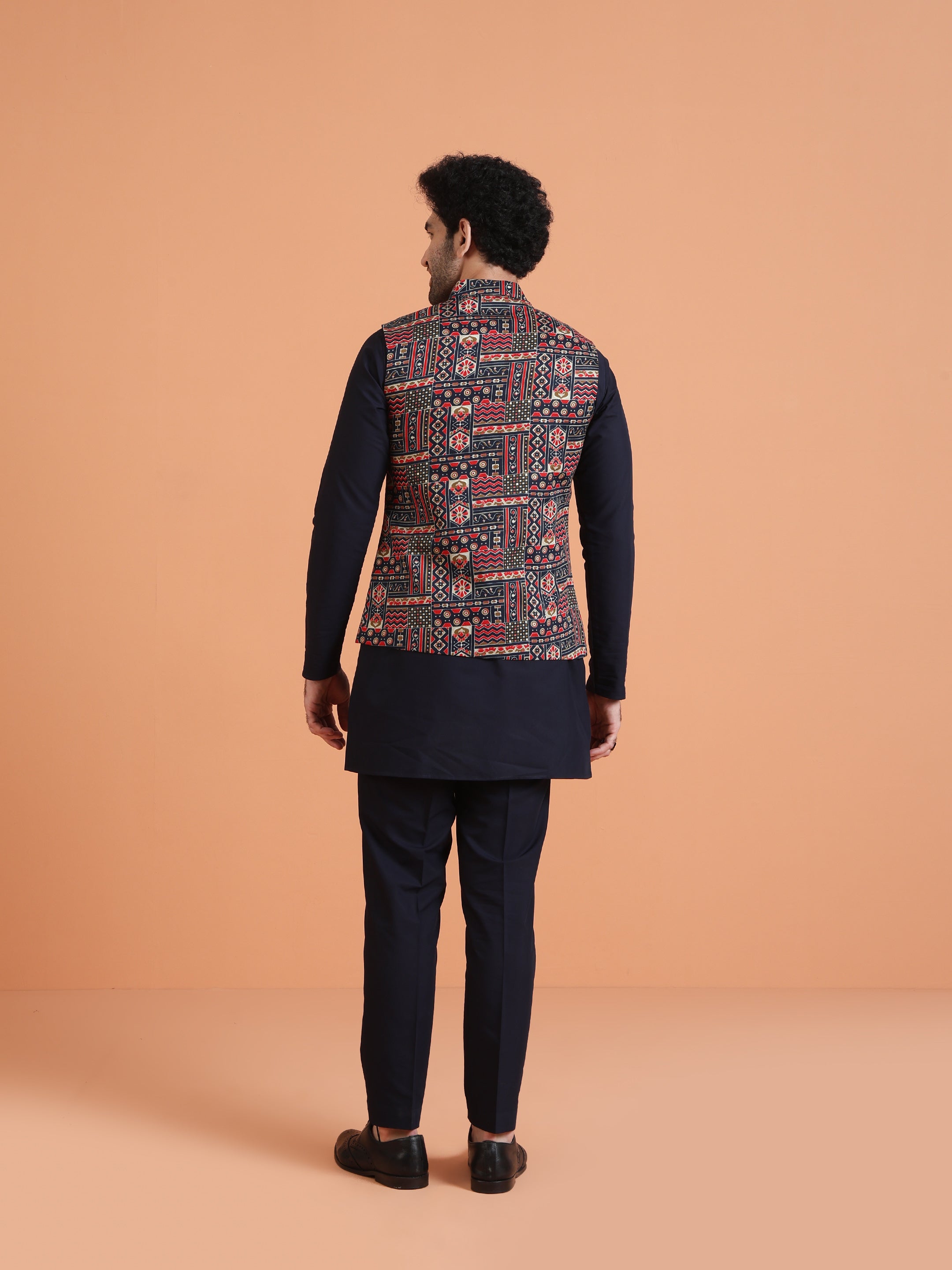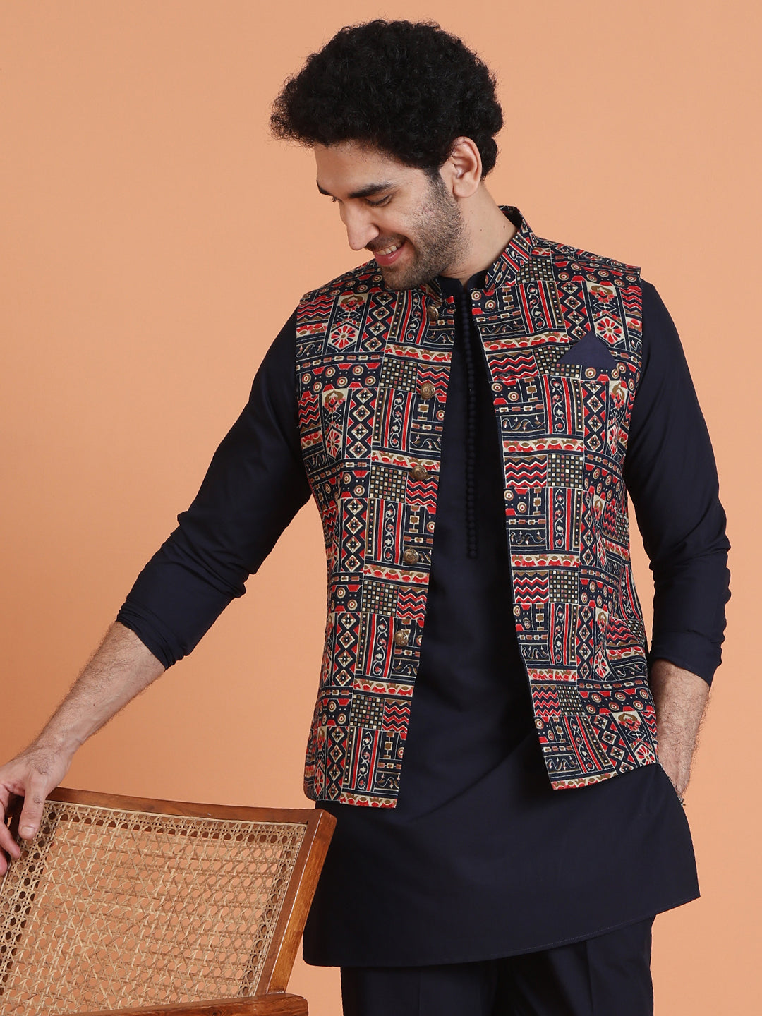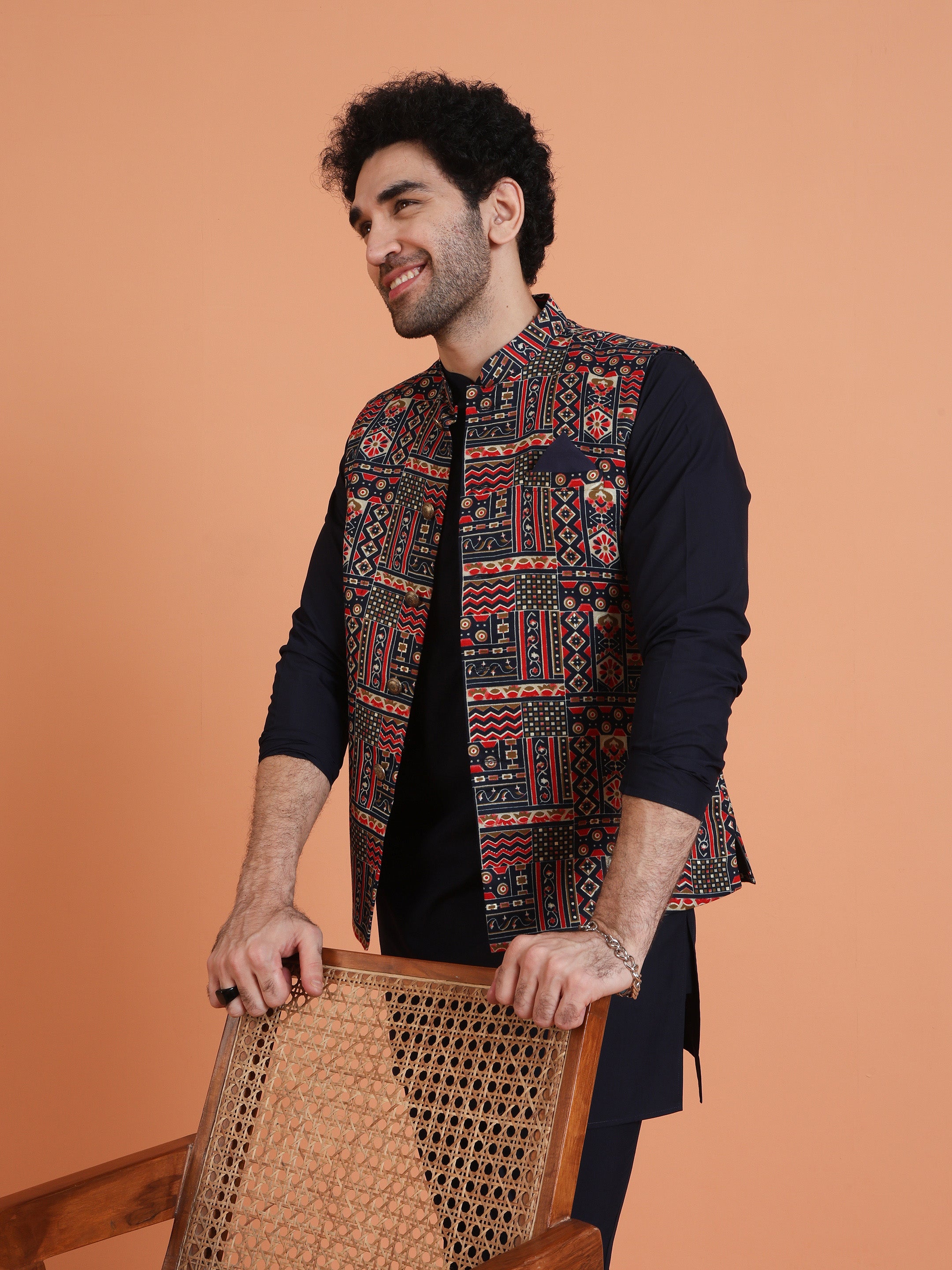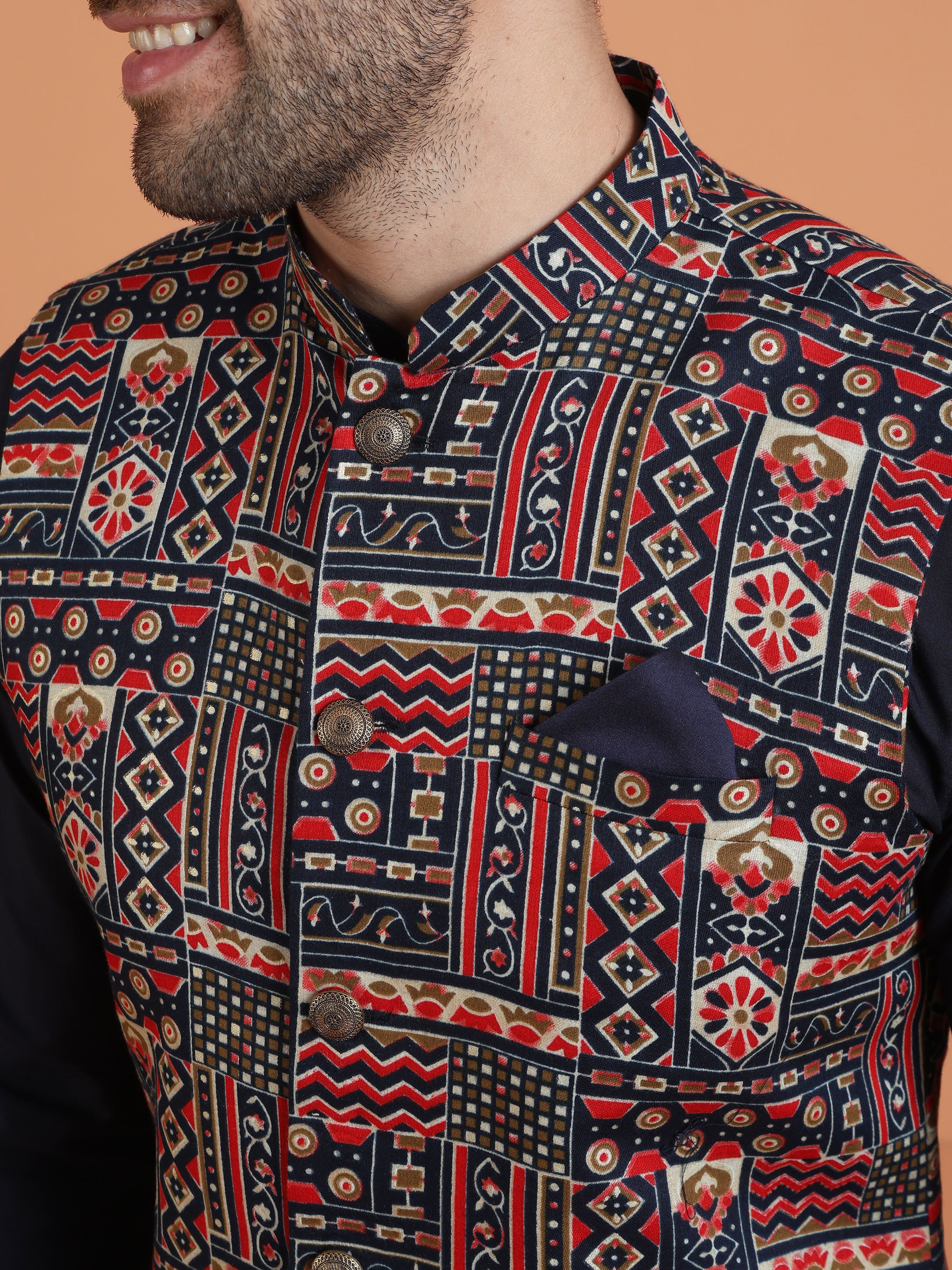 Kisah multicolor cotton silk Nehru jacket with geometric ethnic motifs. Stylish printed jacket for layering over kurta at weddings & festive occasions.