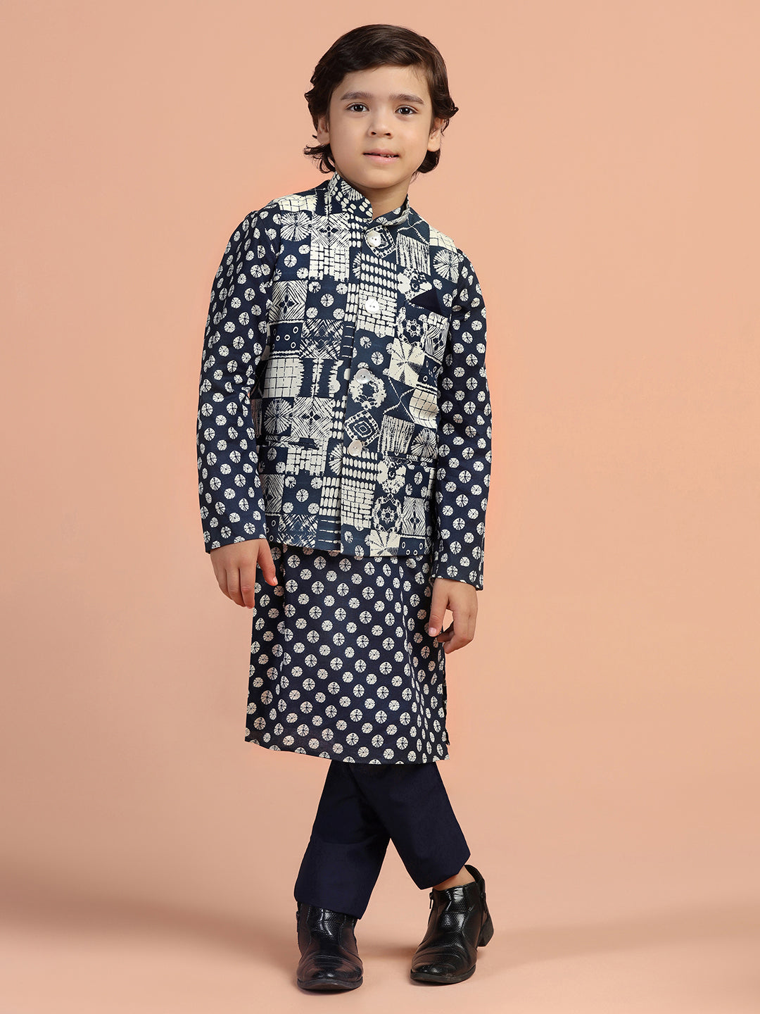 Navy blue printed cotton kurta jacket pyjama set for boys — stylish, breathable, and perfect for weddings or festive celebrations.