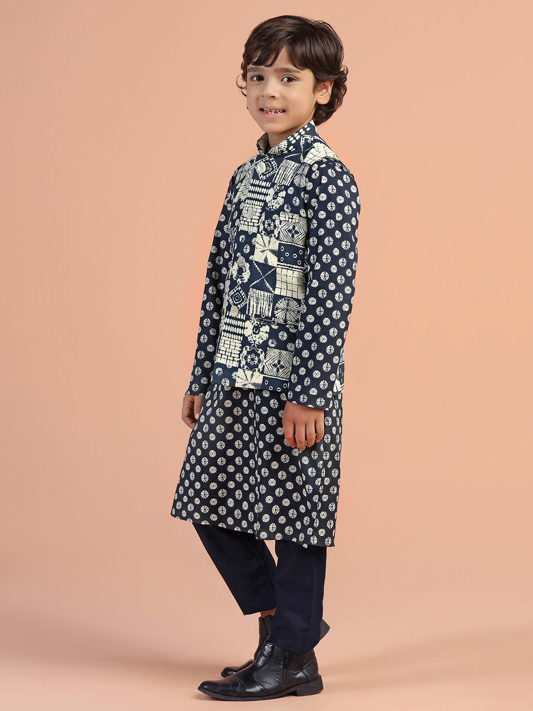 Navy Printed Kids Kurta Jacket Set