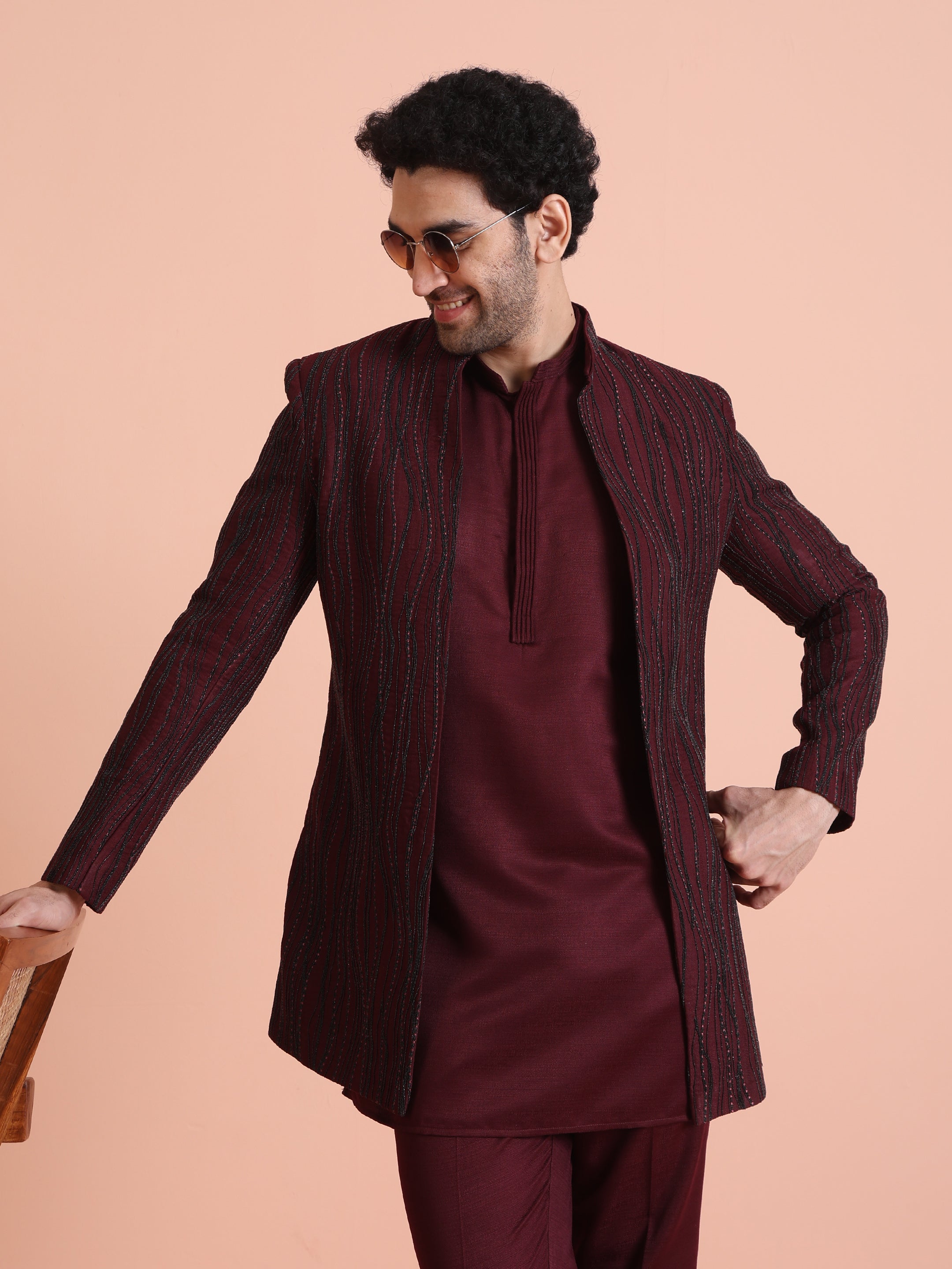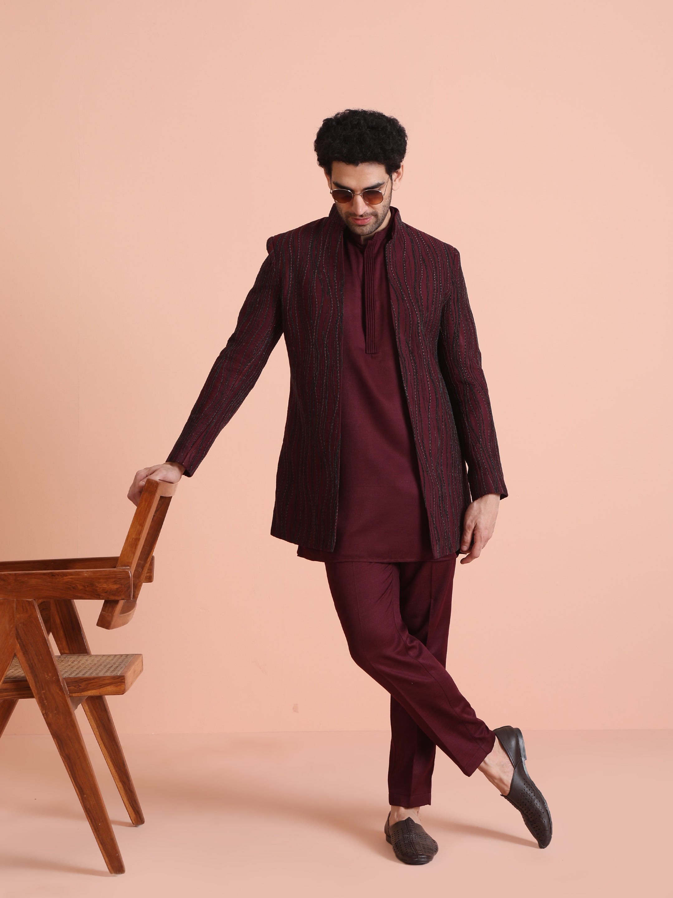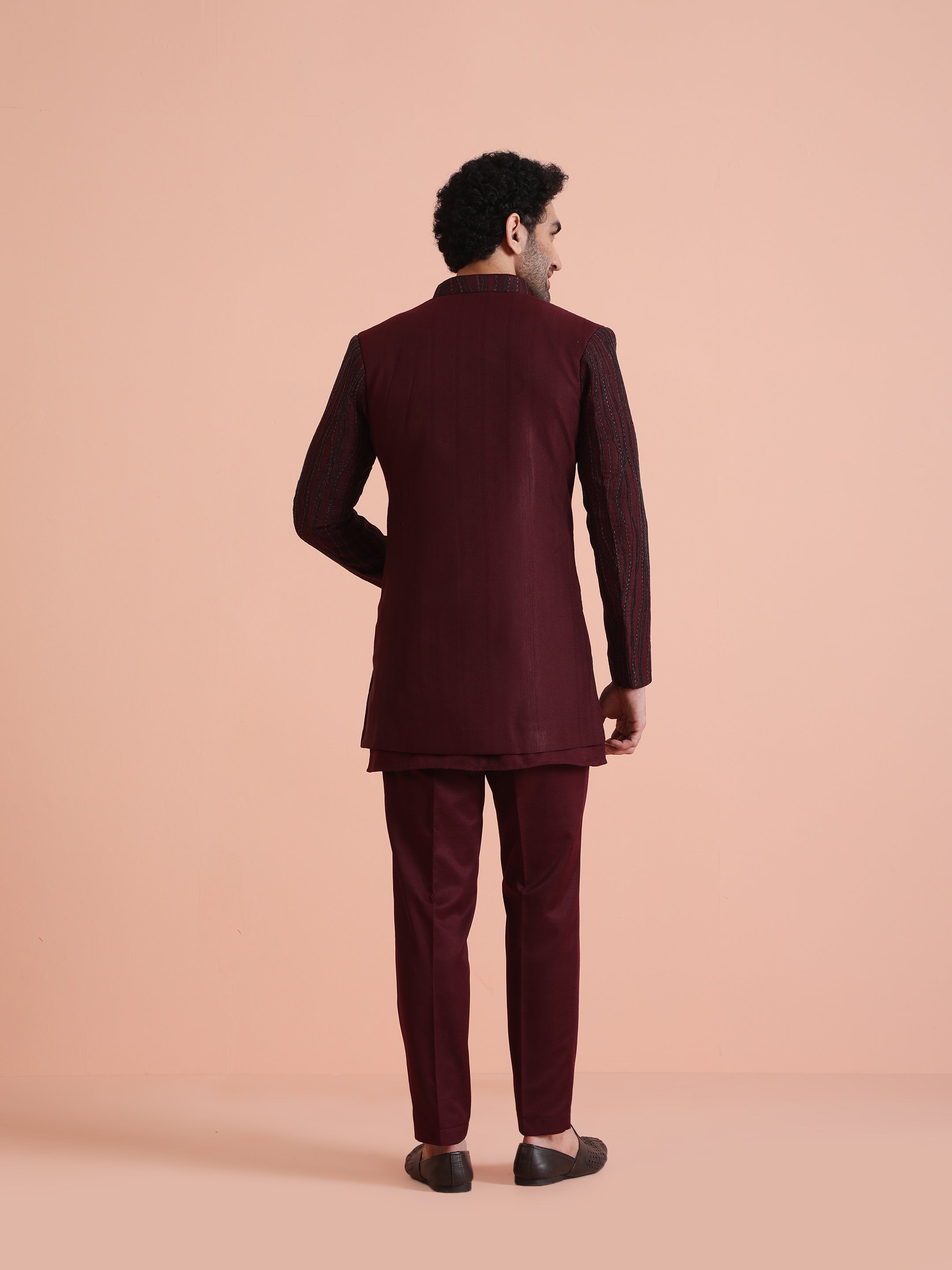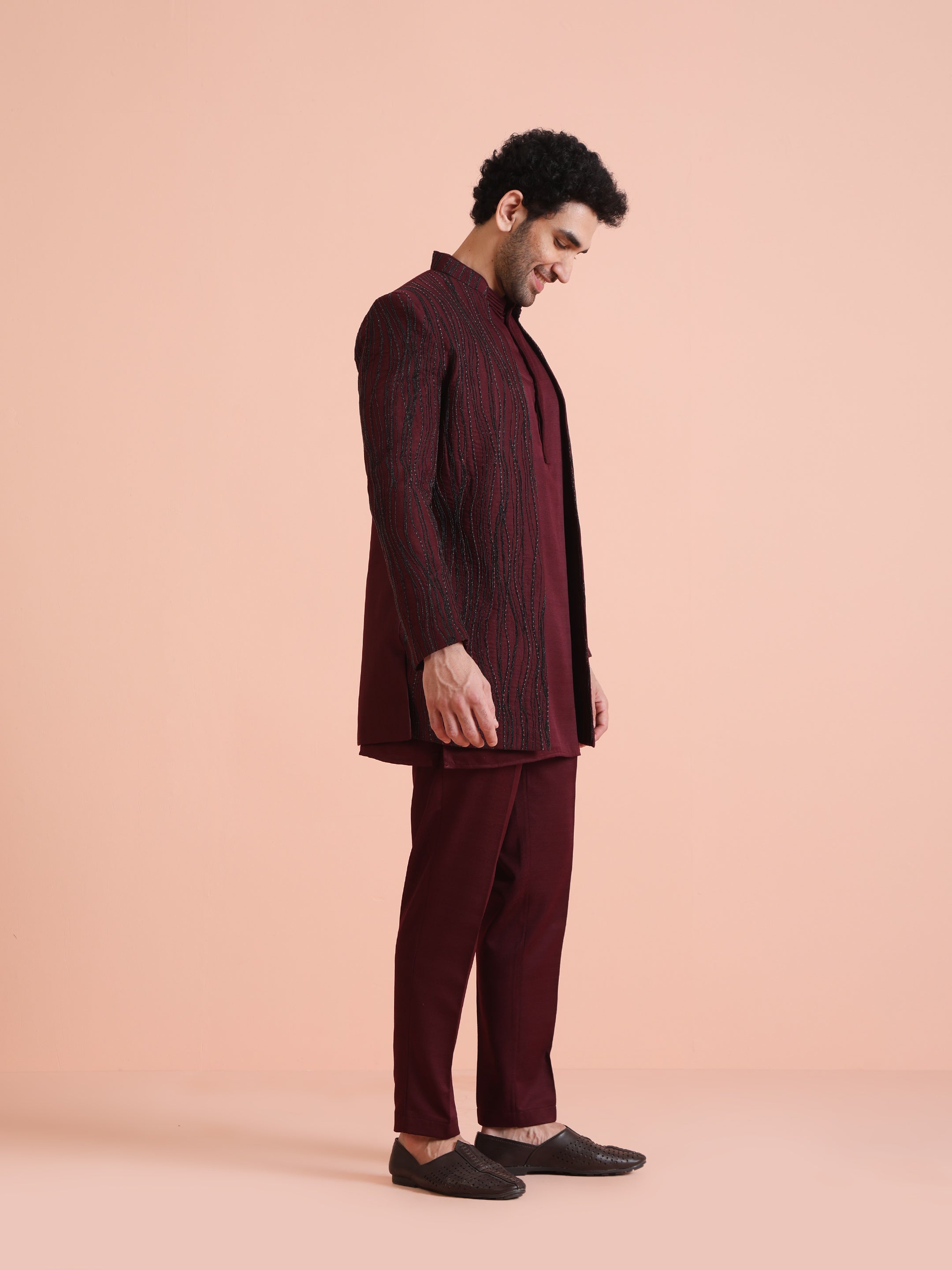 Wine double-layer short sherwani kurta trouser set with black bead embellishments—perfect for weddings, receptions, and festive occasions.