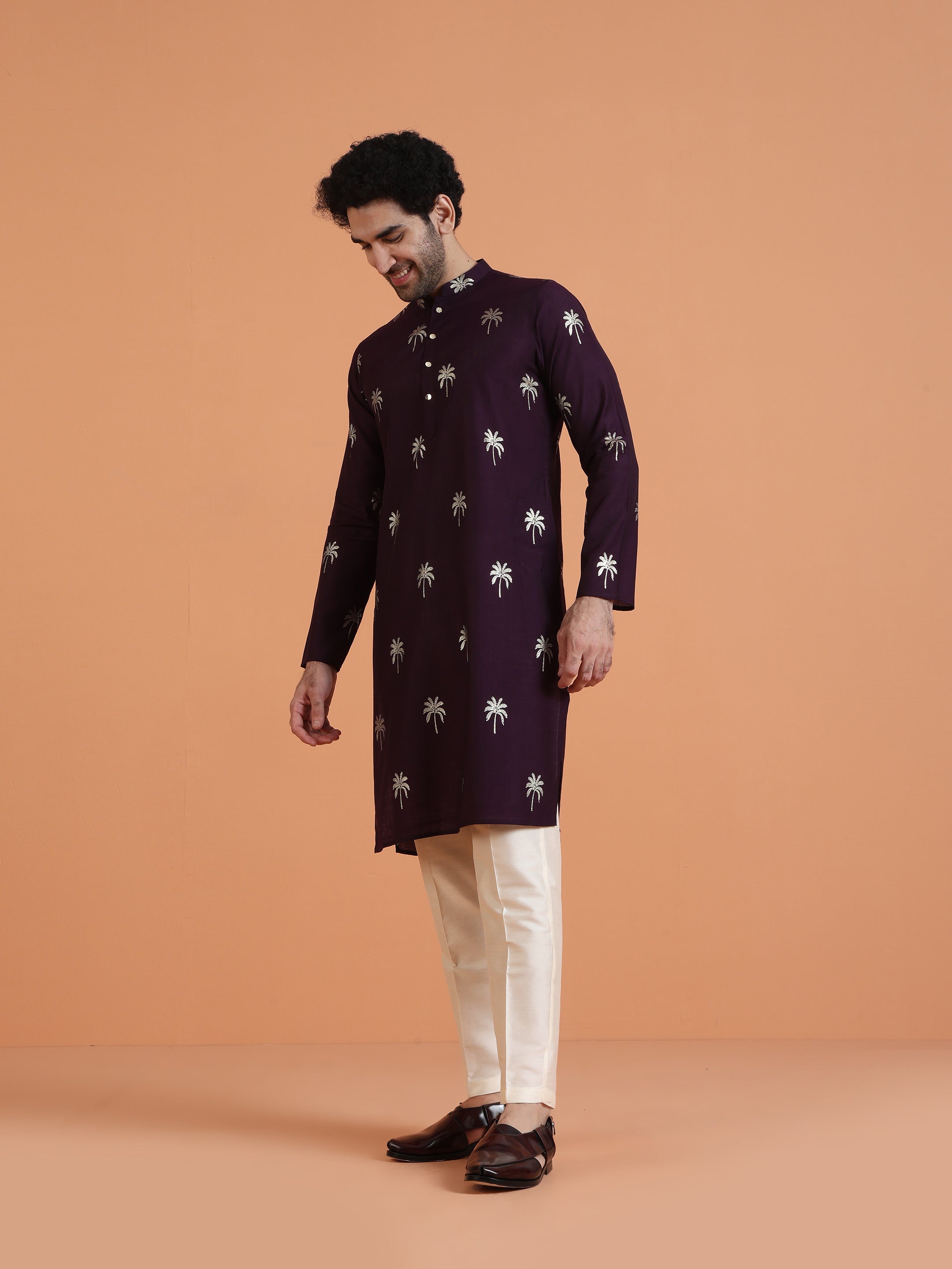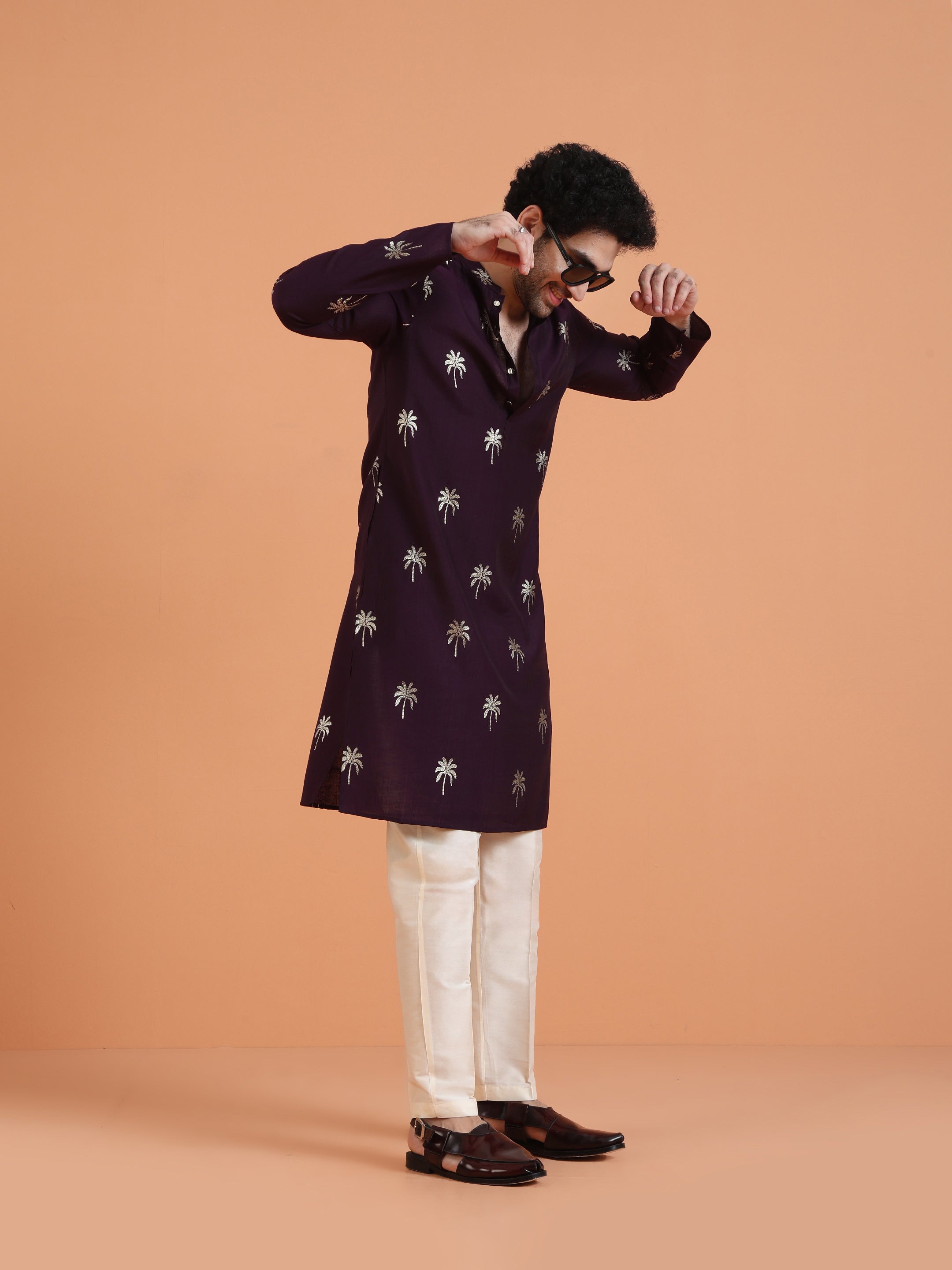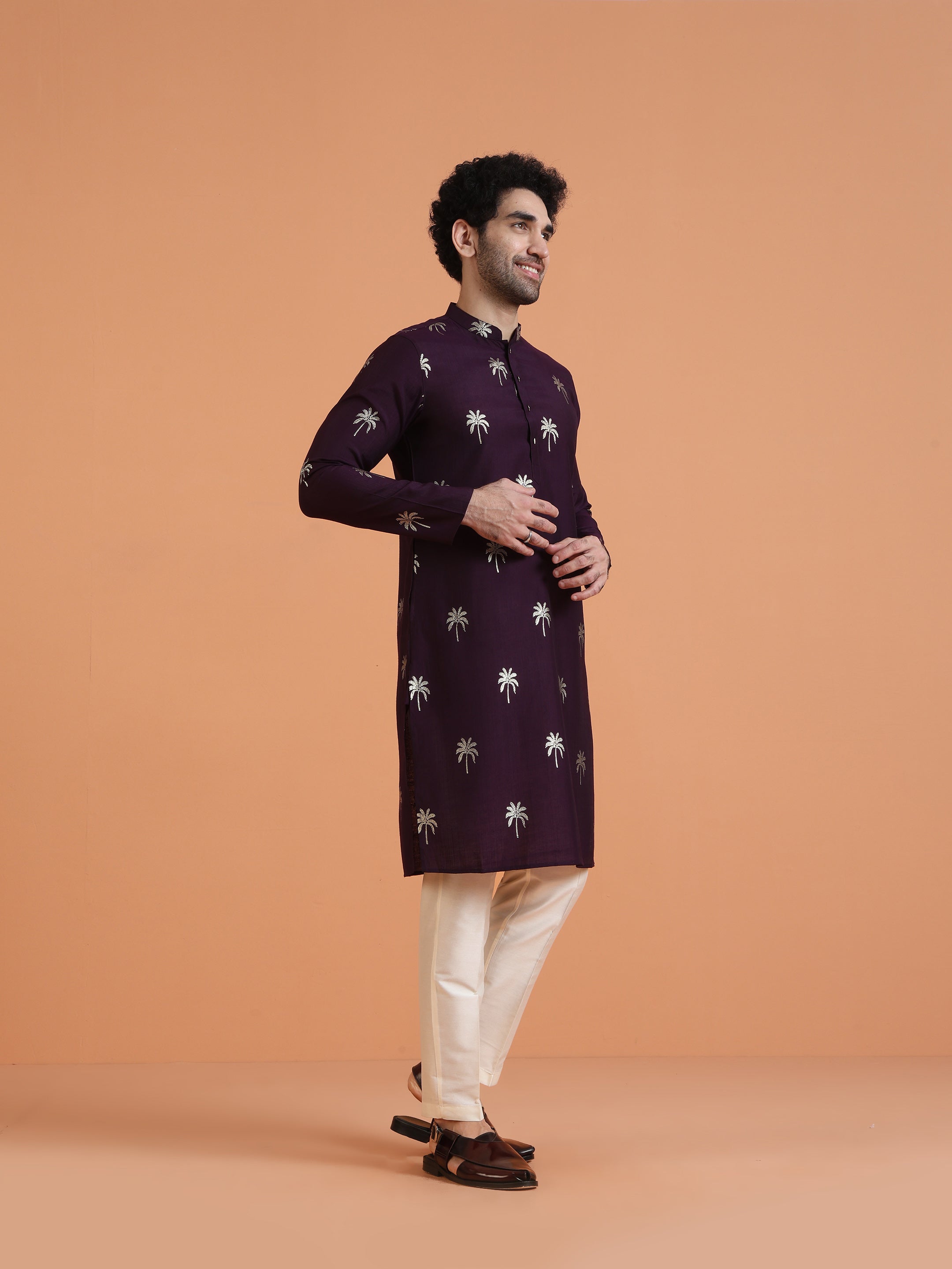 Kisah Wine Embroidered Kurta with Cream Trouser Set in silk blend with functional side pockets. Perfect festive wear for weddings and celebrations.